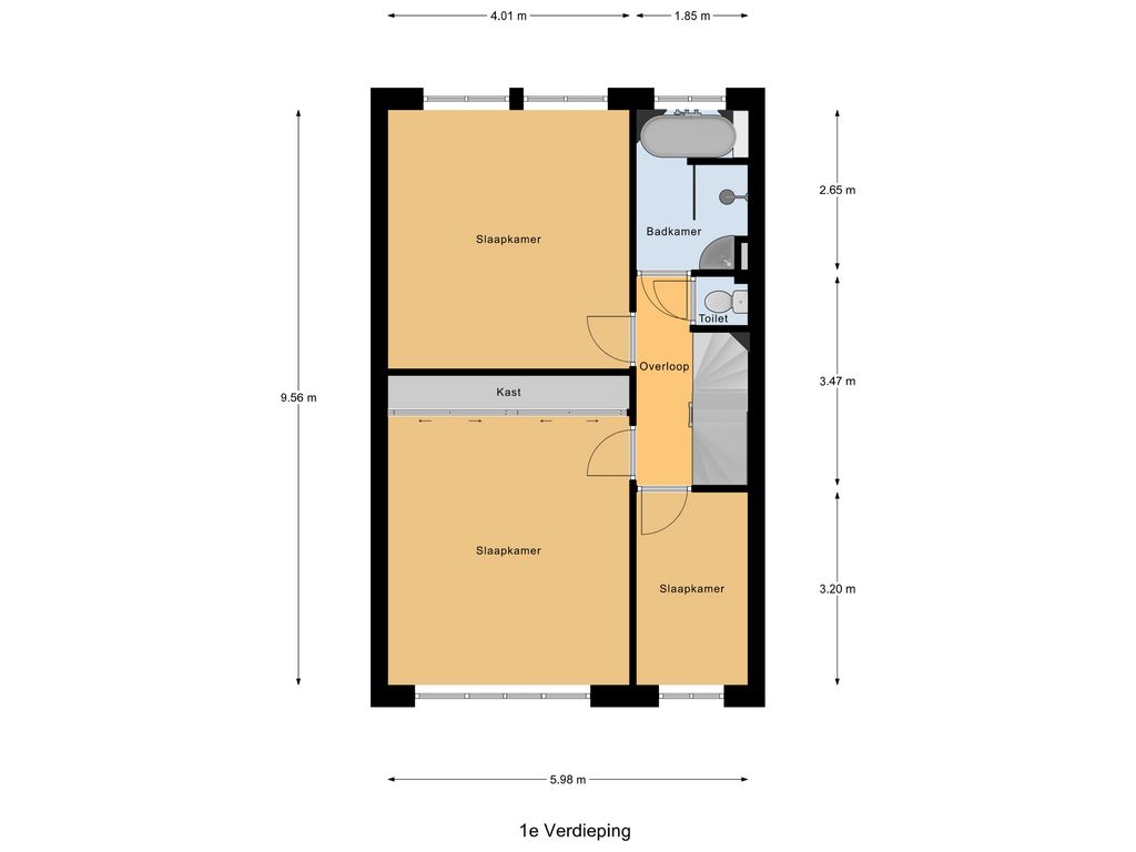 Via de trap komen we op de eerste verdieping. Hier treffen we een drietal kamers. De hoofdslaapkamer aan de achterzijde van ca. 17 m² is heerlijk licht door de grote ramen aan de achterzijde. Er is ruimte genoeg voor een groot tweepersoonsbed en een grote kledingkast. De shutters geven de ruimte extra veel sfeer!