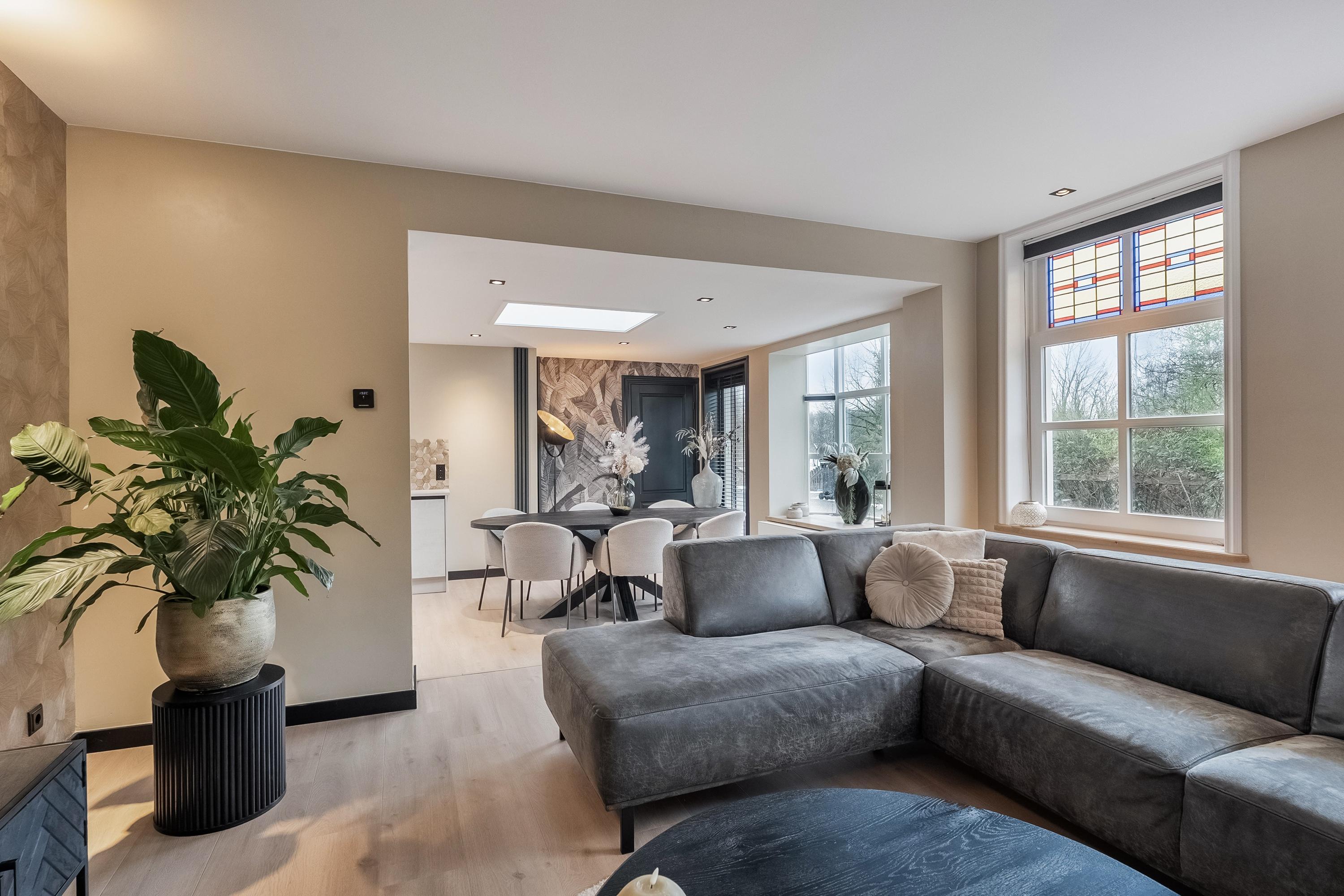 De sfeervolle living biedt uitzicht op de dijk en is afgewerkt met een nieuwe laminaatvloer (2023) met vloerverwarming, glad gestucte wanden en deels luxe behang. De vele ramen met glas-in-lood zorgen voor een prachtige lichtinval. Tevens is hier airconditioning aanwezig. Via een speels niveauverschil bereikt u de keuken en eetkamer.