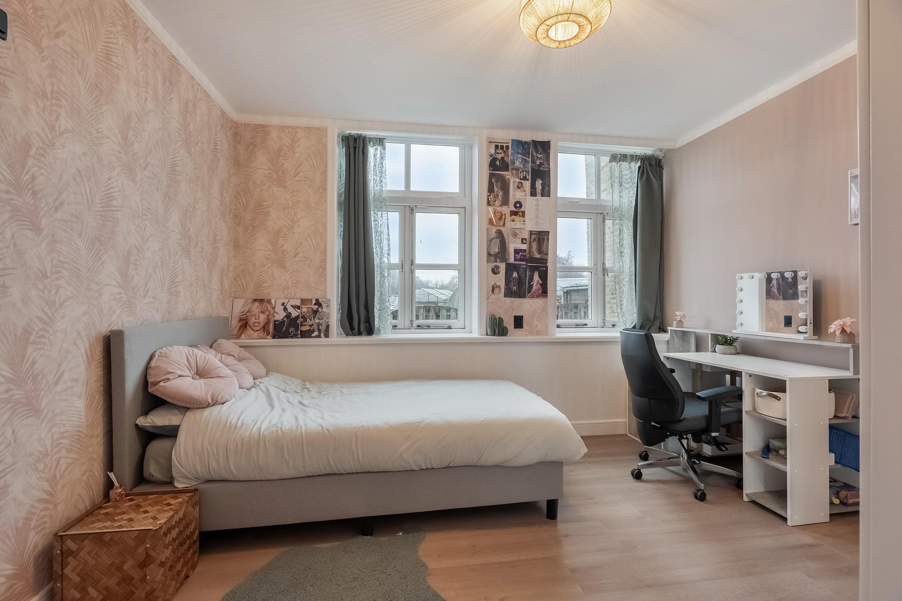 Slaapkamer 1 bevindt zich aan de achterzijde van de woning en is bereikbaar vanuit de binnenhal. Deze kamer is voorzien van een laminaatvloer met vloerverwarming, glad gestucte wanden en grote raampartijen met uitzicht op de omgeving.