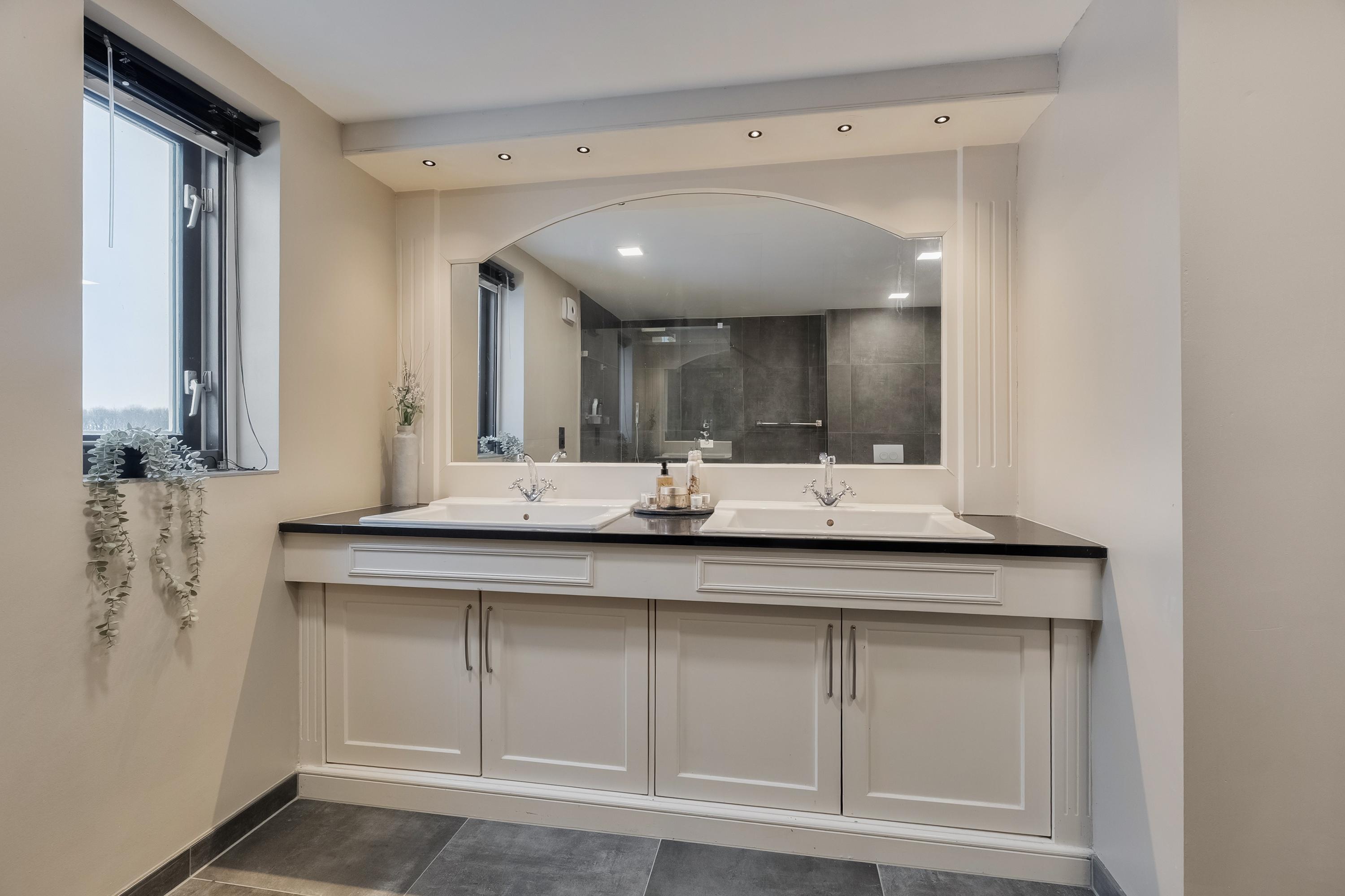 De moderne badkamer is luxe uitgevoerd met een dubbele wastafel met wandmeubel, spiegel en verlichting, een hangend tweede toilet en een ruime inloopdouche met regendouche. De badkamer is volledig betegeld in een stijlvolle grijze kleurstelling. De ventilatie is aangelegd in 2023.