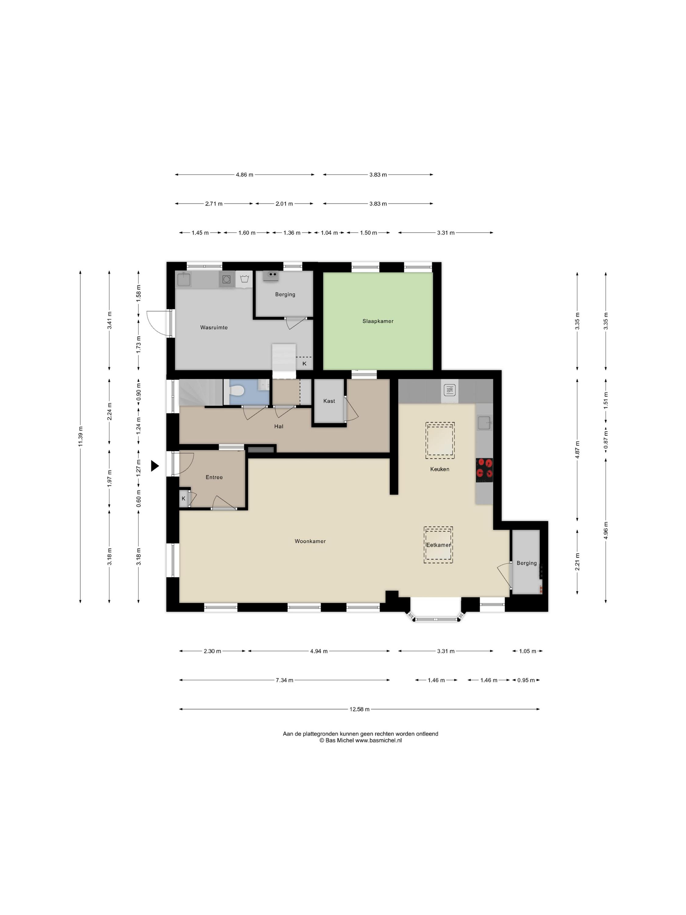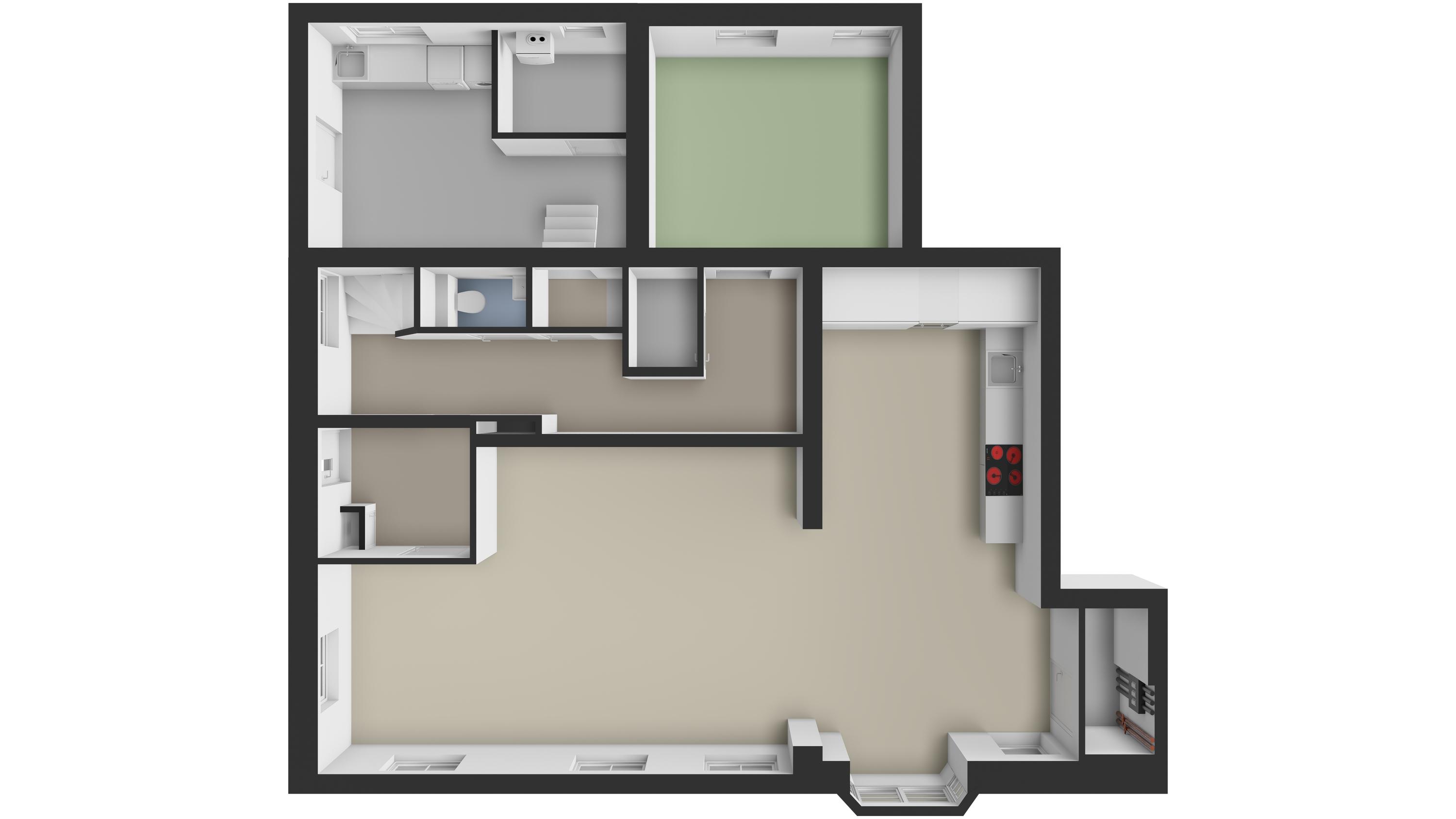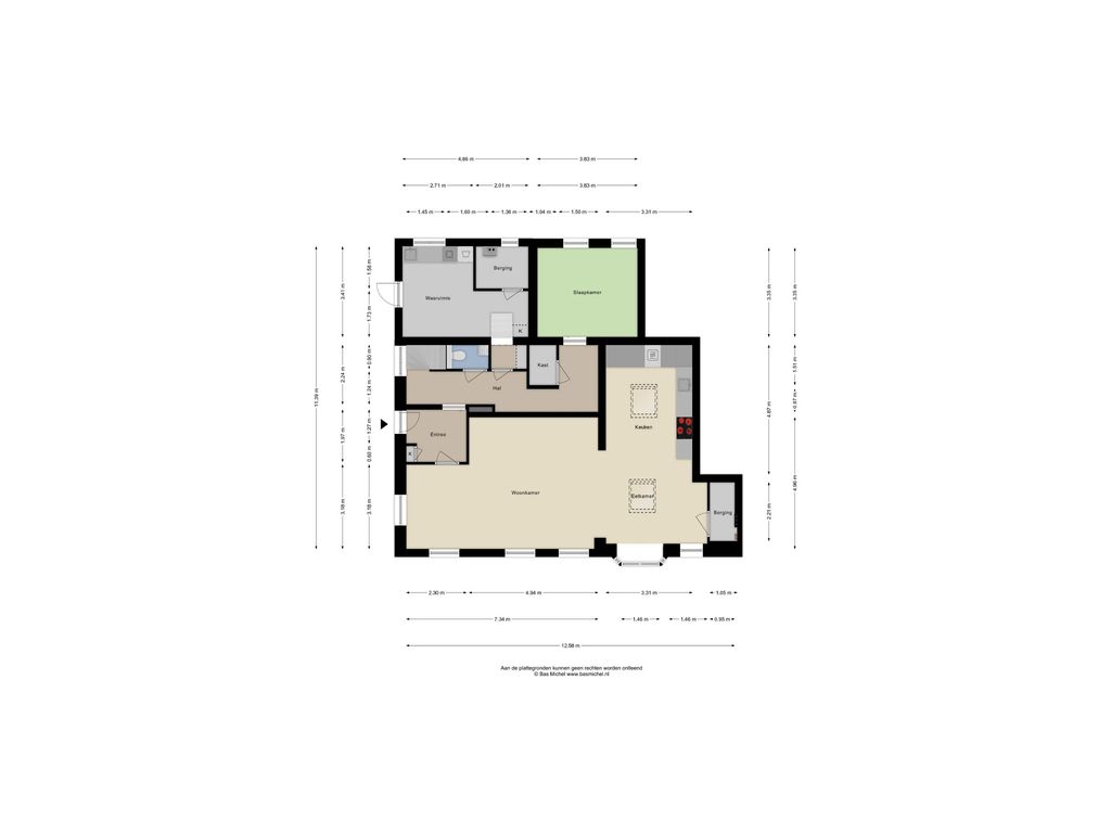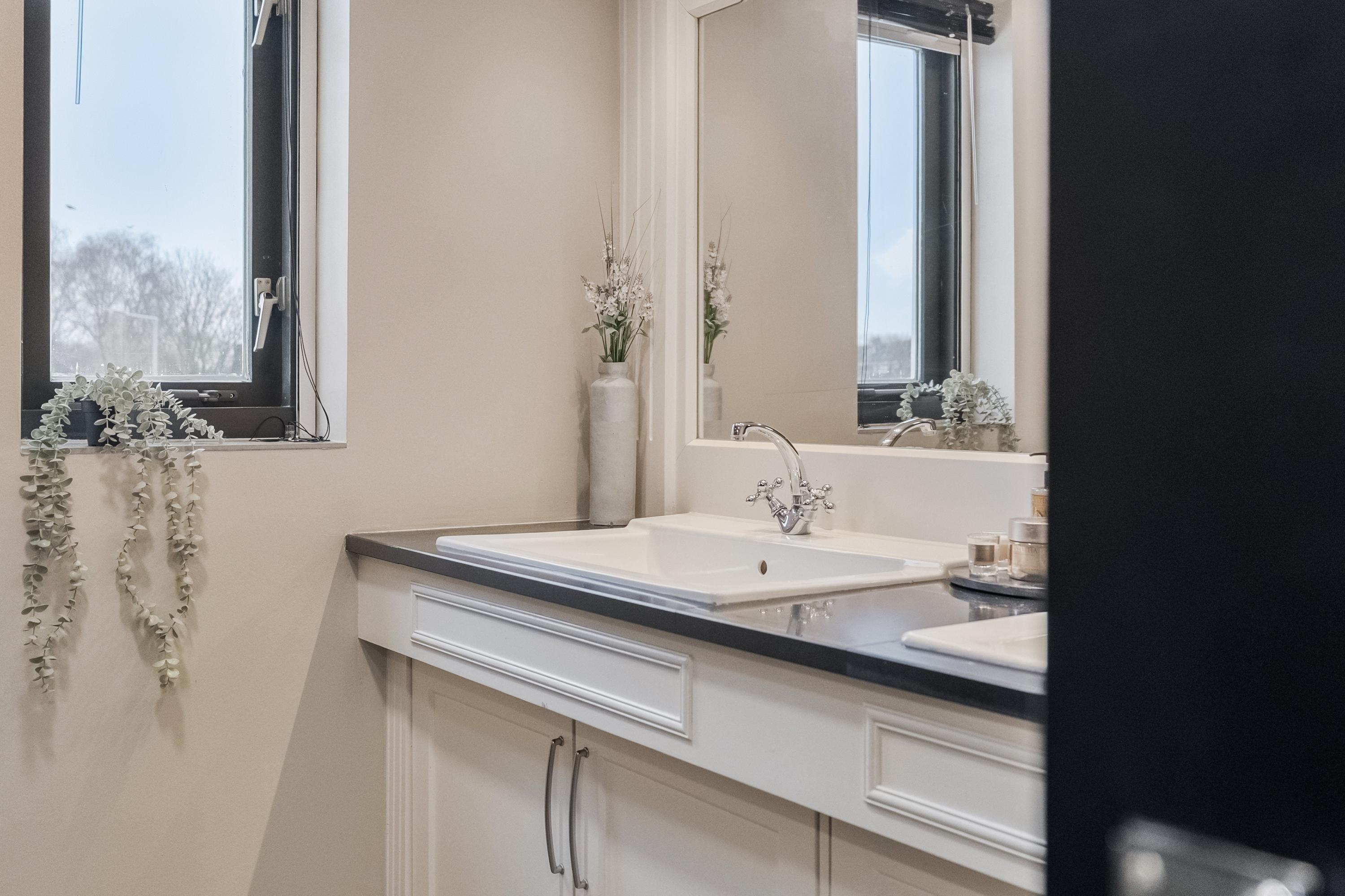 De lager gelegen bijkeuken is bereikbaar vanuit de binnenhal en beschikt over aansluitingen voor wasmachine en droger, een aparte ruimte voor de CV-combiketel (Intergas, 2023), de verdeler van de vloerverwarming en de gas- en watermeter. De ruimte is deels betegeld en voorzien van een aanrechtblad met spoelbak en warm/koud water. Vanuit hier heeft u direct toegang tot de tuin.