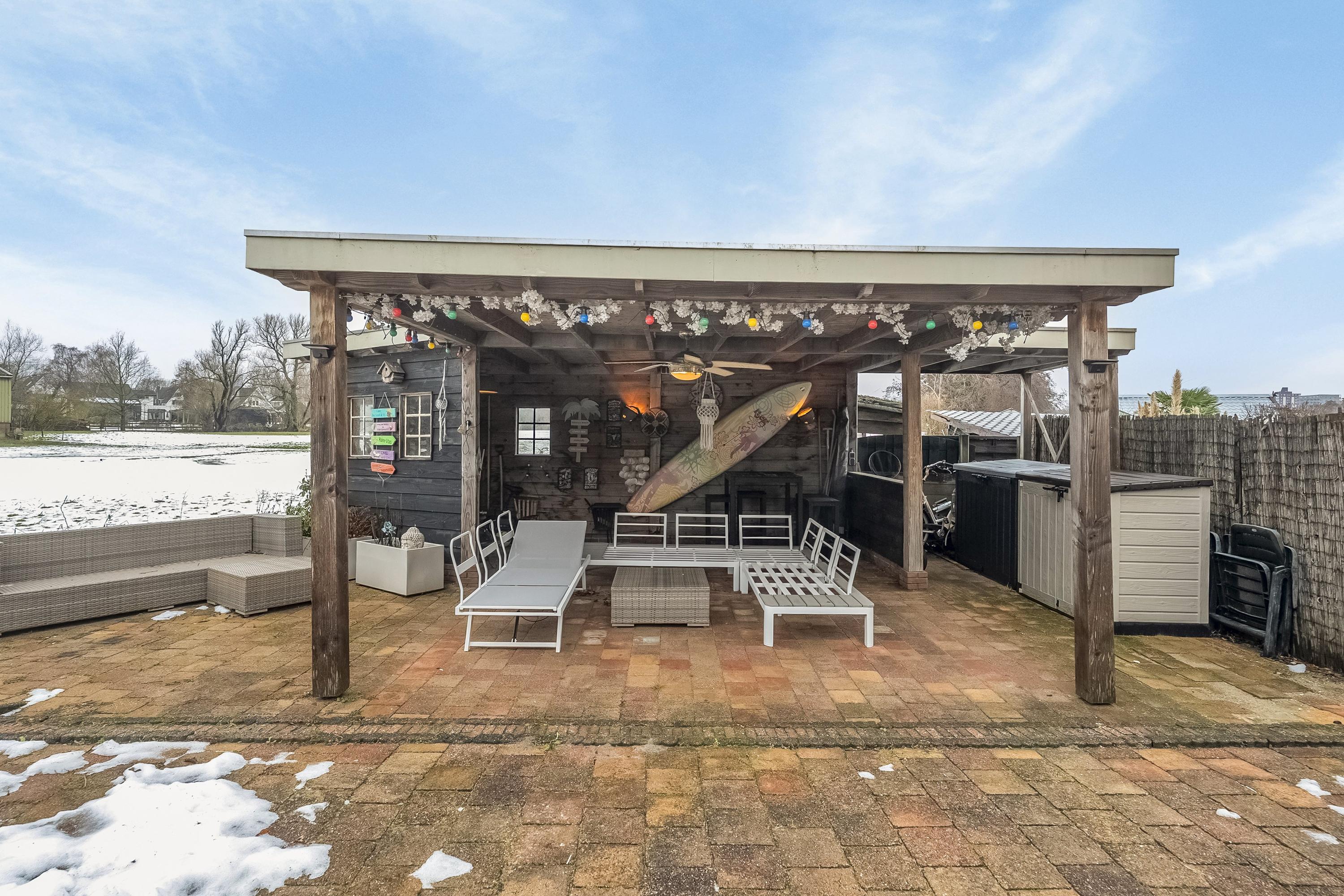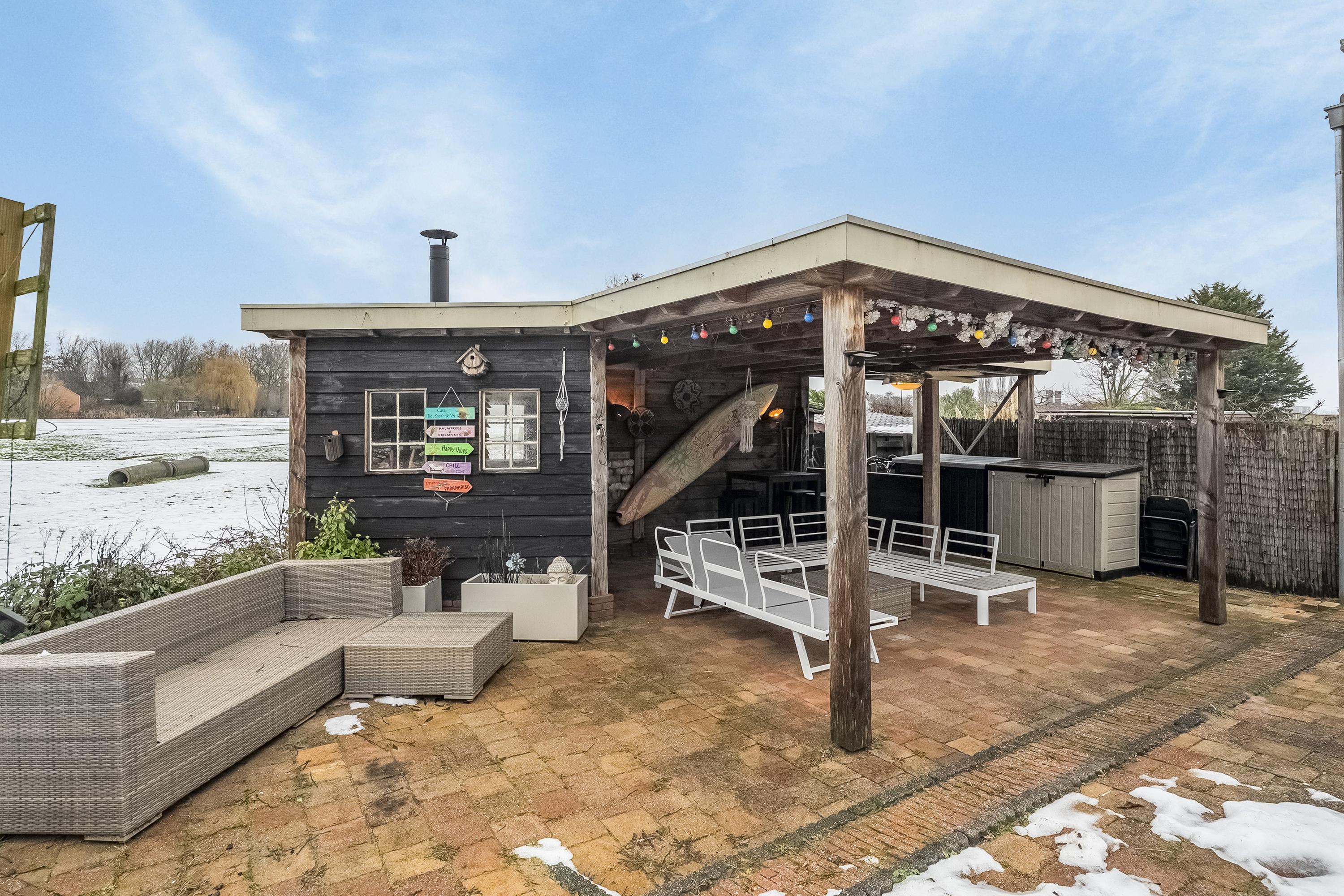 De tuin is fraai en speels aangelegd met sierbestrating, echt gras, sierbeplanting en fruitbomen (appel en peer). Er is een achterom, een buitenkraan en een gezellige overkapping met verlichting. Het vrije uitzicht over het weiland en het water aan de achterzijde, gecombineerd met de privacy vanaf de dijk, maken dit een uitzonderlijk fijne buitenruimte.