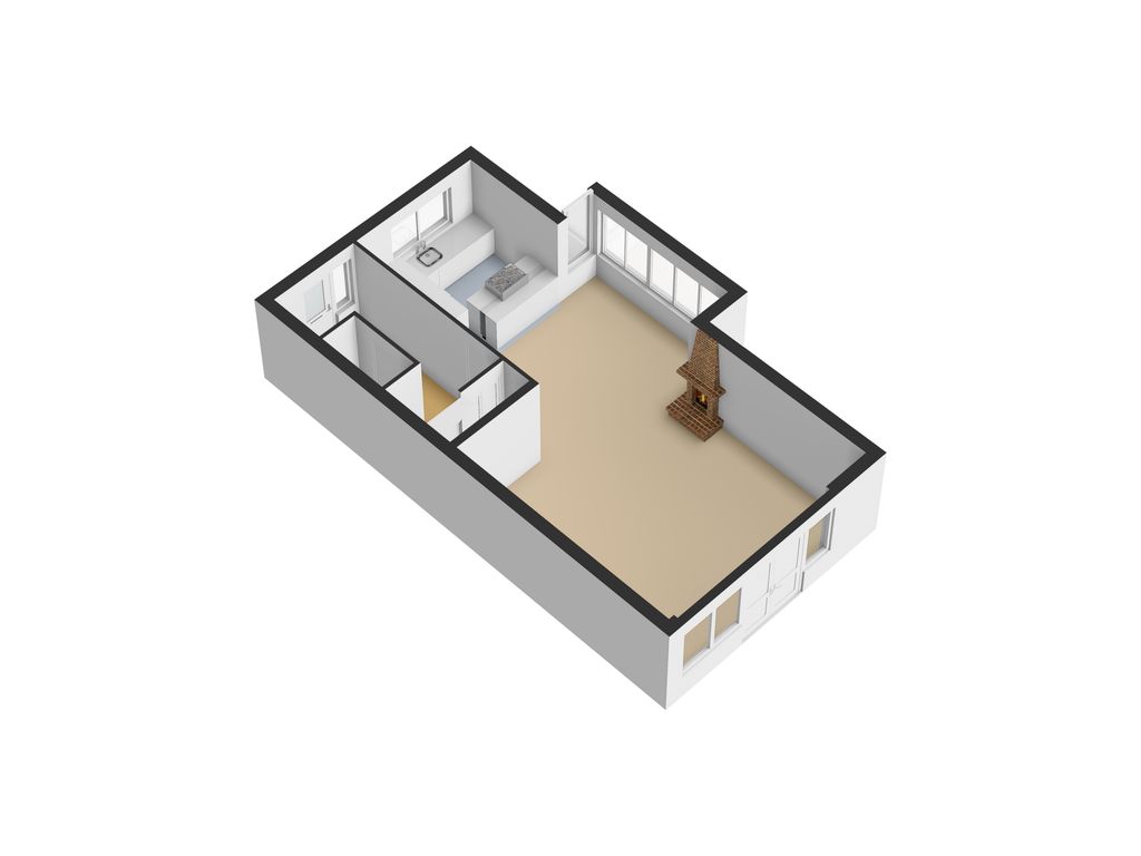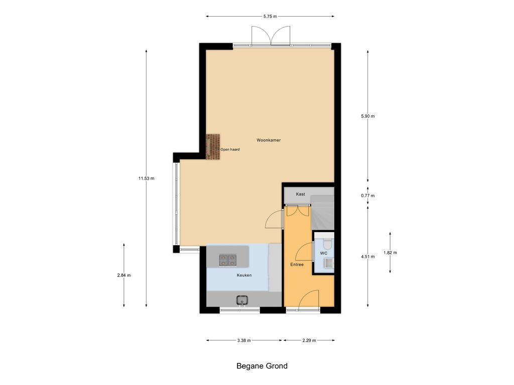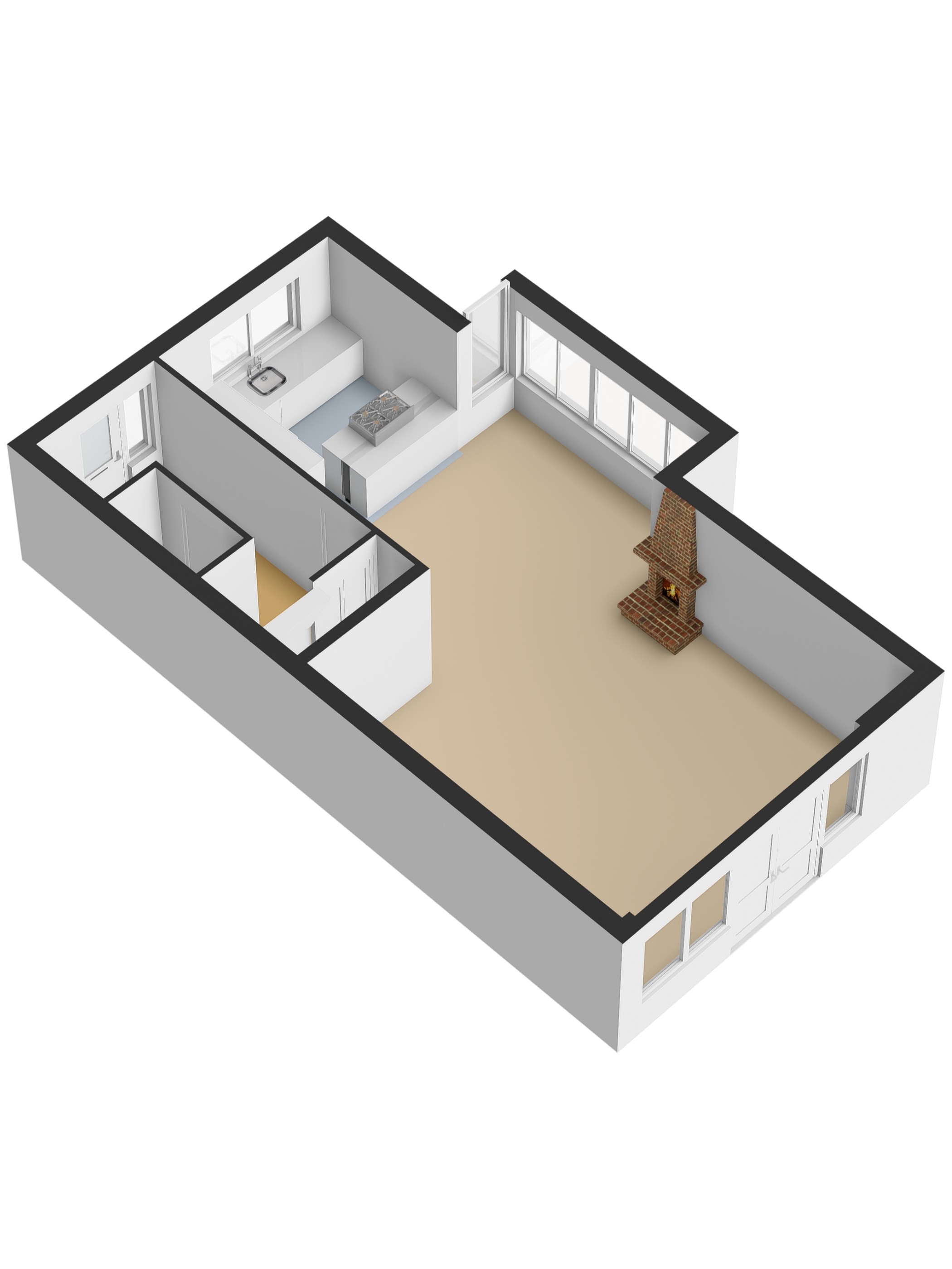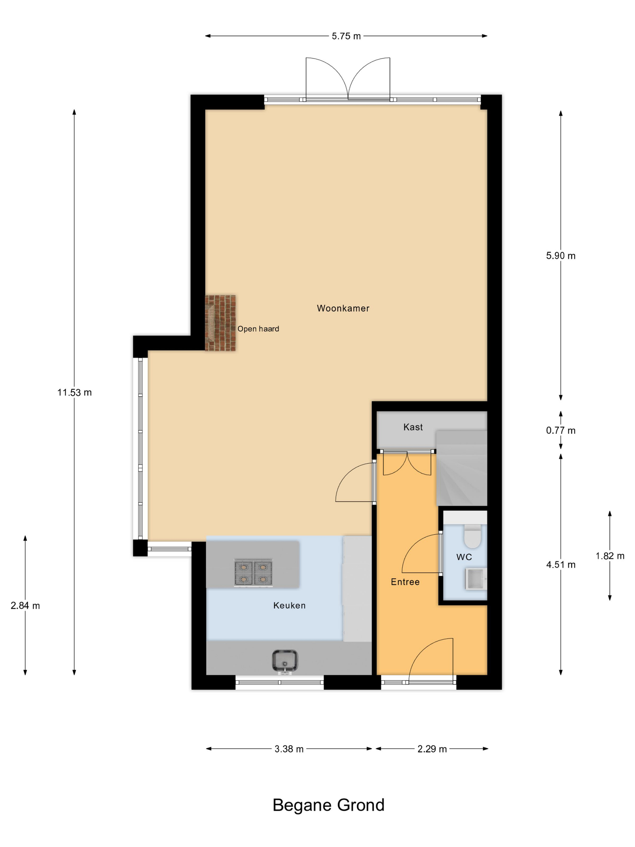 Door de stoere zwarte paneeldeur komt u de woonkamer en de keuken binnen. Een zee van licht valt binnen via de grote raampartijen aan de achterzijde en in de erker aan de zijkant. De openslaande deuren aan de achterzijde geven toegang tot de gezellige tuin.