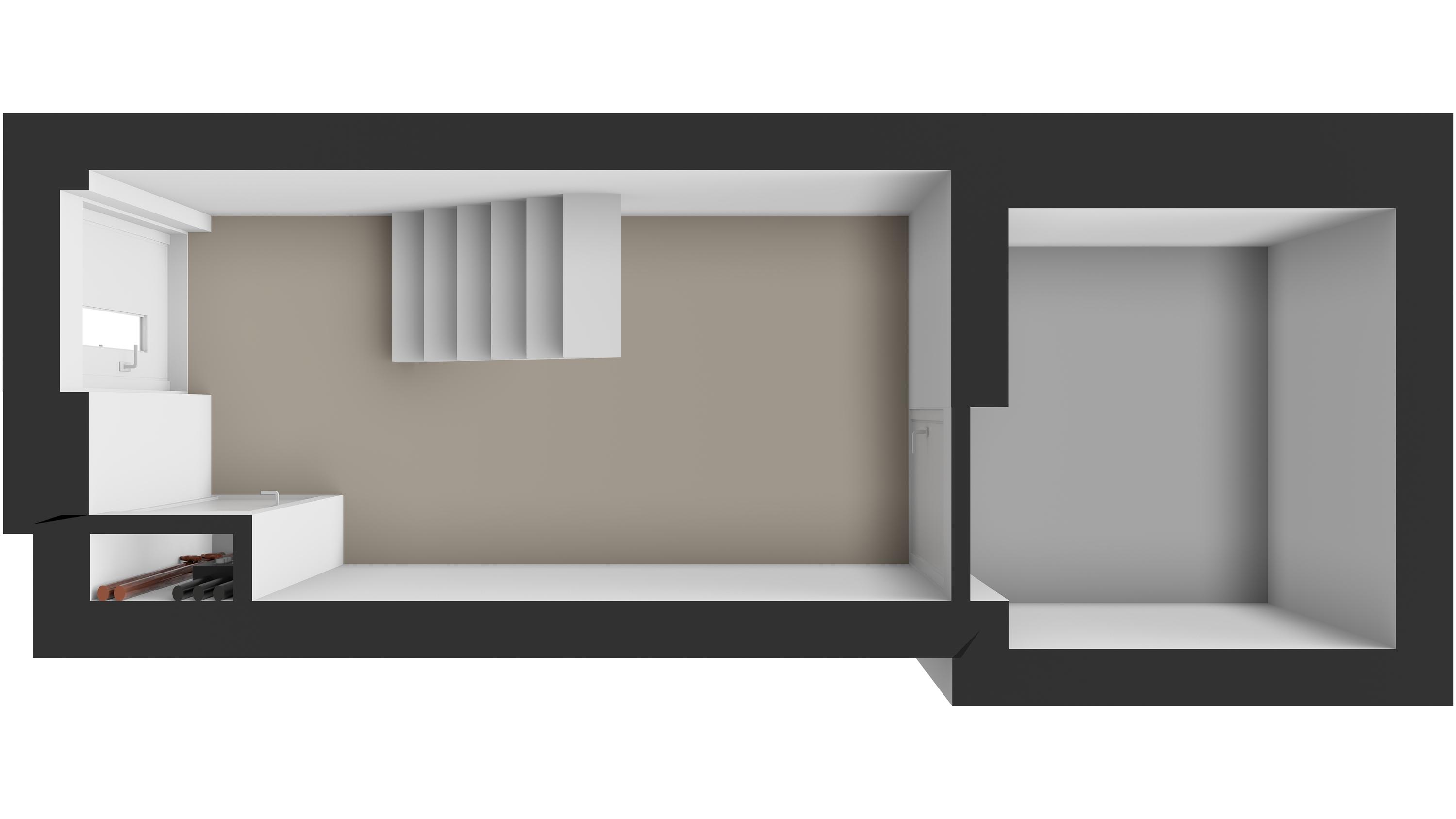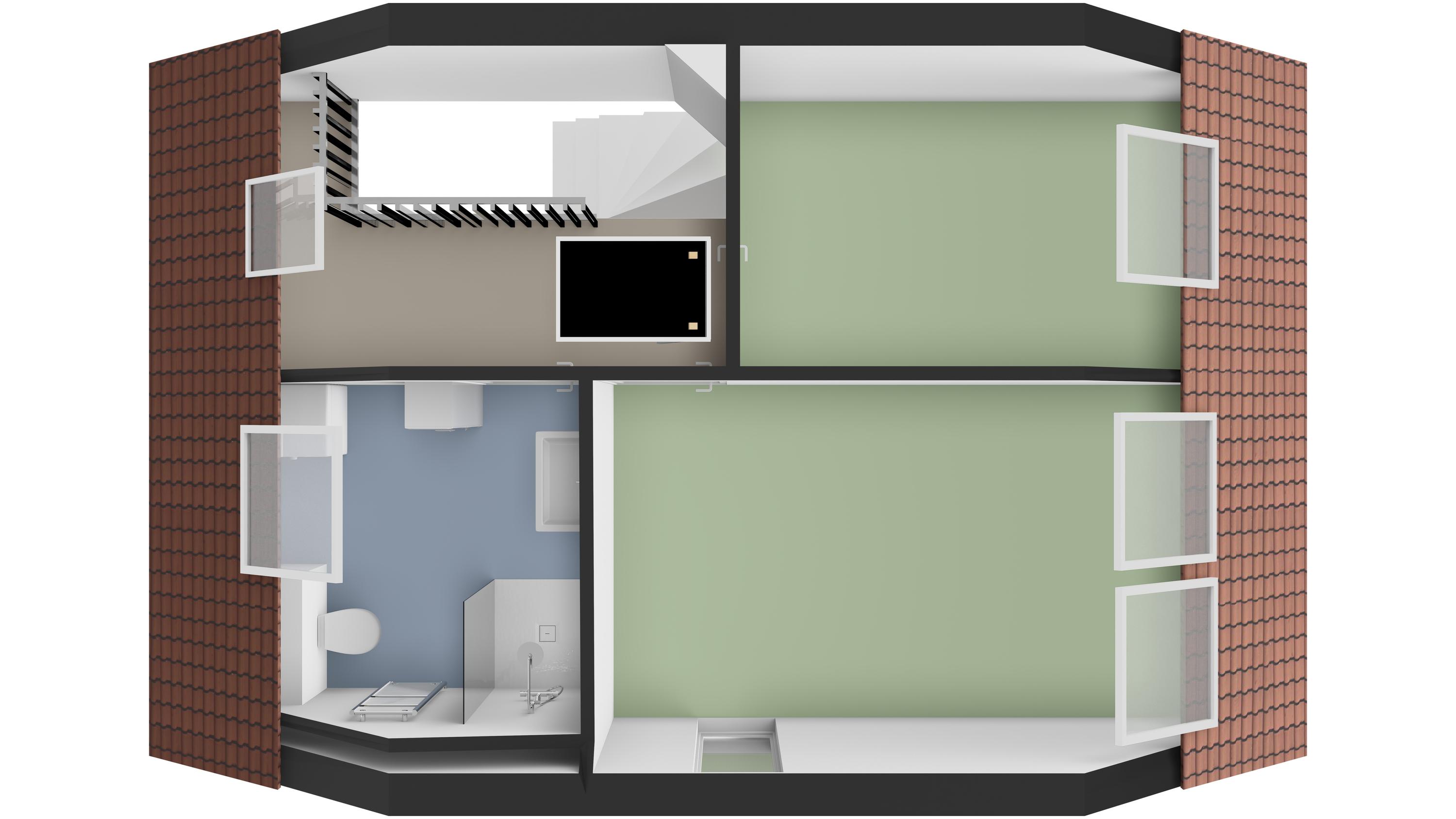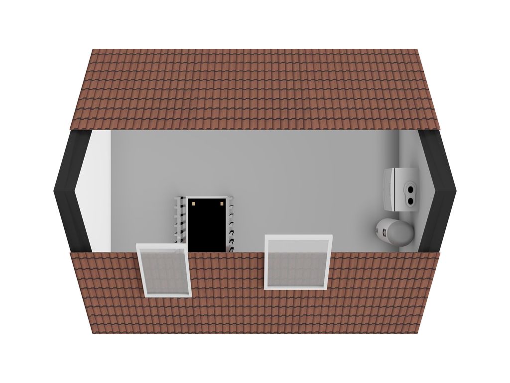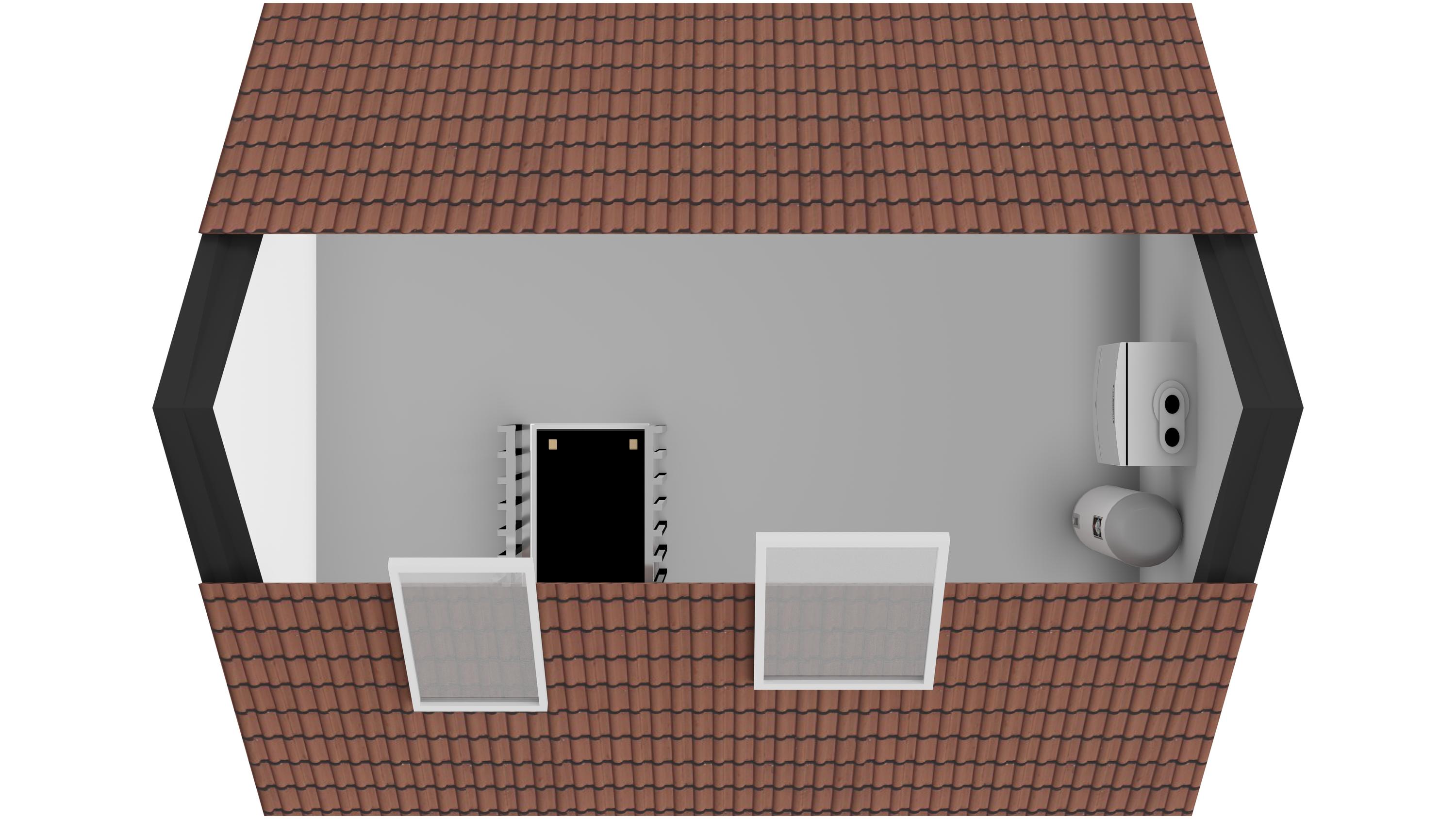 Geïsoleerde bergvliering voorzien van twee grote dakramen. In deze ruimte bevinden zich de warmtepompboiler en de omvormer voor de 12 zonnepanelen.