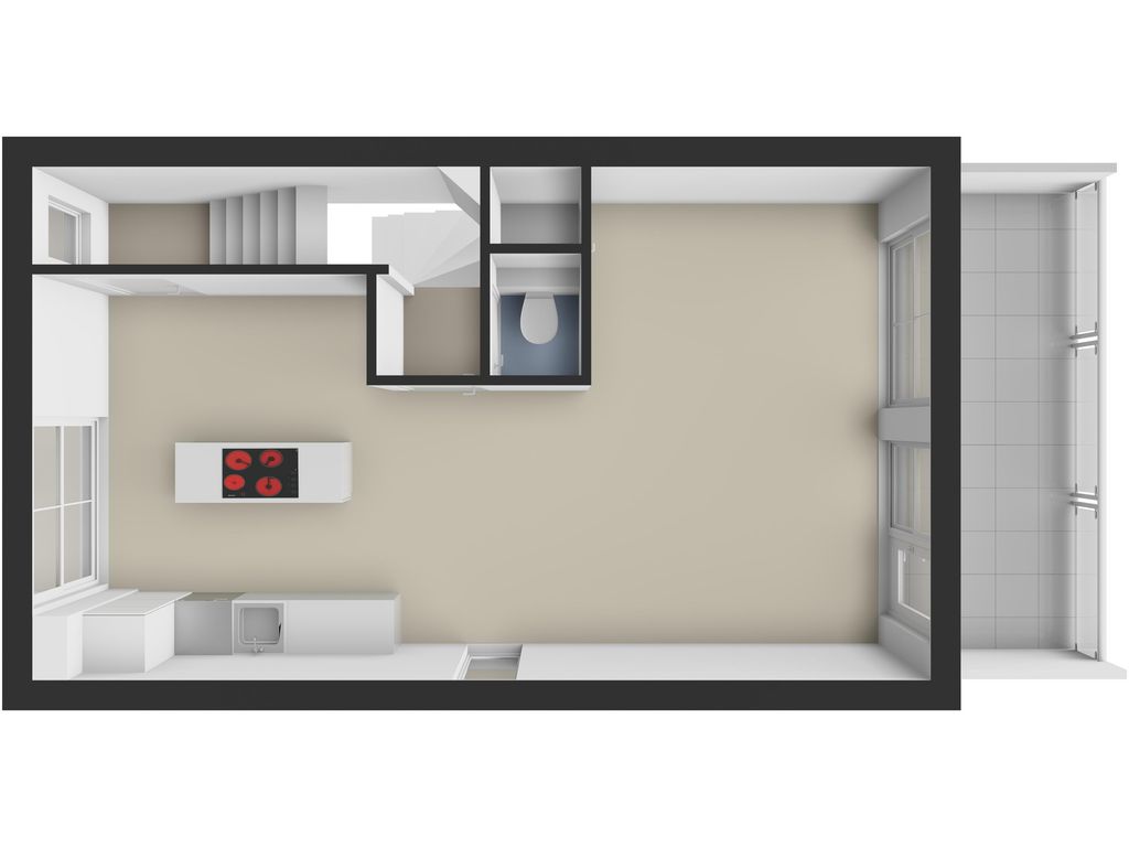 Overloop met trap naar de 2e verdieping en toegang tot de living en de toiletruimte. De overloop is verder afgewerkt met een duurzame PVC vloer. Toiletruimte voorzien van een hangcloset. De toiletruimte is gedeeltelijk betegeld in een wit/grijs kleurstelling.
