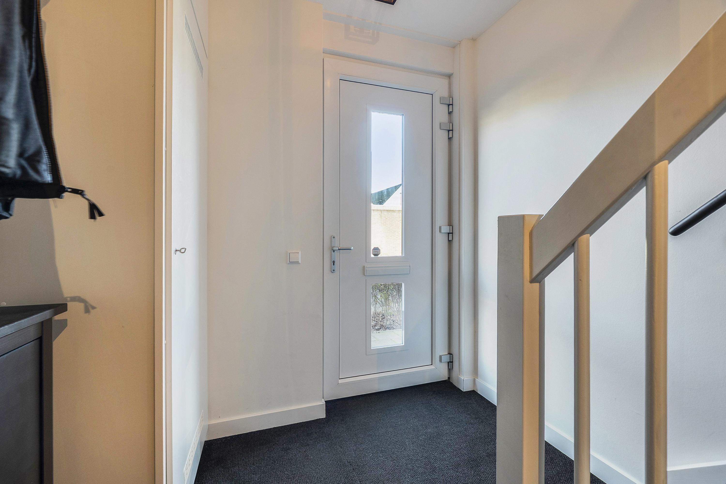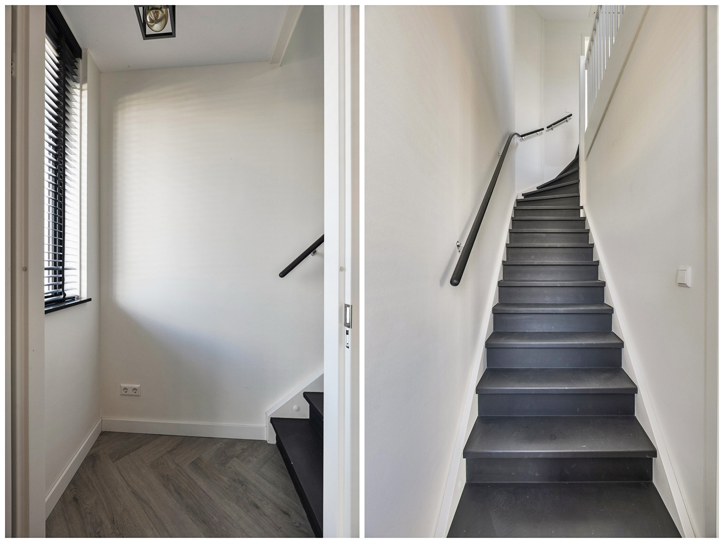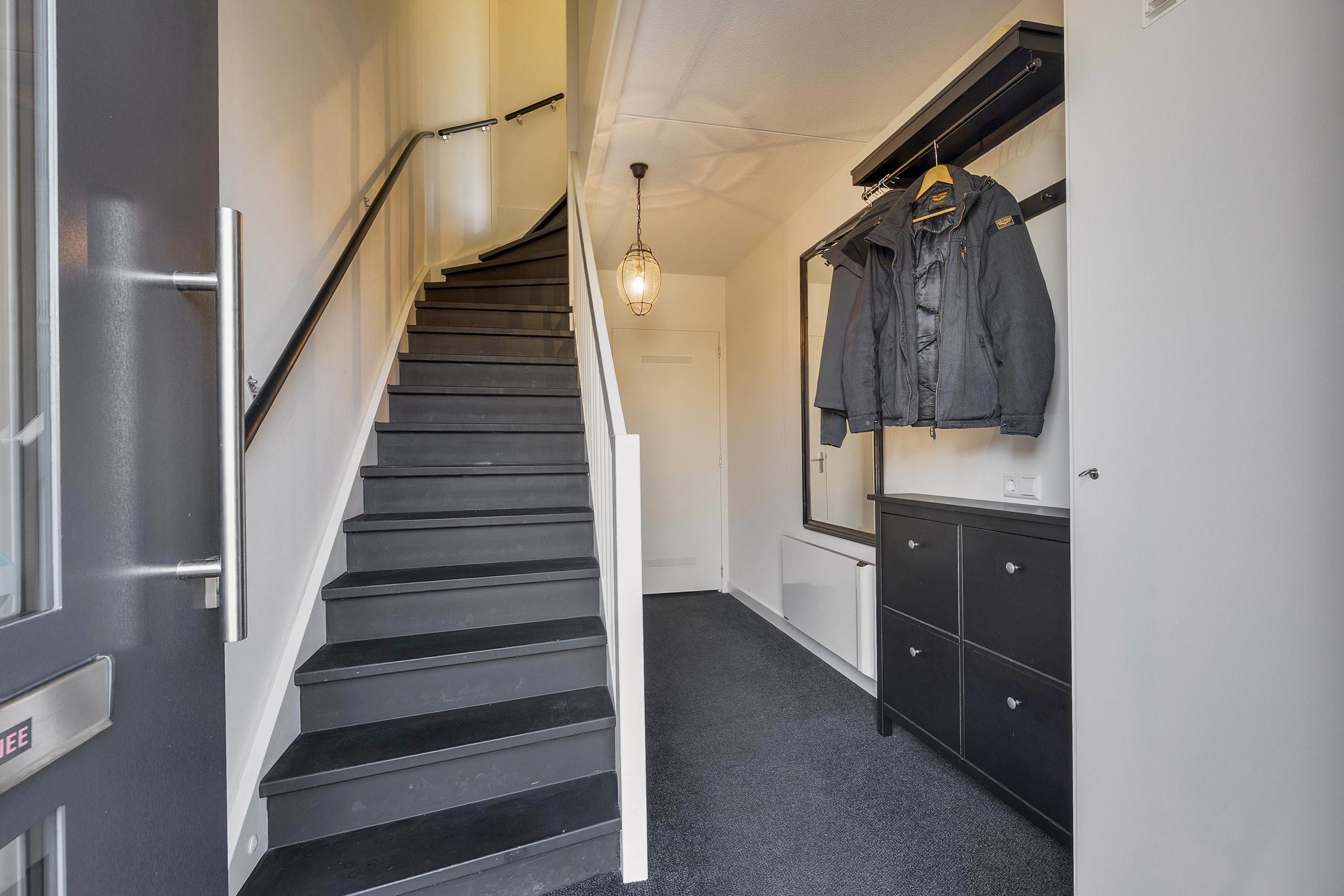 Entree, hal met meterkast, trap naar de 1e verdieping en toegang tot de berging. De hal is afgewerkt met vloerbedekking.