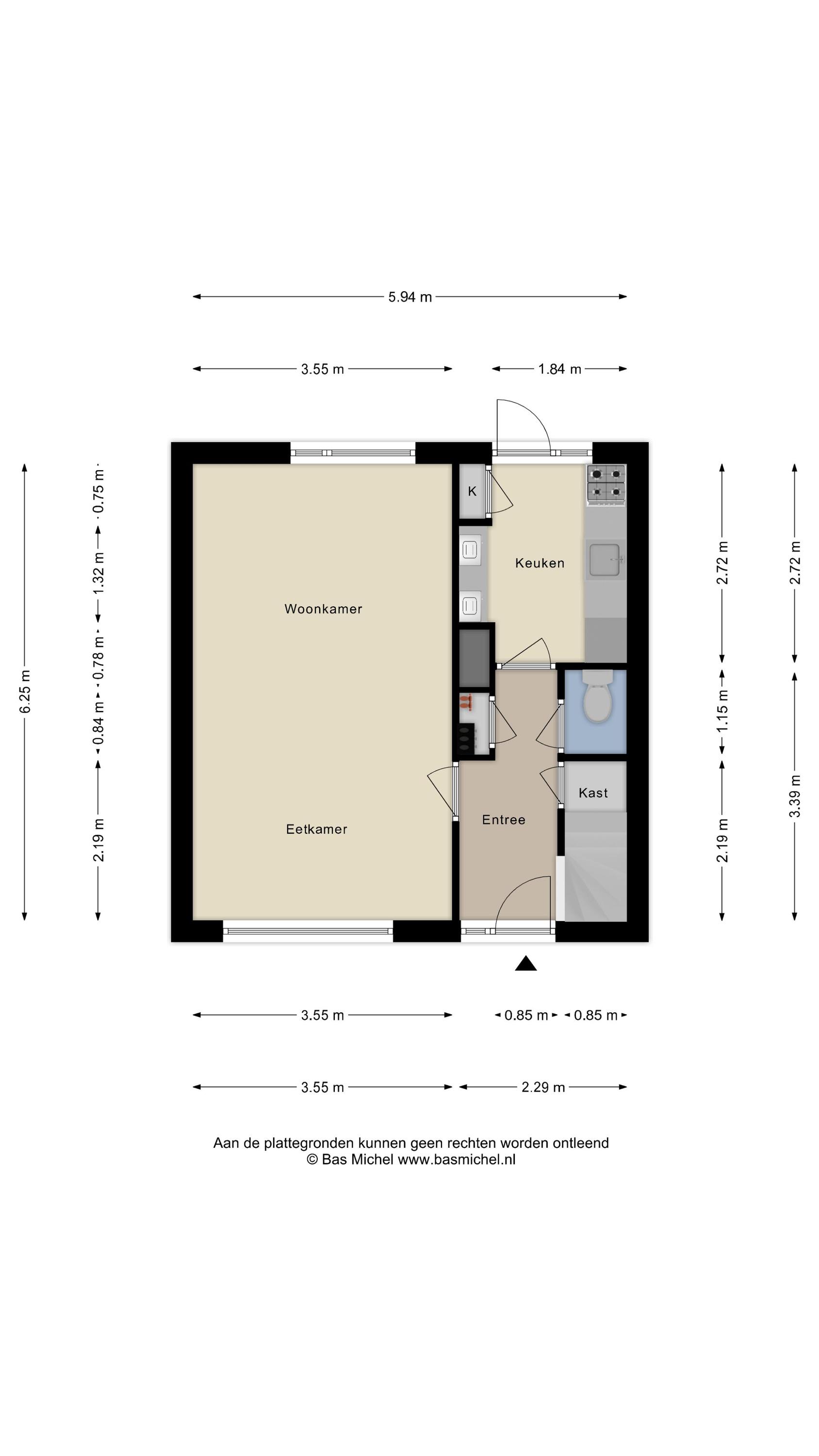 Entree, hal met meterkast, trap naar de 1e verdieping, voorraad keldertje, toiletruimte voorzien van een duoblok toilet. De toiletruimte is gedeeltelijk betegeld in een lichte kleurstelling. De hal is afgewerkt met tegelvloer. Via de hal heeft u toegang tot de woonkamer en de keuken.