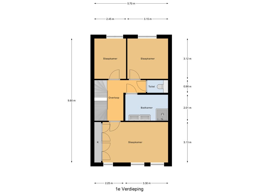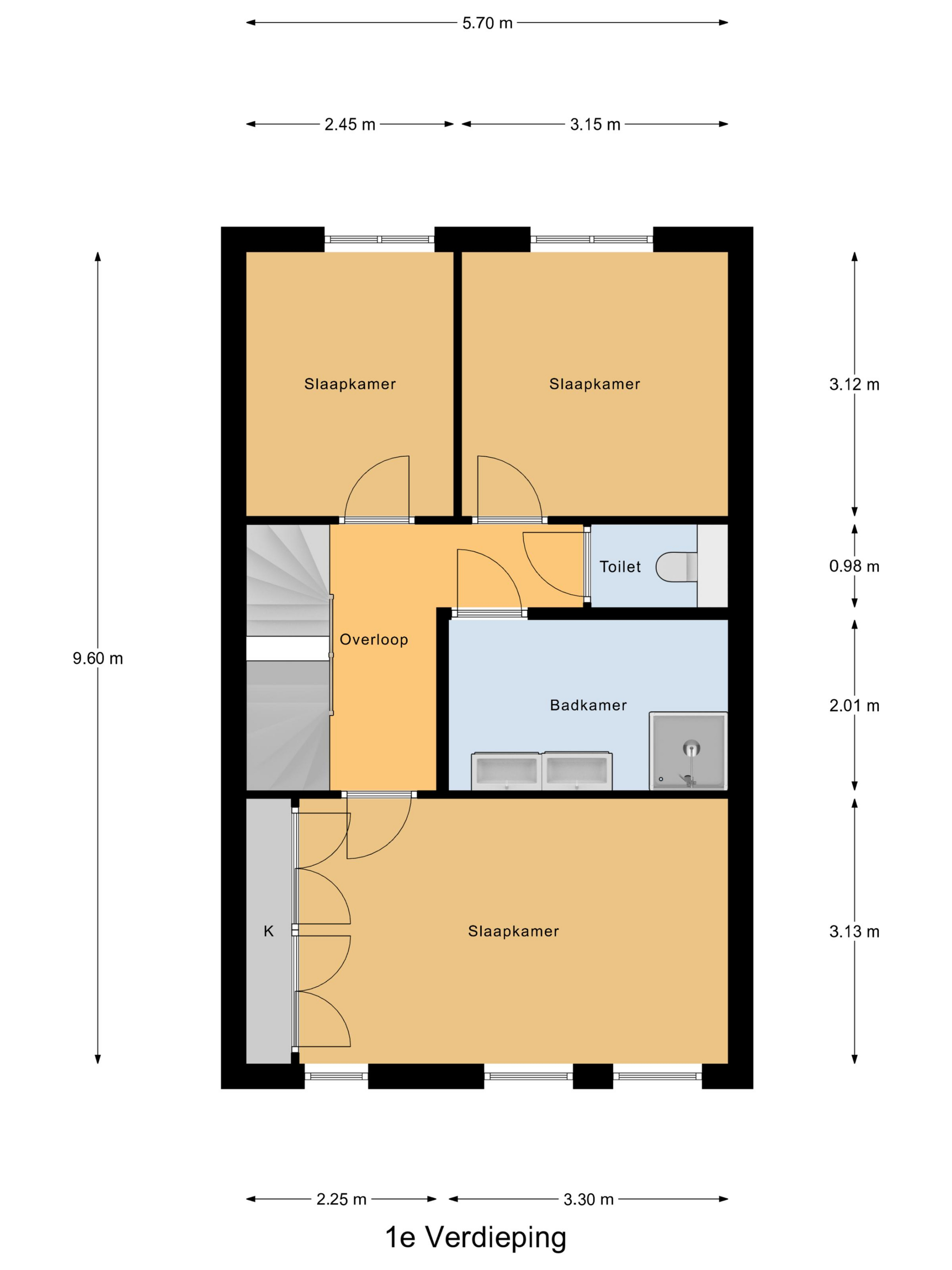Op de eerste verdieping tref je drie volwaardige slaapkamers, elk met veel lichtinval. De badkamer heeft vloerverwarming en is voorzien van een royale inloopdouche, een zwevend wastafelmeubel met dubbele kraan, grote spiegel en moderne grijze tegels. Een separate tweede toiletruimte is eveneens aanwezig.