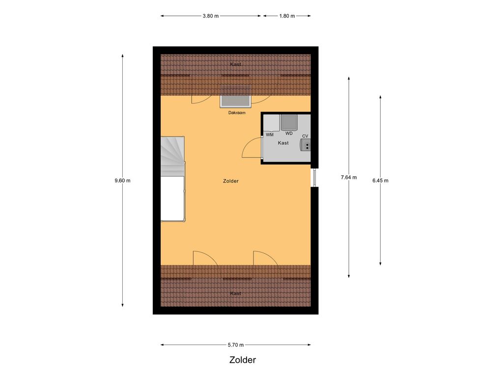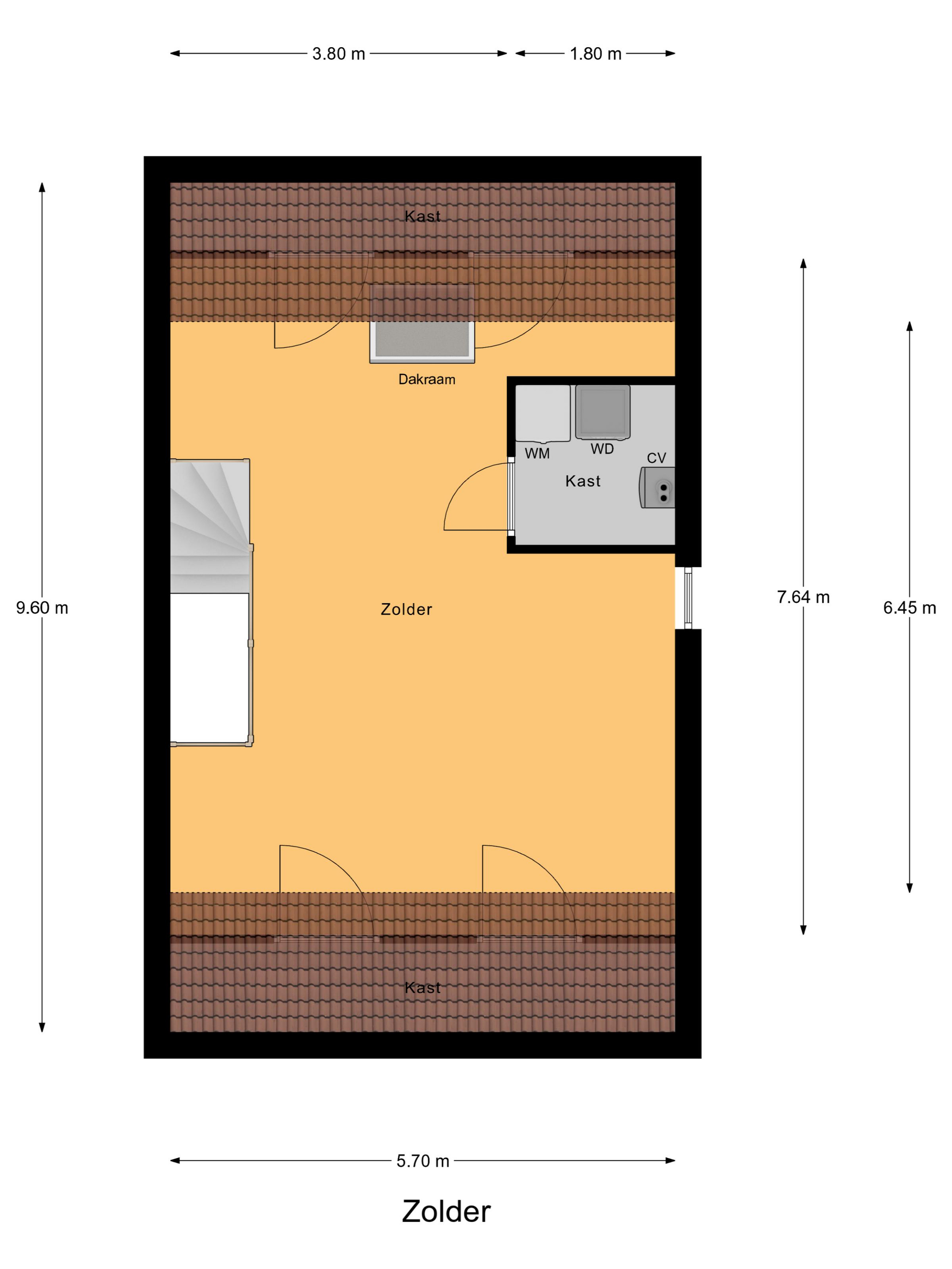 De vaste trap leidt naar een ruime zolderverdieping. Hier vindt je een grote open ruimte met dakramen, aansluitingen voor wasmachine en droger, en extra bergruimte achter de knieschotten. Deze verdieping biedt volop mogelijkheden voor een vierde slaapkamer, een werkkamer of hobbyruimte.