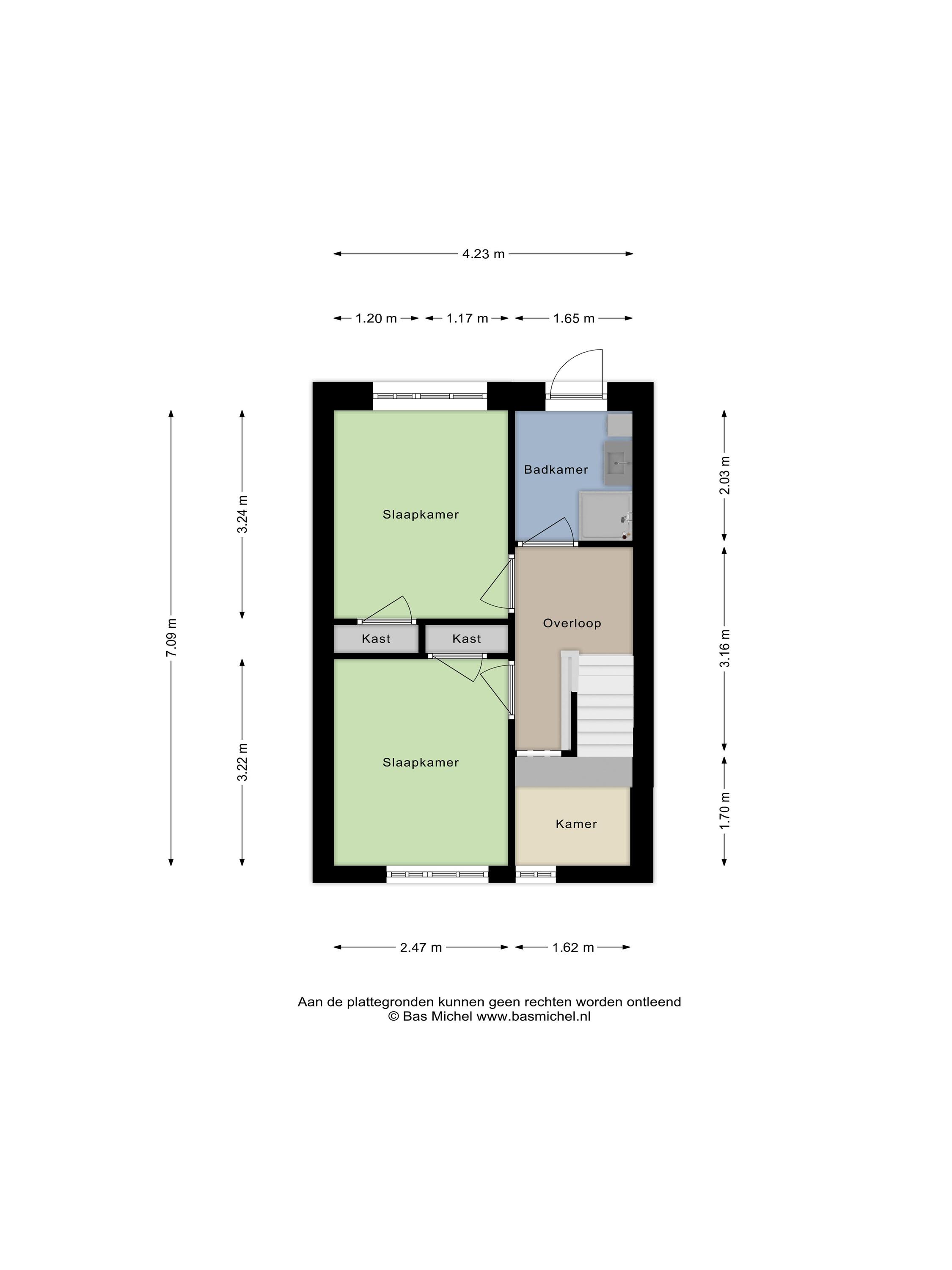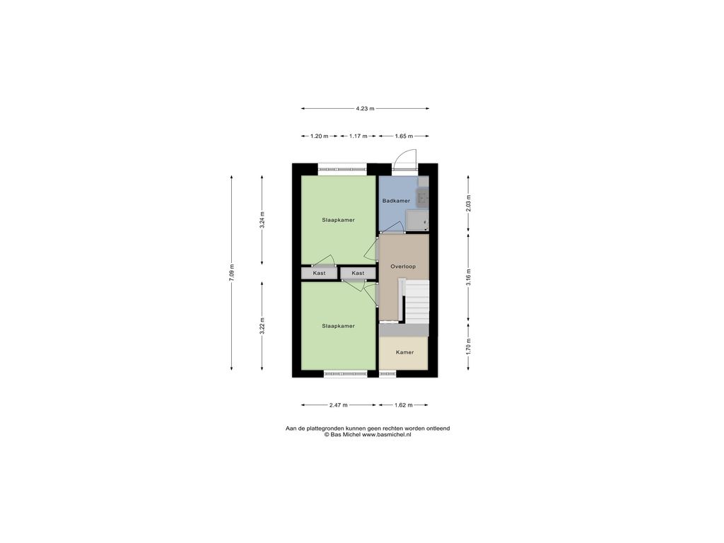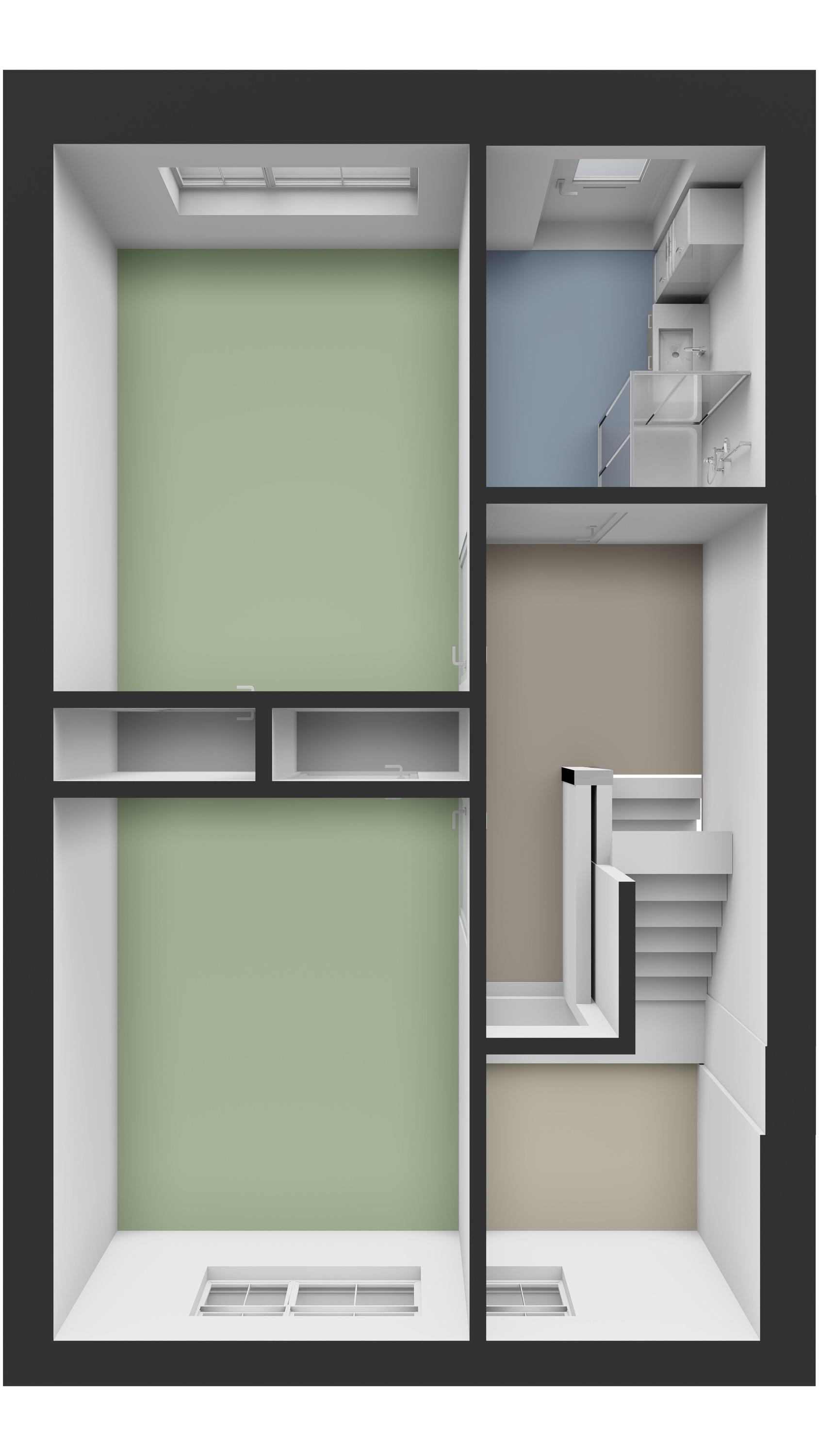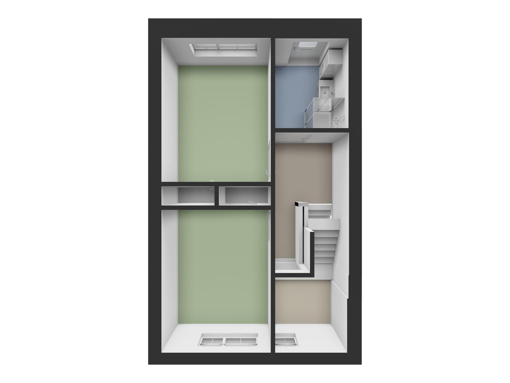 De overloop geeft toegang tot twee slaapkamers en de badkamer. De gehele verdieping is afgewerkt met een laminaatvloer.