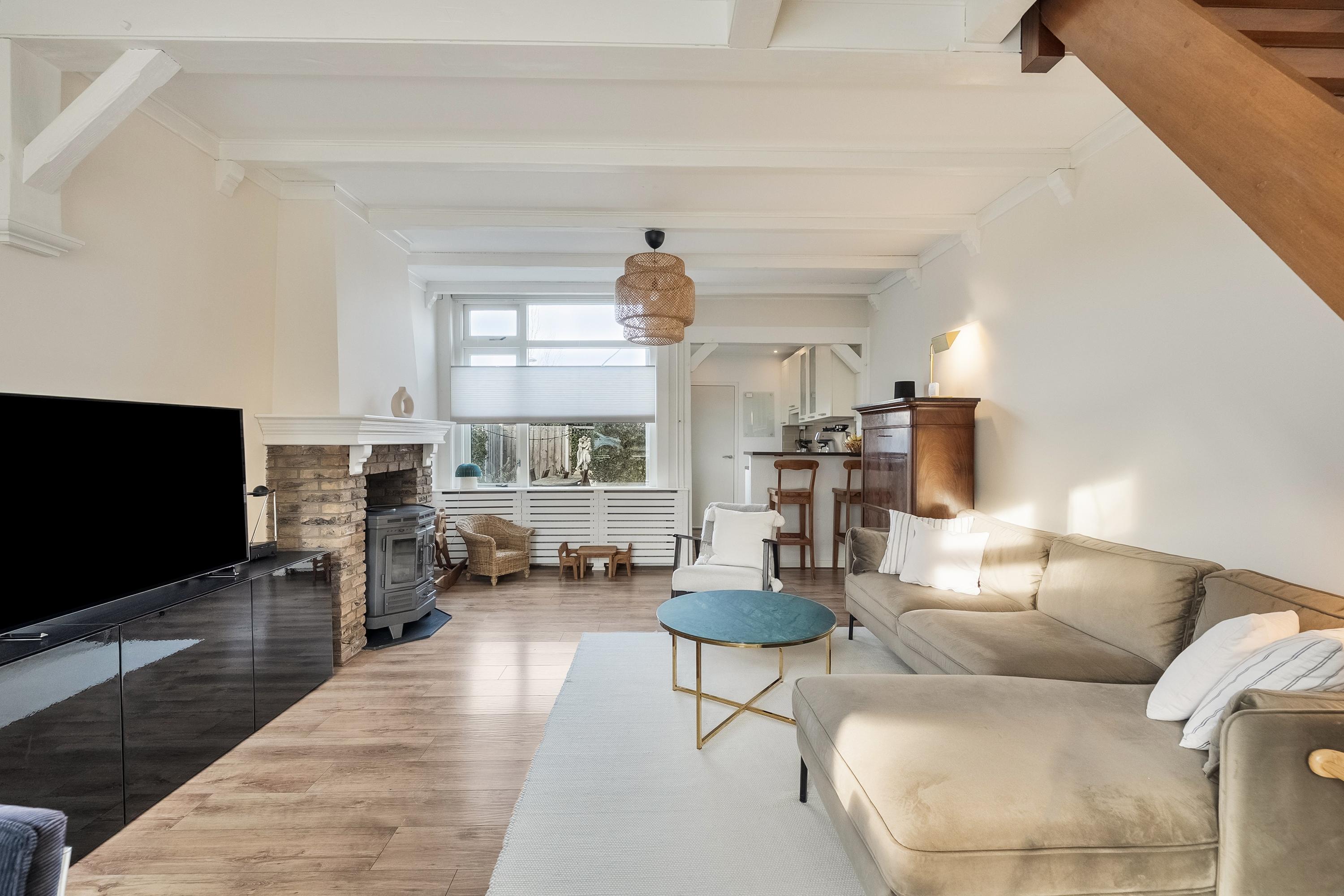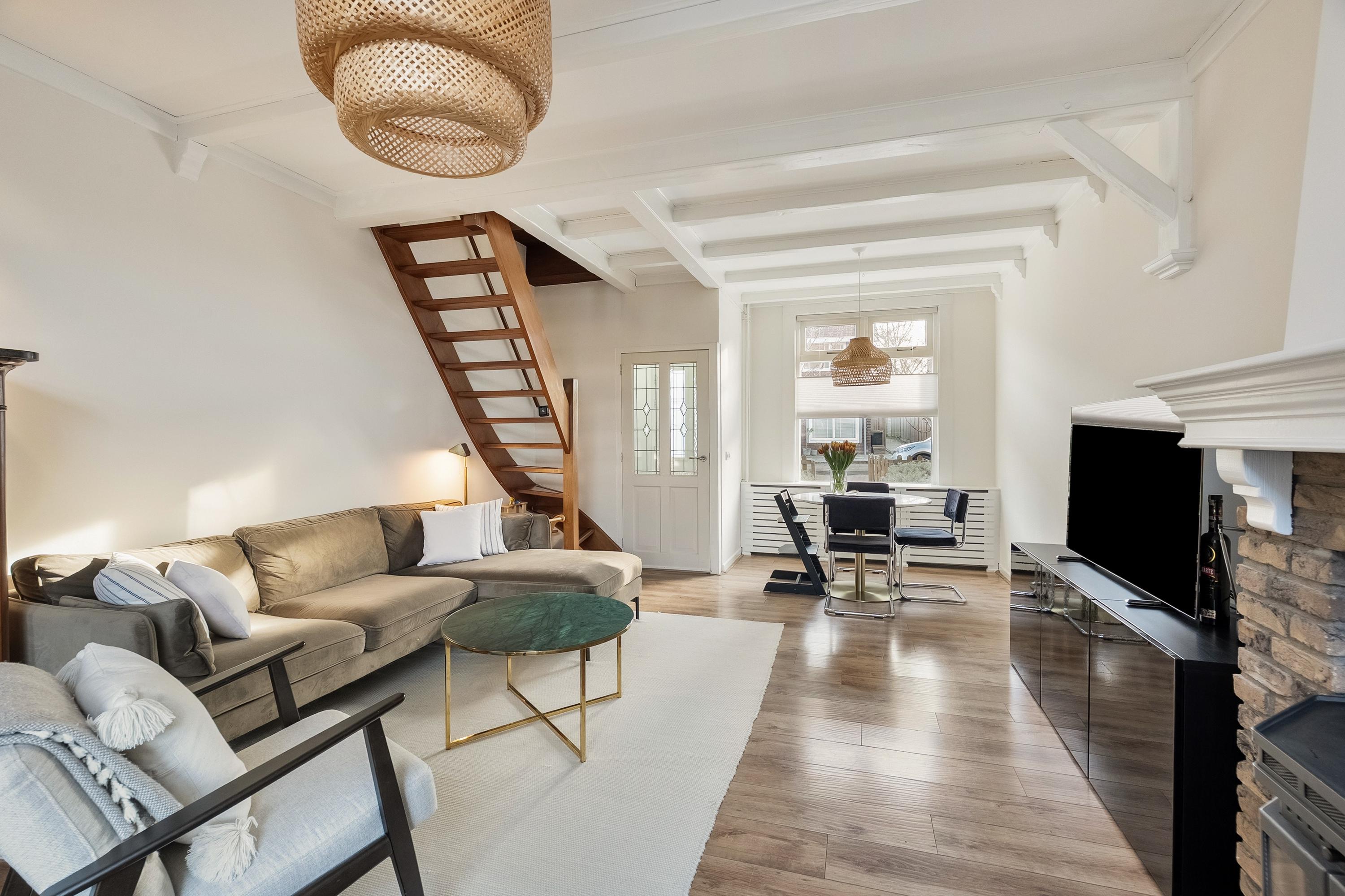 De entree geeft toegang tot de hal, waar de glas-in-loodramen en paneeldeuren direct de authentieke sfeer benadrukken. Vanuit de hal is de woonkamer bereikbaar. Deze is nagenoeg geheel opnieuw gestuct en geschilderd eind 2025 en straalt warmte en comfort uit. De gesloten houtkachel vormt een sfeervol middelpunt, ideaal voor de koudere maanden. De betonnen vloer is afgewerkt met een laminaatvloer en de grote ramen aan de voor- en achterzijde zorgen voor veel lichtinval. Het balkenplafond en de open trap naar de eerste verdieping versterken het karakter van de ruimte.