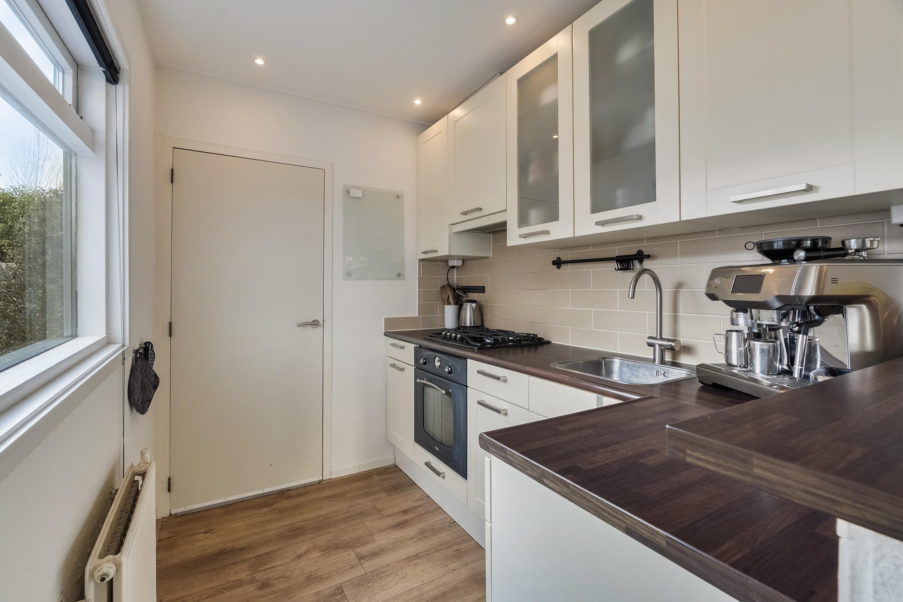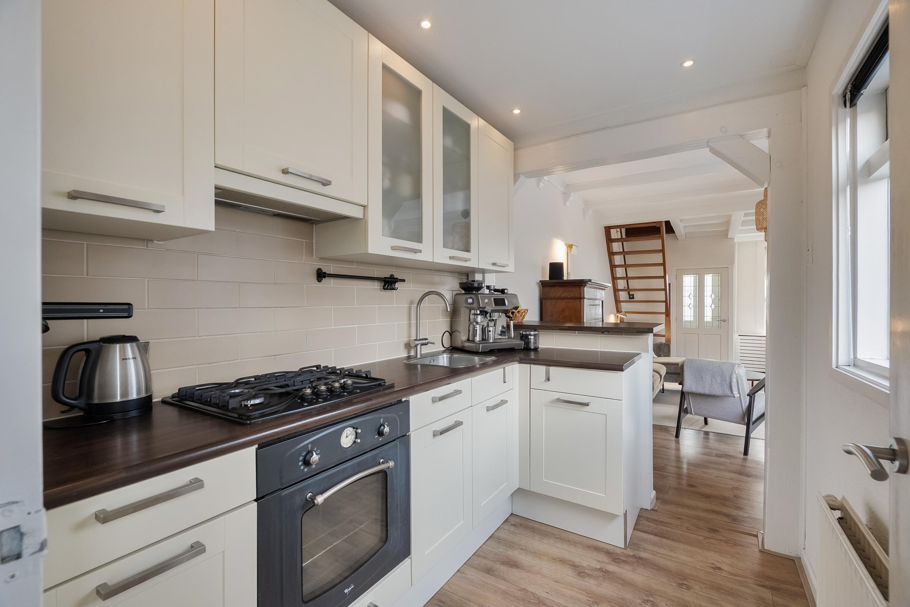 De open keuken sluit mooi aan op de woonkamer en is uitgevoerd met een eetbar. De keuken is voorzien van een oven en een 4-pits gaskookplaat met geïntegreerde afzuigkap in het bovenkastje. Vanuit de keuken is er toegang tot de tussenhal met de toiletruimte en de bijkeuken.