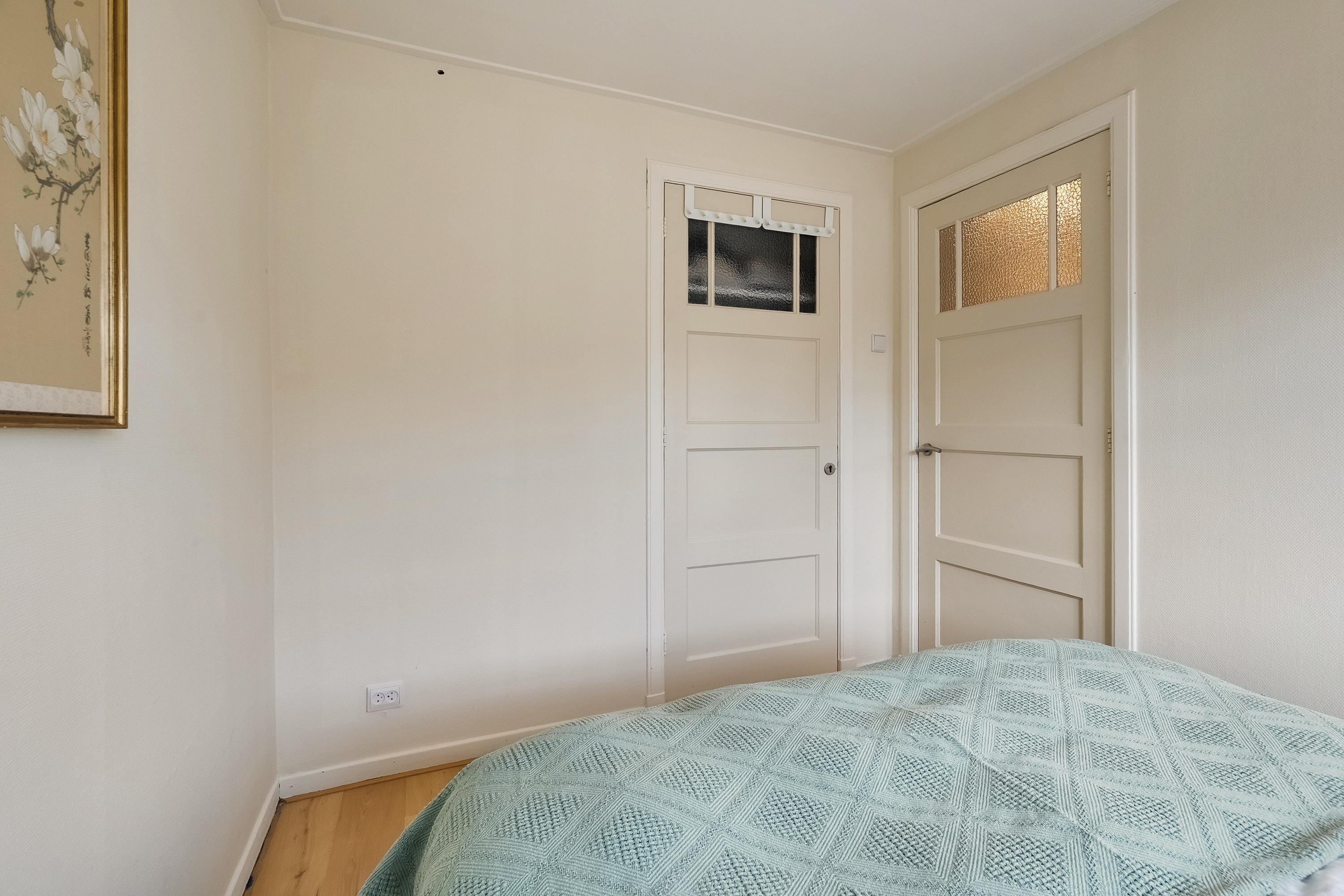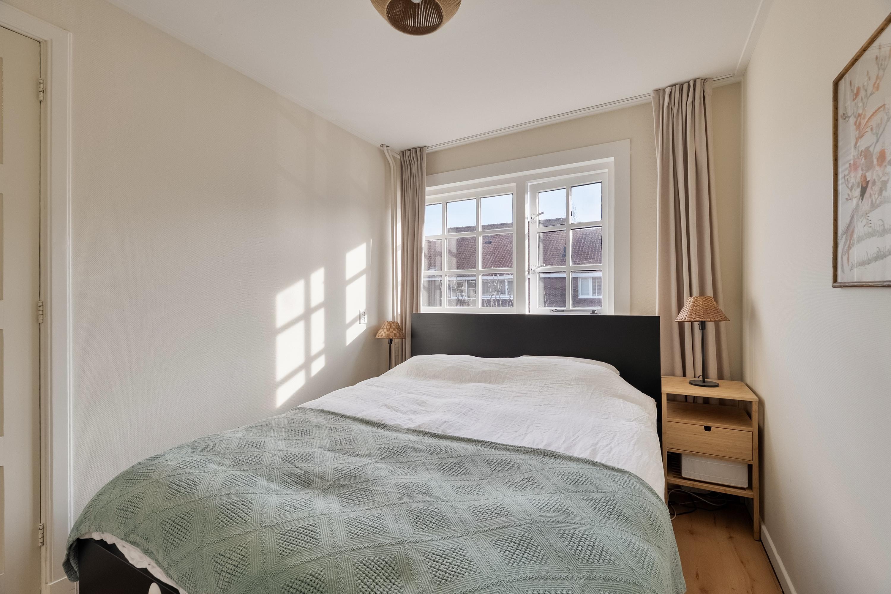 De tweede slaapkamer bevindt zich aan de achterzijde en is eveneens voorzien van een vaste inbouwkast.