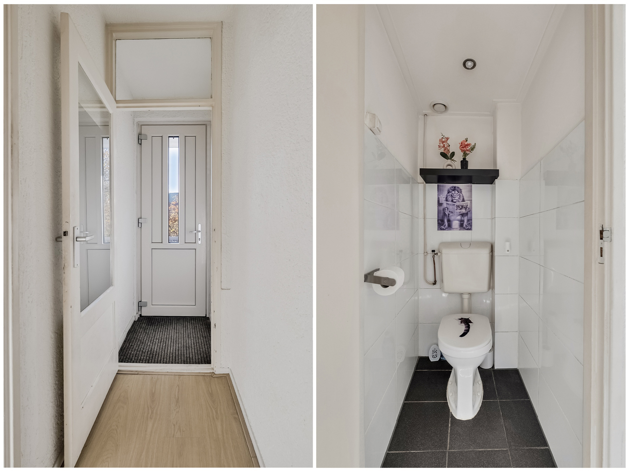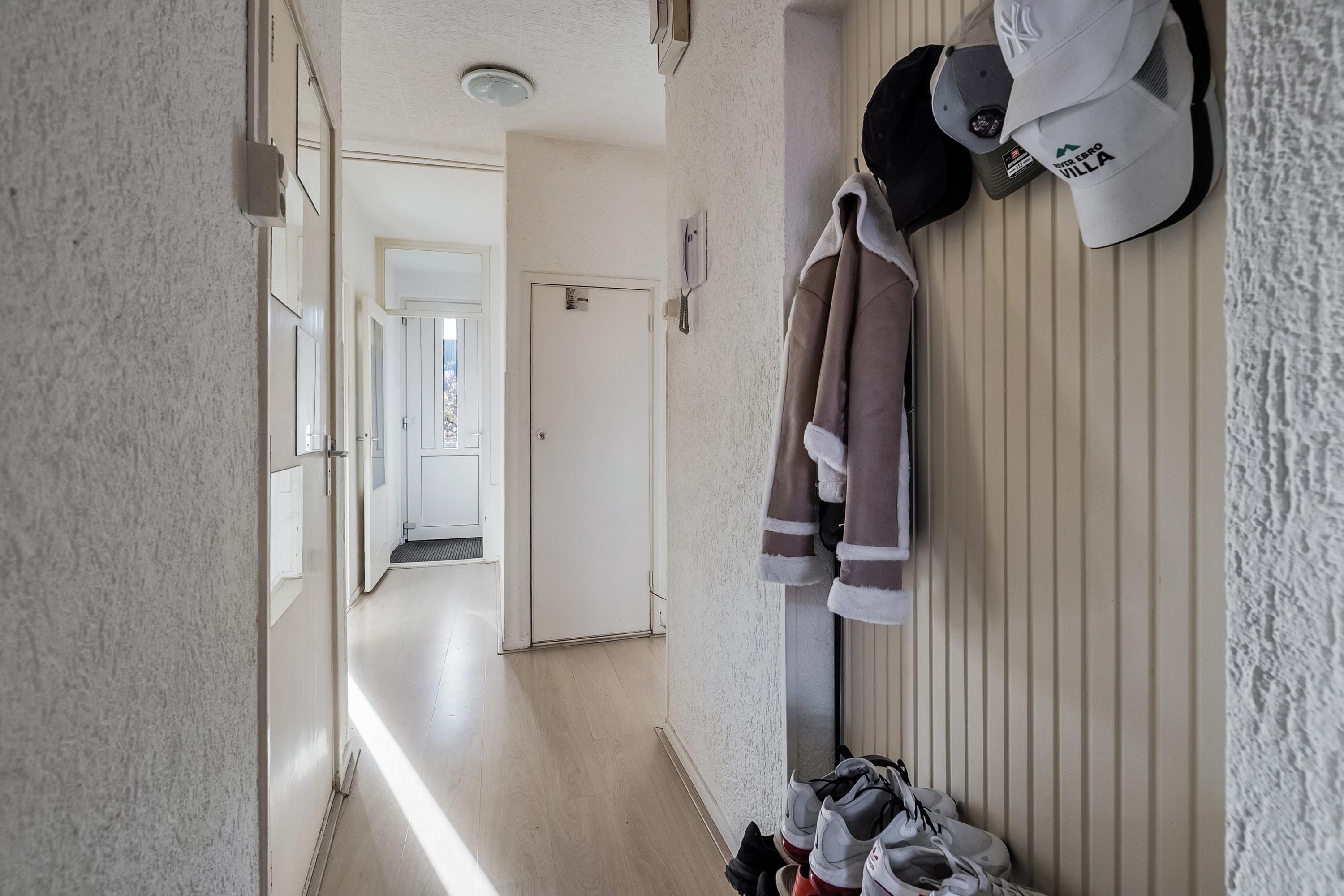 Via de overdekte galerij is het appartement te betreden. Entree, tochtportaal, hal met meterkast, een extra voorraadkast en toegang tot alle vertrekken, toiletruimte voorzien van een duoblok toilet. De toiletruimte is gedeeltelijk betegeld in een neutrale kleurstelling en is afgewerkt met een spotje.