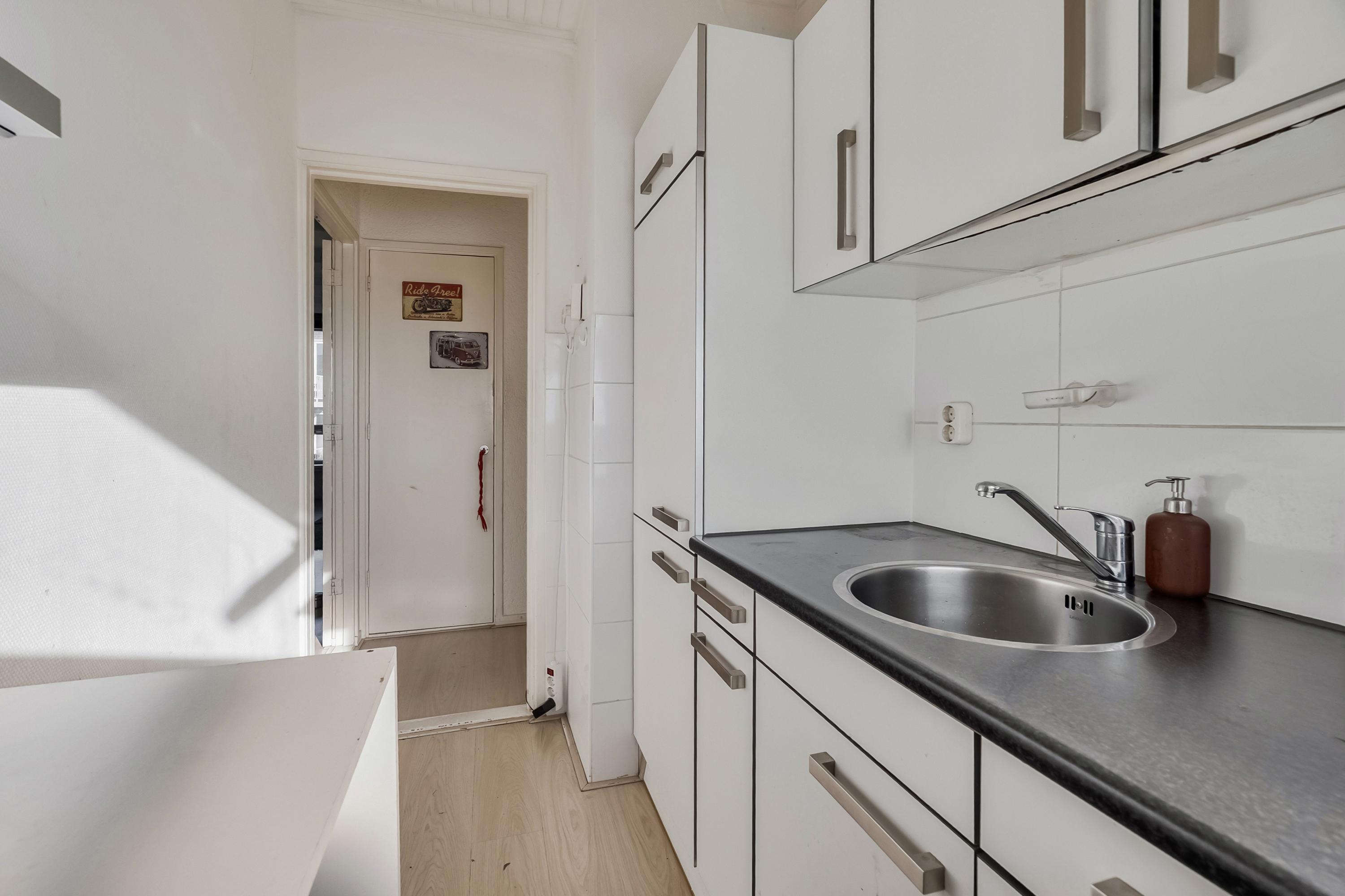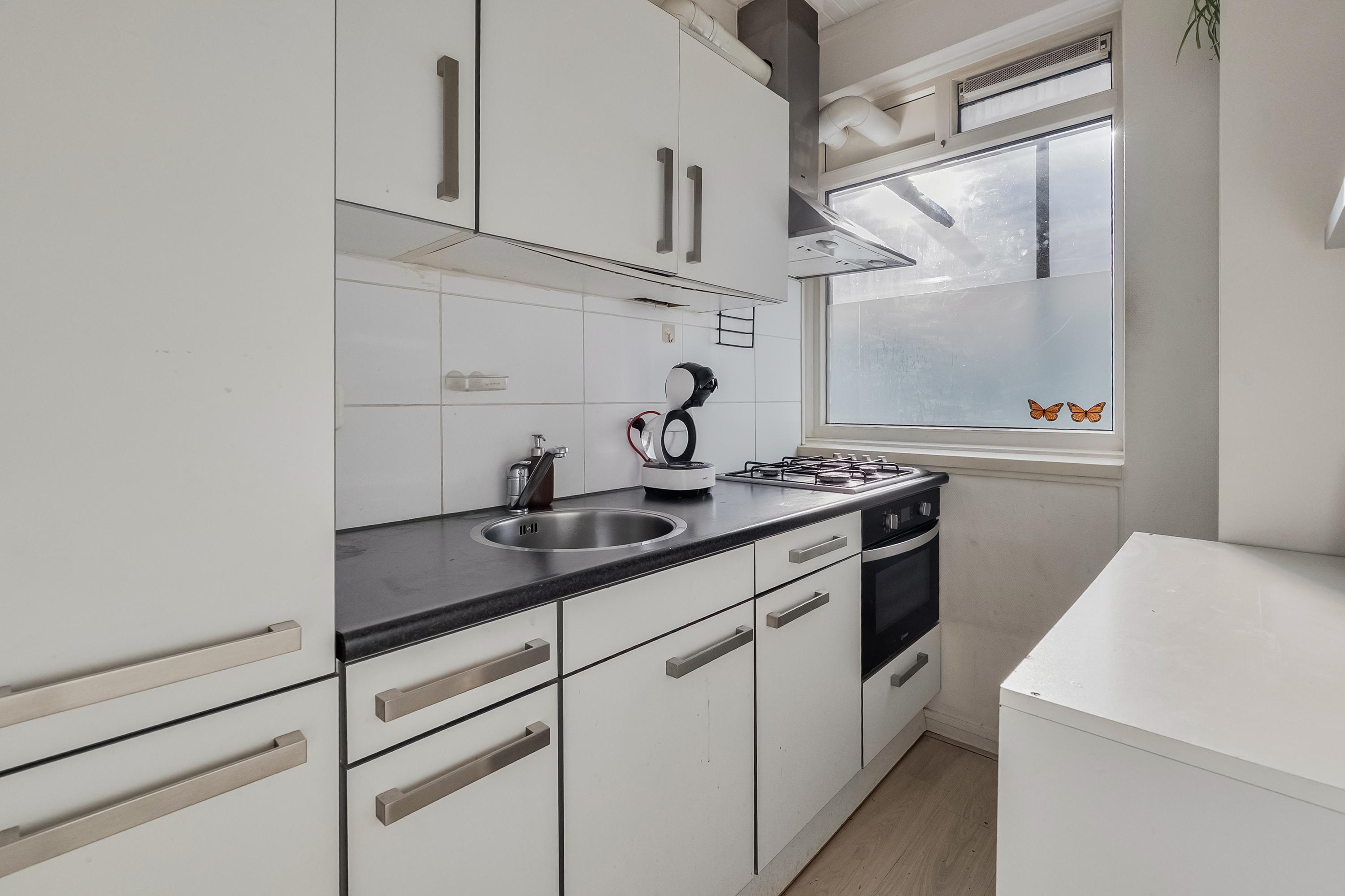De keuken (ca. 5 m2) is gelegen aan de achterzijde van het complex. De keuken is verder uitgevoerd in een rechte opstelling en voorzien van een koelkast, vriezer, 4-pits gaskookplaat, RVS afzuigkap en een oven. Verder is de keuken voorzien van een enkele spoelbak. Het geheel is uitgevoerd in wit en is afgewerkt met een kunststof aanrechtblad en laminaatvloer.