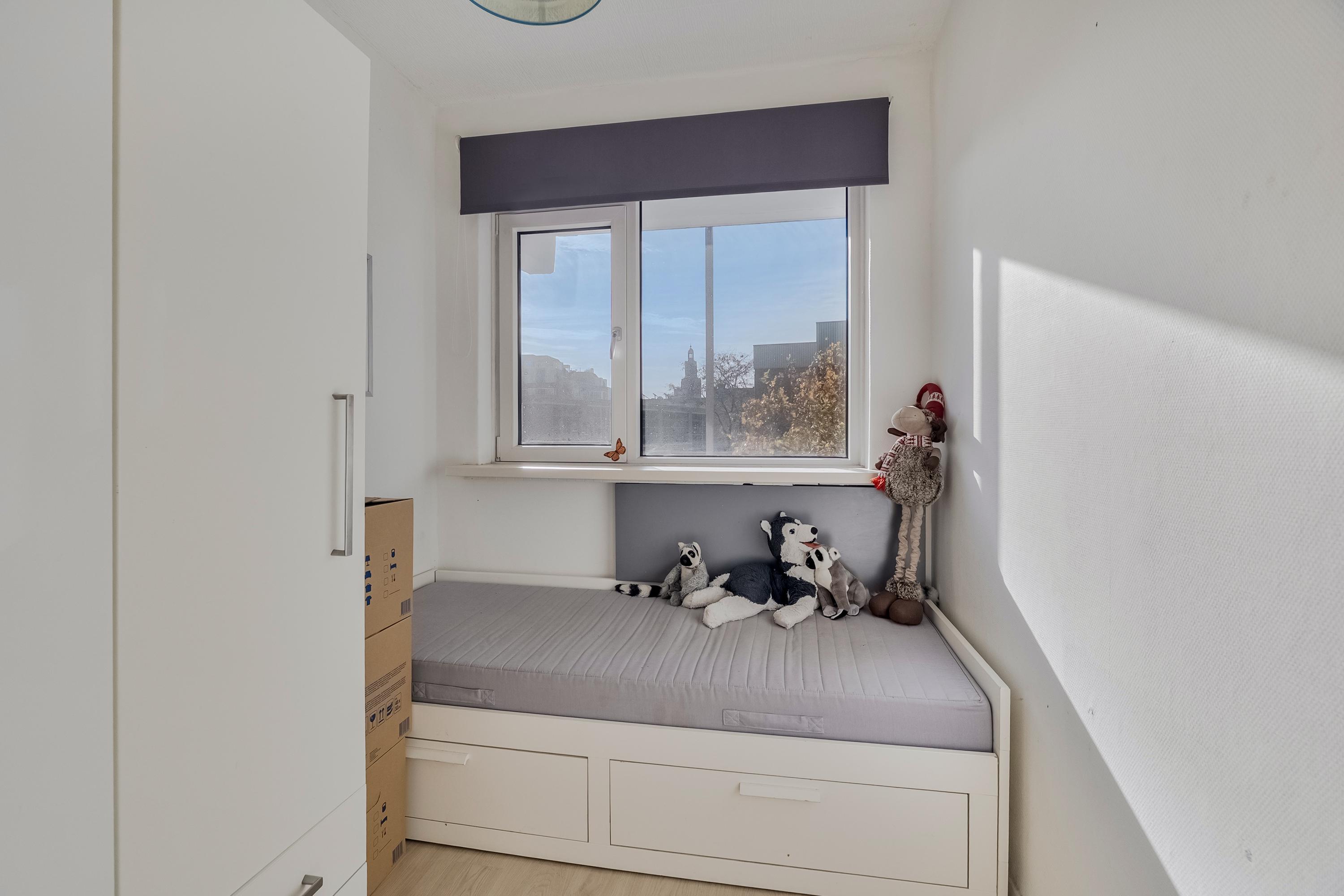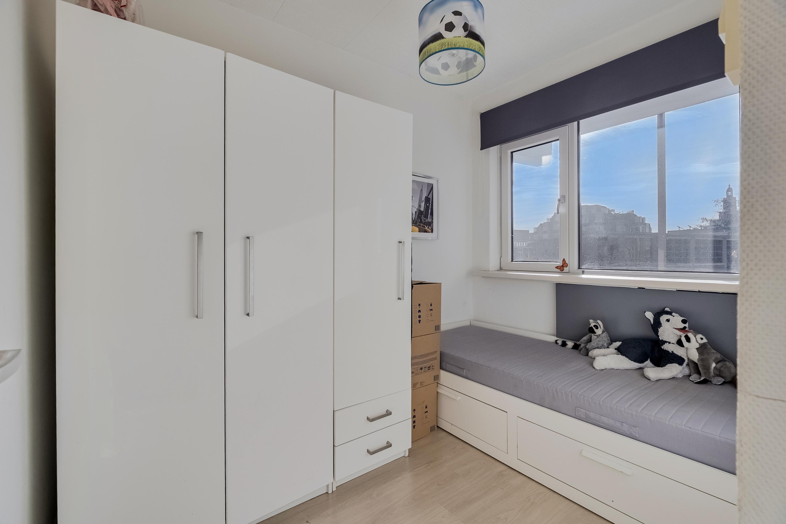 Slaapkamer 2 (ca. 6 m2) is gelegen aan de achterzijde en voorzien van een brede laminaatvloer en een 6-deuren vaste kast.