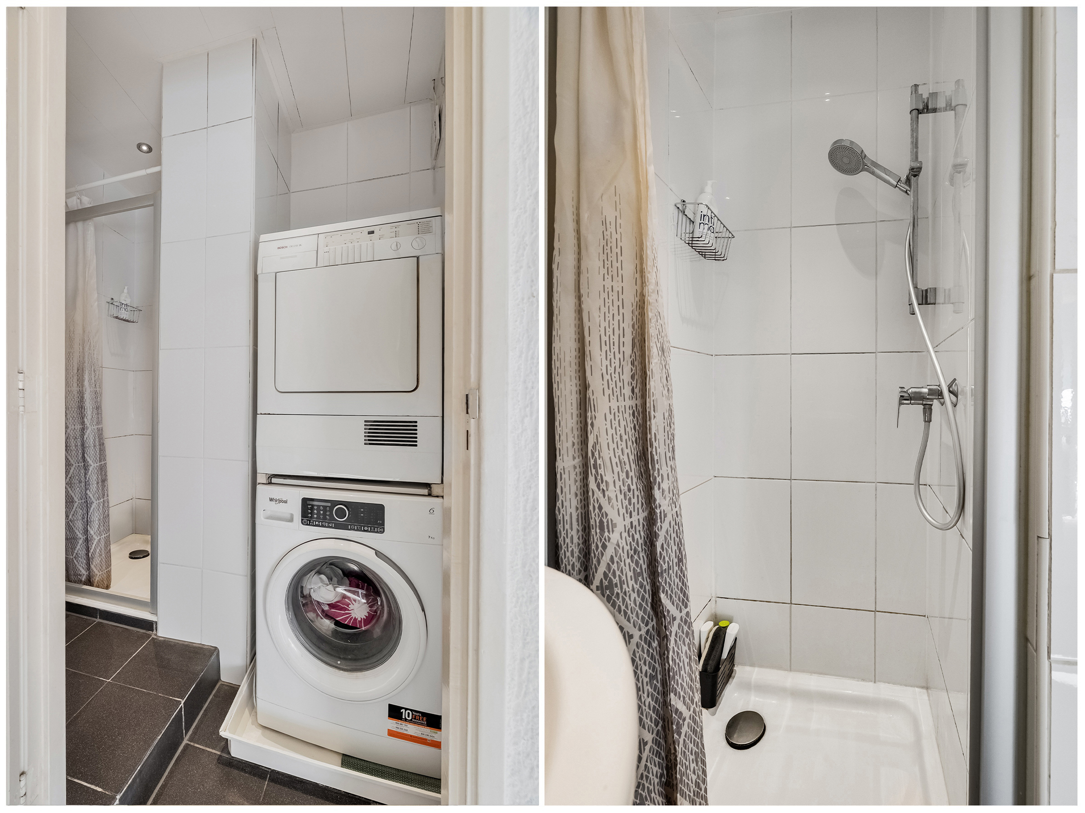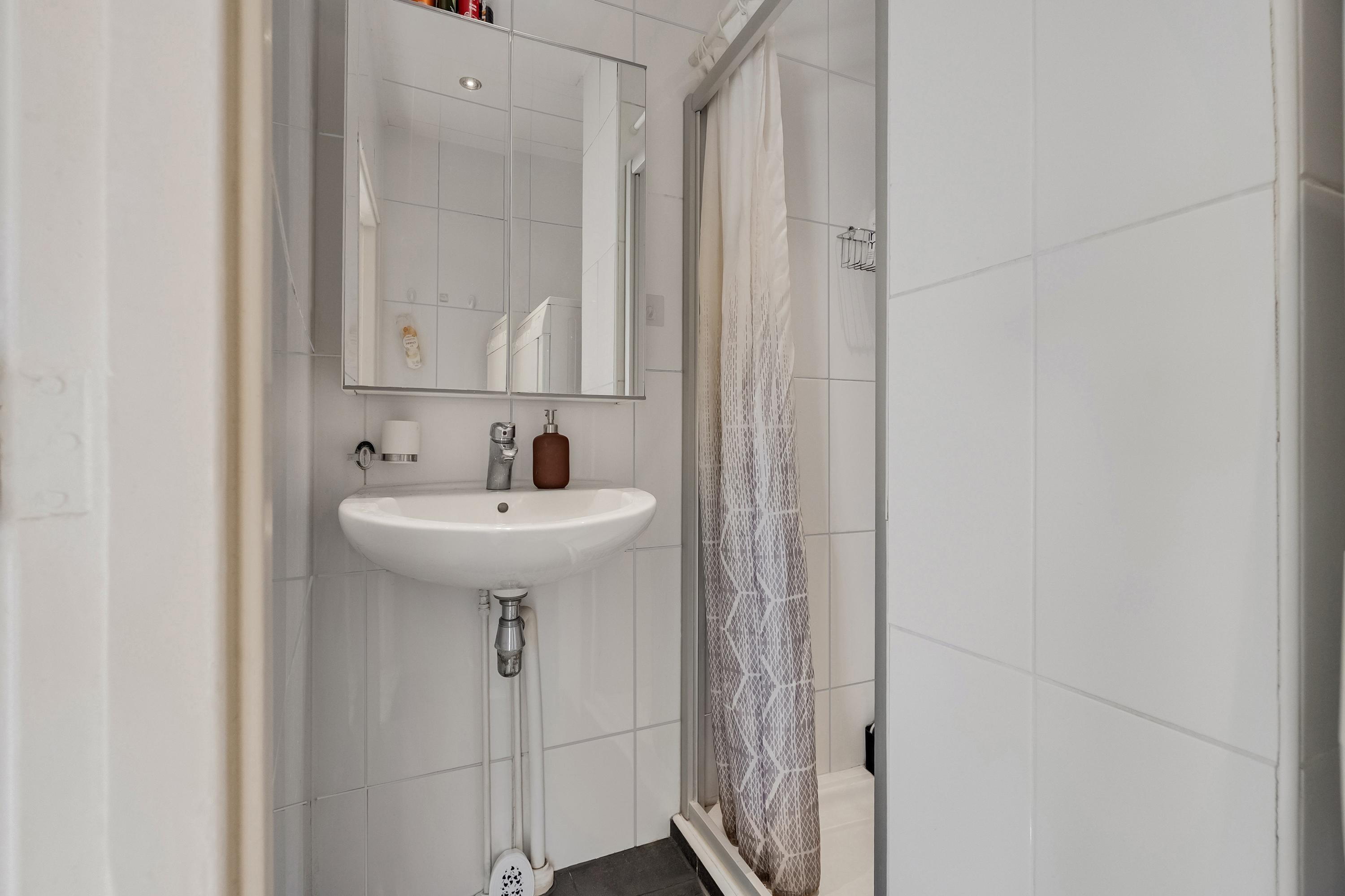 Badkamer (ca. 3 m2) met sanitaire voorzieningen zoals een wastafel, spiegel, designradiator en een douchecabine. Verder is de badkamer voorzien van de wasmachine- en drogeraansluiting. De badkamer is geheel betegeld in een lichte kleurstelling.