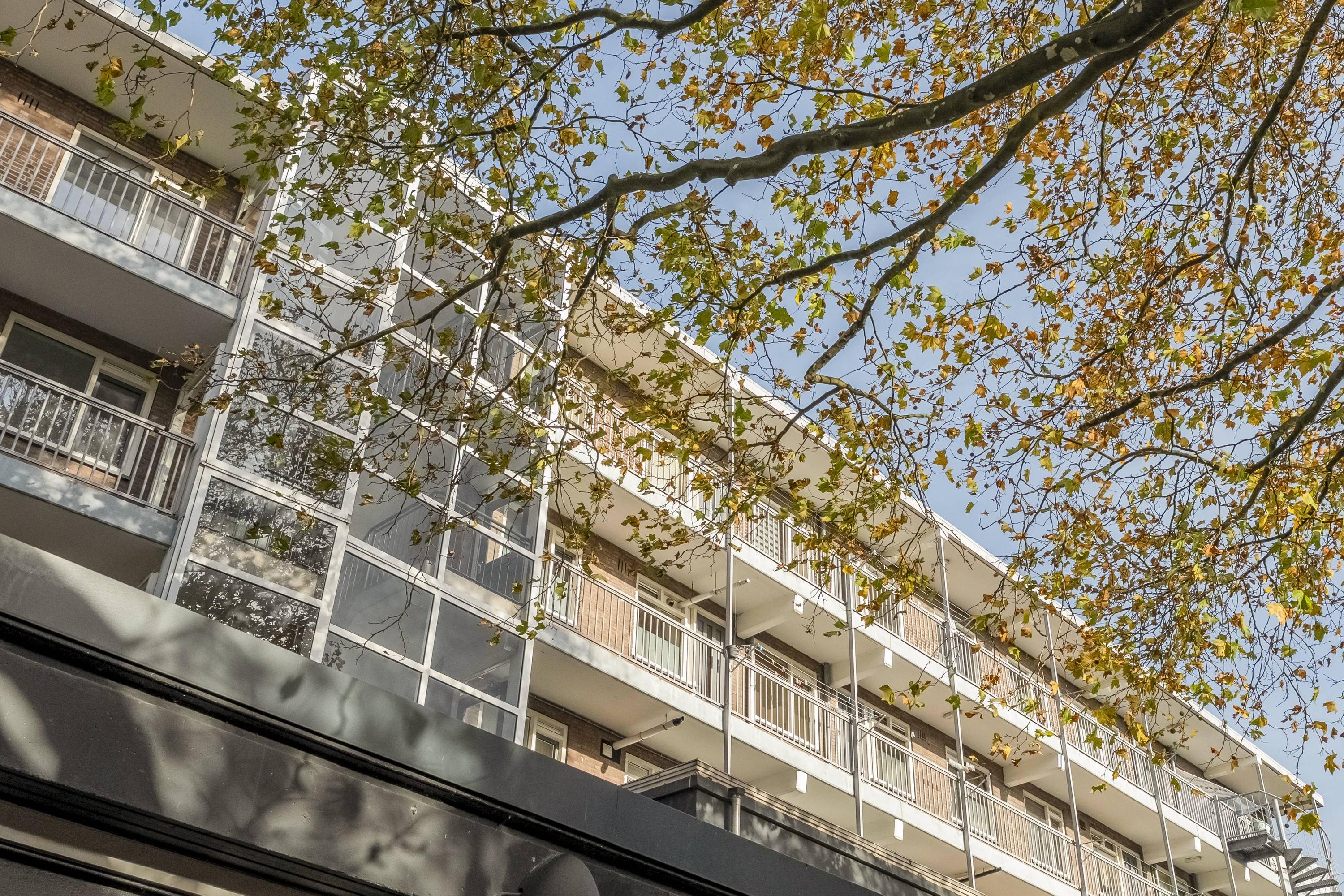 - Balkon aan de voorzijde van het appartementencomplex;