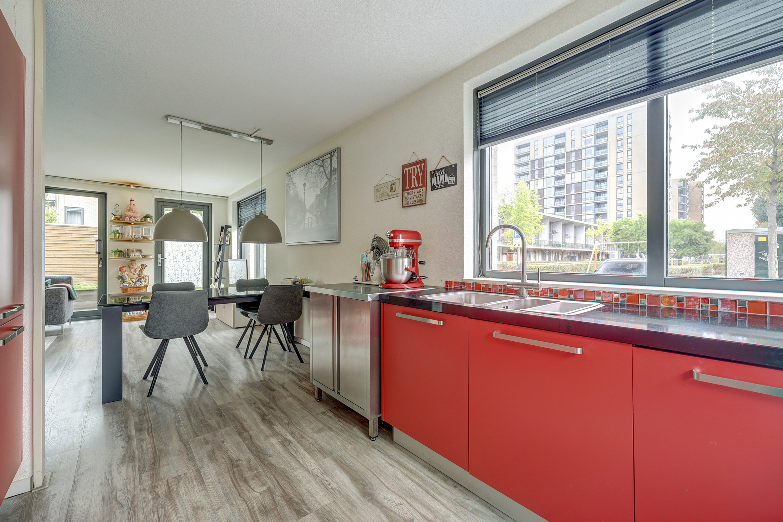 Terug in de woonkamer lopen we naar de voorzijde waar we de Bruynzeel keuken van 2017 in lopen. Het gezellige hart van de woning en een heerlijke ruime keuken waar je uren je gang kunt gaan om prachtige maaltjes te creëren. De keuken, rood uitgevoerd met een mooi natuurstenen keukenblad, is voorzien van diverse inbouwapparatuur zoals de koelkast, vriezer, vaatwasmachine, oven, 5-pits gaskookplaat met afzuigkap en een dubbele spoelbak met mengkraan. Door de vele ramen, zowel aan de voorzijde als de zijkant van de keuken, is het een heerlijk lichte keuken.