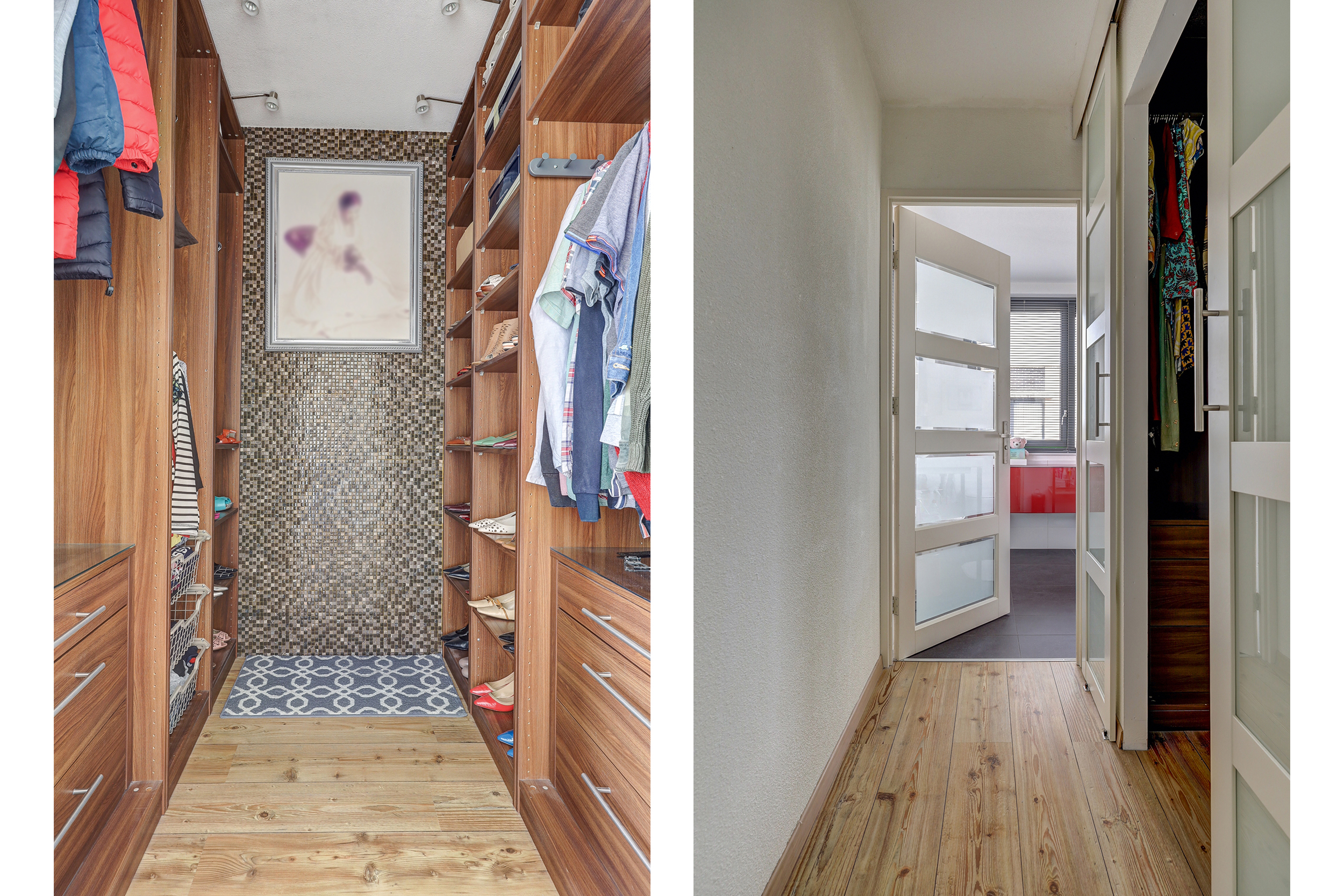 Op de tweede verdieping komen we aan op de overloop en lopen we de slaapkamer in. Wow, wat een ruimte, perfect als ouderslaapkamer. Je kunt er met gemak een riant tweepersoons bed kwijt en daarnaast een mooie grote kaptafel of nog wat kasten. Om de hoek heb je toegang tot de walk-in-closet en daarna loop je de badkamer binnen. Die is ook riant en is voorzien van een grote inloopdouche, een grote wastafel met mengkraan en meubel eronder en een grote spiegel erboven. Tevens treffen we ook hier een designradiator en het derde toilet! Door het enorme raam is dit een heerlijk lichte badkamer!