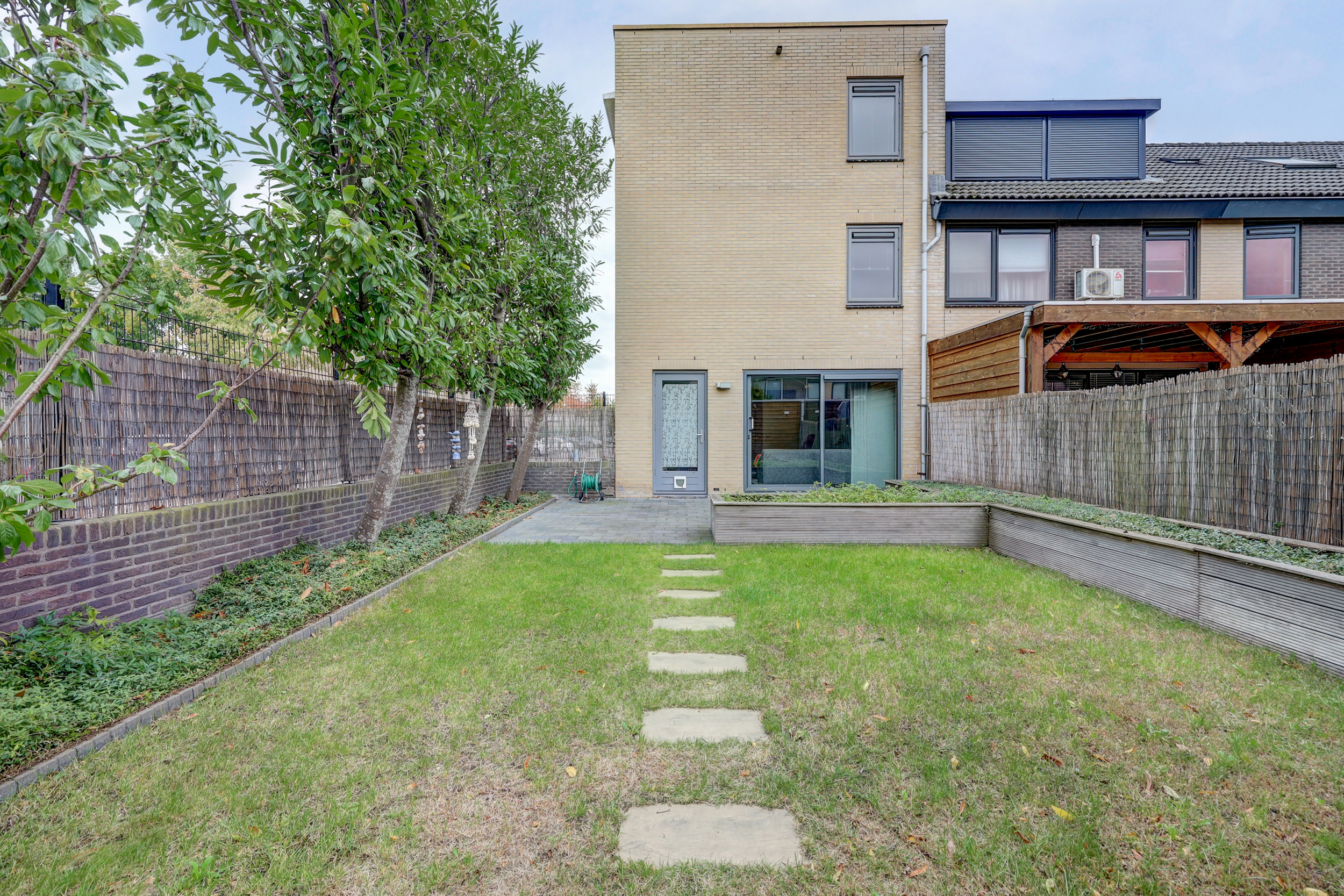 Aan de achterzijde kun je zowel via de deur als via de schuifdeur de tuin in! De mooi aangelegde tuin die maar liefst 13,5 meter diep is, is met ca. 107 m2 riant te noemen. De tuin ligt op het noorden en oosten en door de diepte van de tuin heb je nagenoeg de hele dag zon in de tuin. De tuin is deels betegeld waardoor je goed een grote eettafel en loungehoek kwijt kunt, en deels voorzien van gras. Achterin de tuin is ruimte voor de afvalbakken en via de achterom zet je je fiets in de berging waar je waarschijnlijk ook de kussens van de meubels opslaat. Zowel de voor-, zij- als achtertuin zijn netjes onderhouden.