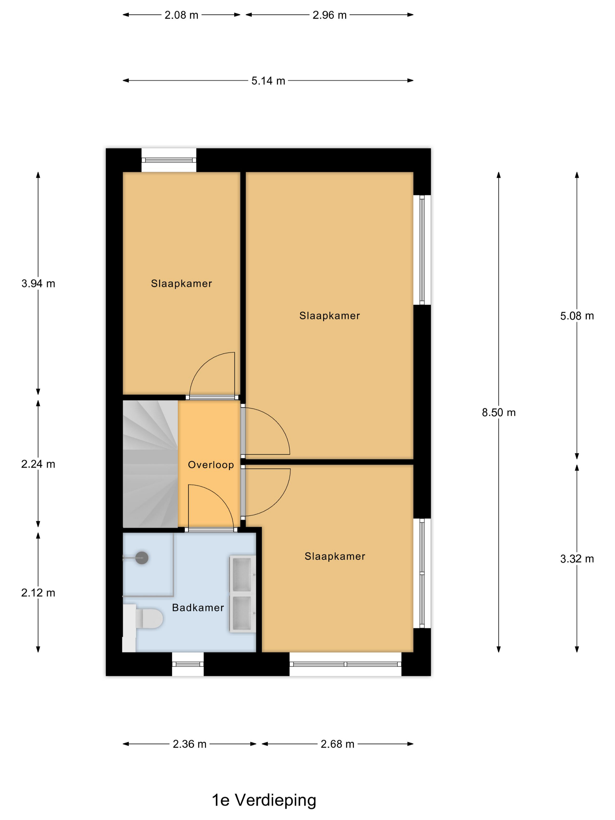 Via de vaste trap bereik je de overloop van de eerste verdieping. Hier treffen we een drietal ruime slaapkamers en de eerste moderne badkamer. De slaapkamers zijn respectievelijk 15, 9 en 8 m2 groot. De badkamer is uitgerust met een dubbele wastafel met wastafelmeubel, twee moderne mengkranen en een grote spiegel erboven met zowel een ingebouwde klok als verlichting. Daarnaast is er een grote inloopdouche, designradiator en een tweede toilet aanwezig. Een erg fijne, ruimtelijke badkamer.