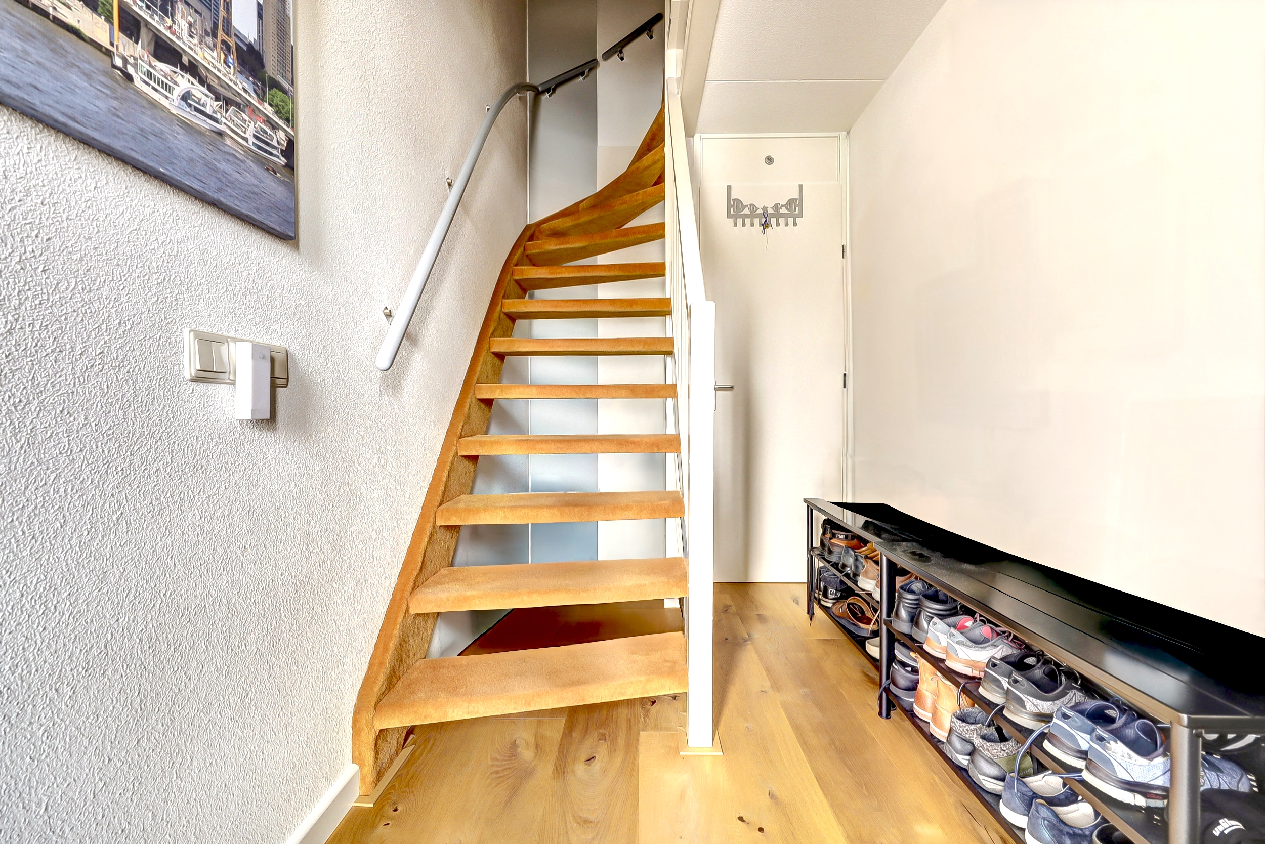 Via de entree komt u binnen in de hal van de woning. De hal is prettig van formaat en biedt voldoende ruimte voor een garderobe. Vanuit de hal zijn de meterkast en de trap naar het woongedeelte bereikbaar. Een praktische binnenkomst die direct toegang geeft tot de rest van de woning.