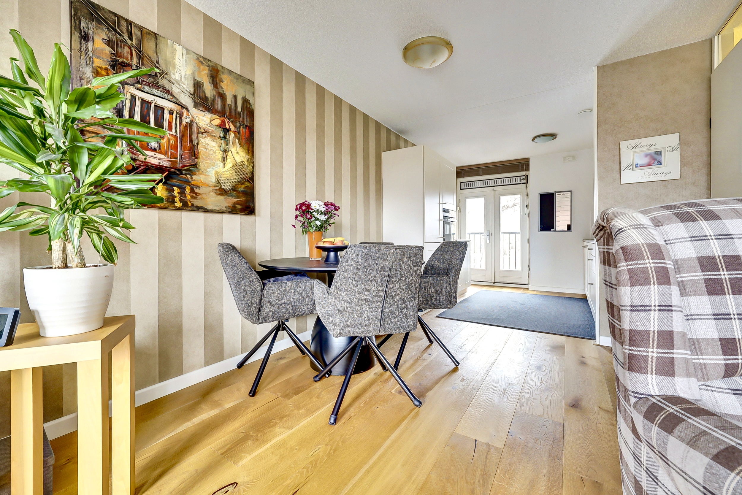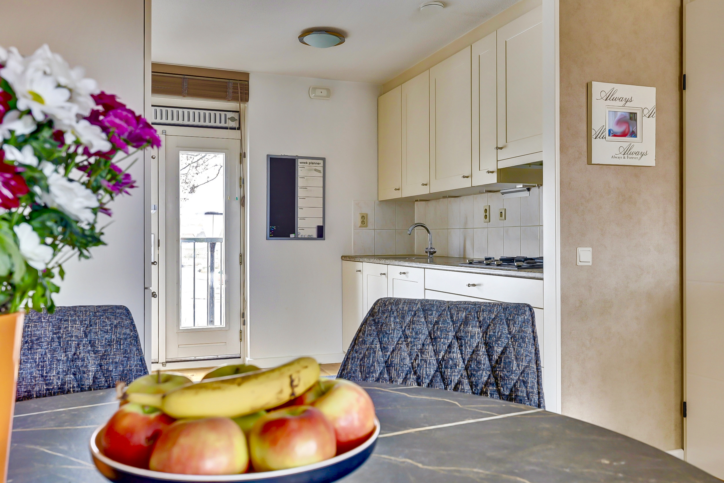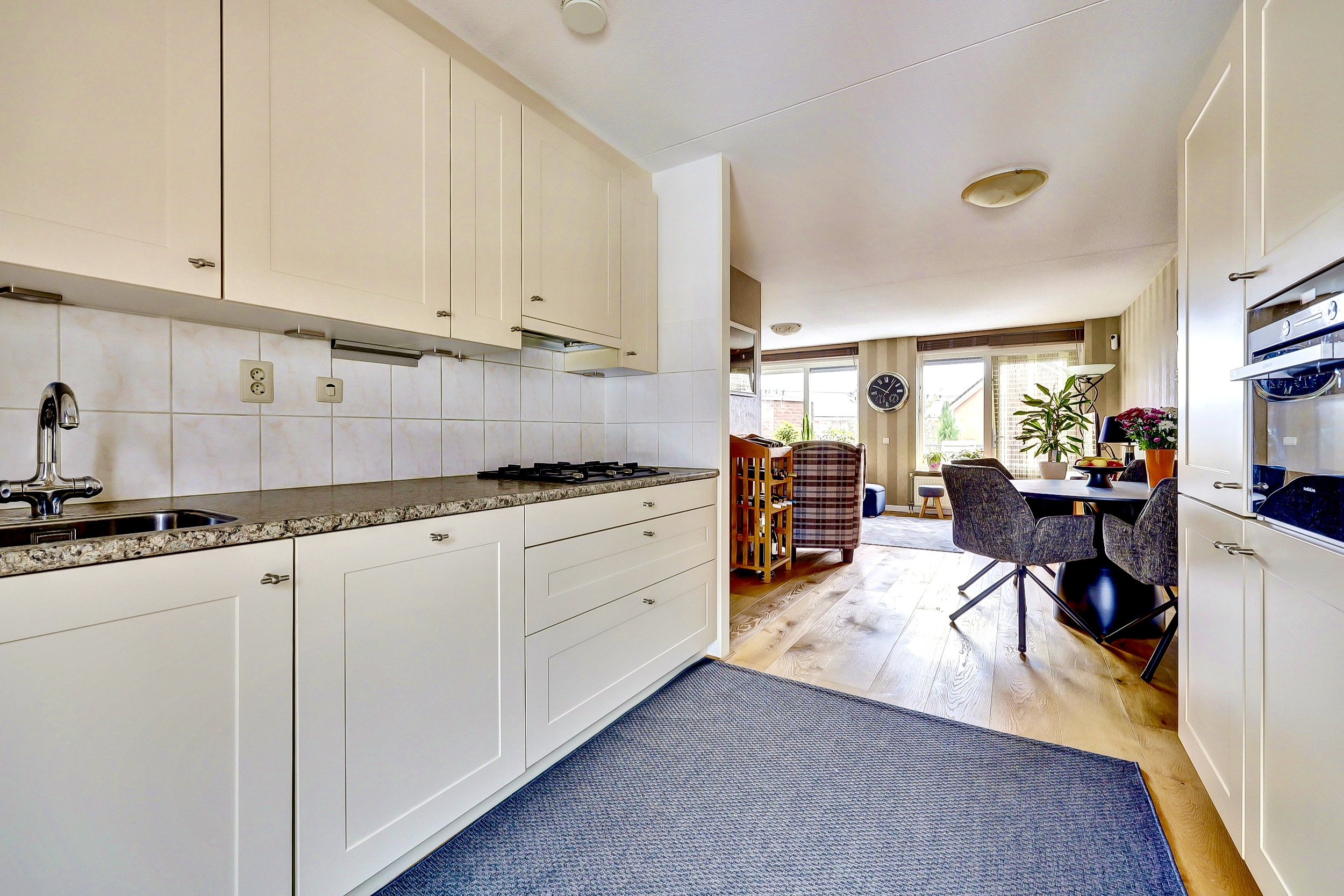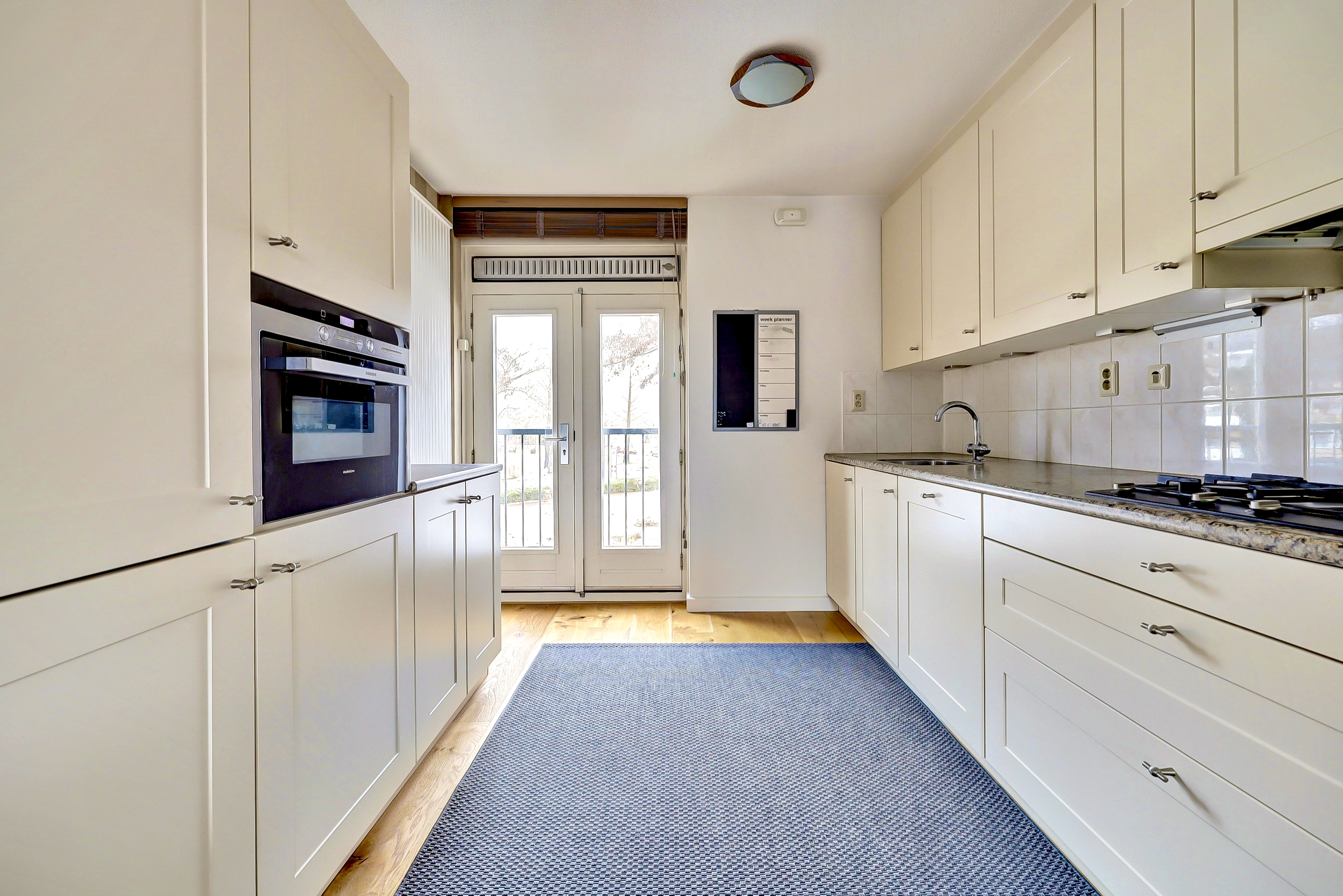 De open keuken is gesitueerd aan de voorzijde van de woning en beschikt over openslaande deuren met een Frans balkon en vrij uitzicht. Dit zorgt voor veel licht en een ruimtelijk gevoel tijdens het koken. De keukenopstelling en de aanwezige apparatuur dateren uit 2015 en de keuken is voorzien van een 4-pits gasfornuis, afzuigkap, combimagnetron, koelkast, vriezer en een vaatwasser. Daarnaast is er een praktische plek gecreëerd voor keukenapparatuur zoals een koffiezetapparaat, waterkoker of een keukenmachine, waardoor de keuken prettig en overzichtelijk in gebruik is.