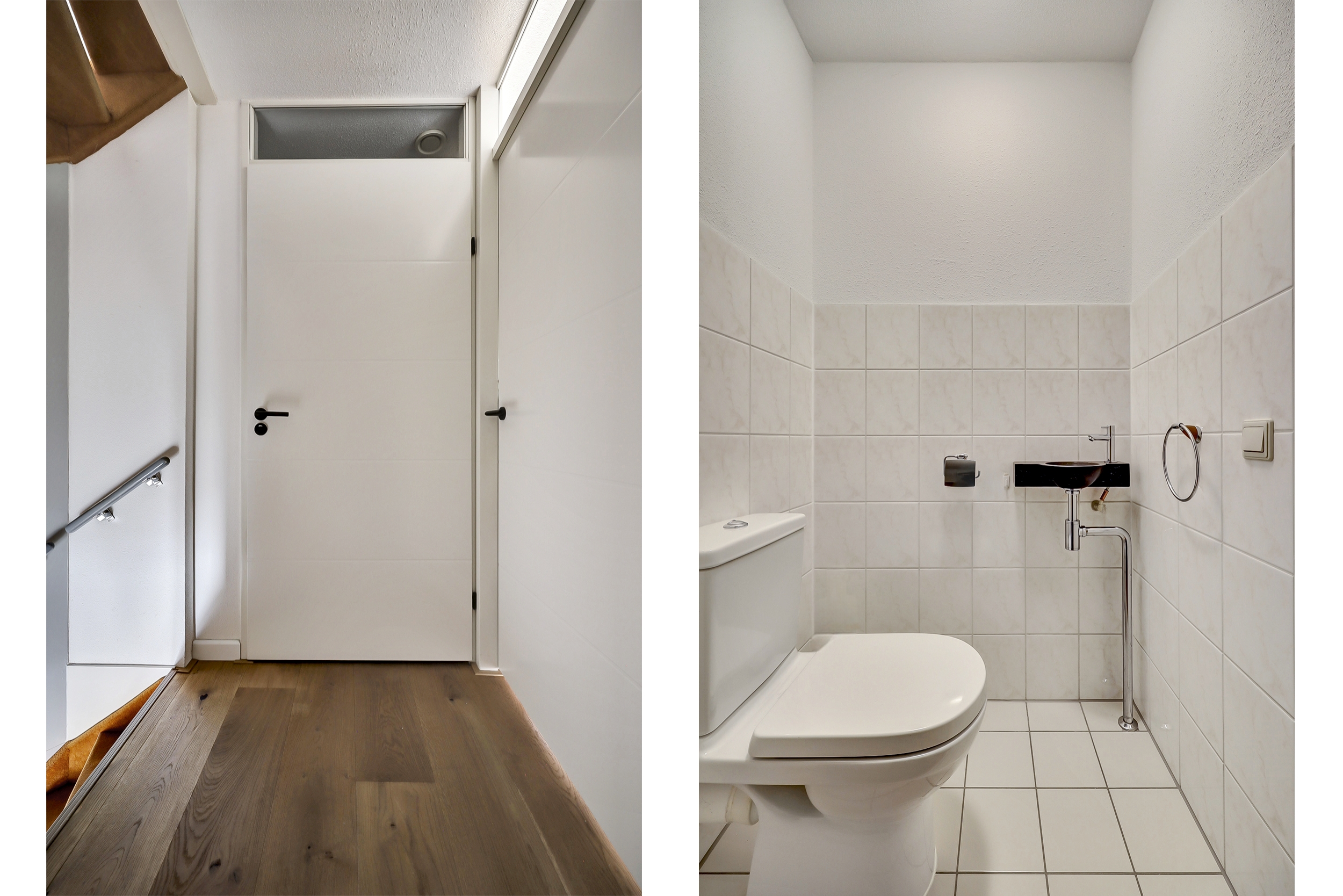 Op de overloop van het woongedeelte bevindt zich het toilet. Deze ruimte is half betegeld en in 2024 voorzien van een nieuw geplaatst toilet en een nieuw fonteintje.