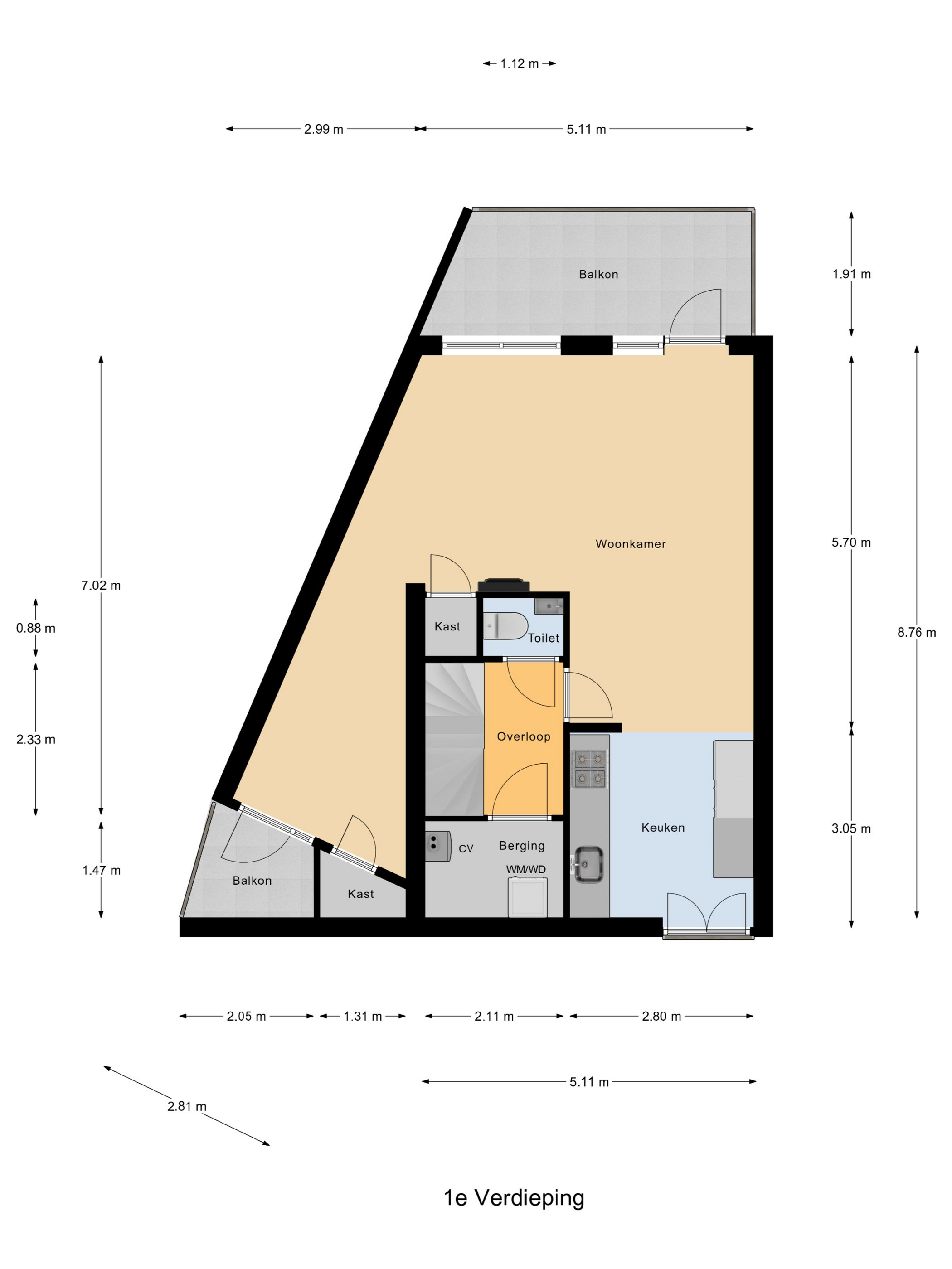 Het centrale woongedeelte vormt het hart van deze verdieping en biedt volop ruimte voor een comfortabele zithoek. In de woonkamer is een vaste inbouwkast aanwezig en vanuit de woonkamer is er toegang tot het balkon, gelegen op het zuidwesten. Dit balkon biedt voldoende ruimte voor een tafel en stoelen en is een fijne plek om te genieten van de zon en het buitenleven.
