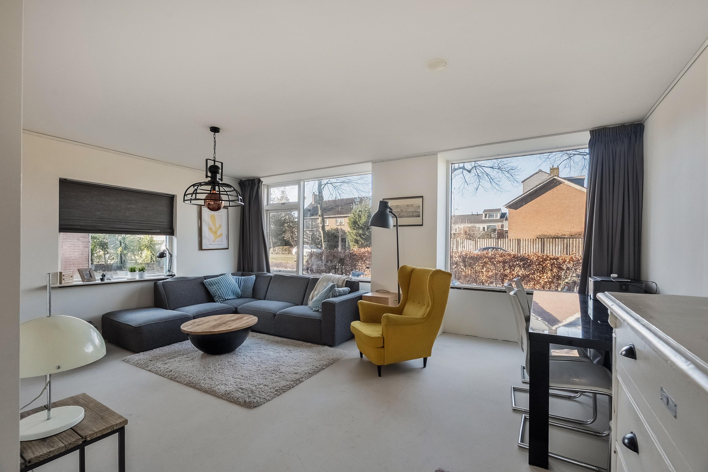 De woonkamer is royaal opgezet en gelegen aan de voorzijde van de woning. Dankzij de vele ramen is dit een bijzonder lichte en aangename leefruimte. De wanden en het plafond zijn strak gestuukt en er is een handig ophangsysteem aanwezig voor lijsten of schilderijen. In 2025 is de vloer geëgaliseerd en voorzien van comfortabele vloerverwarming.