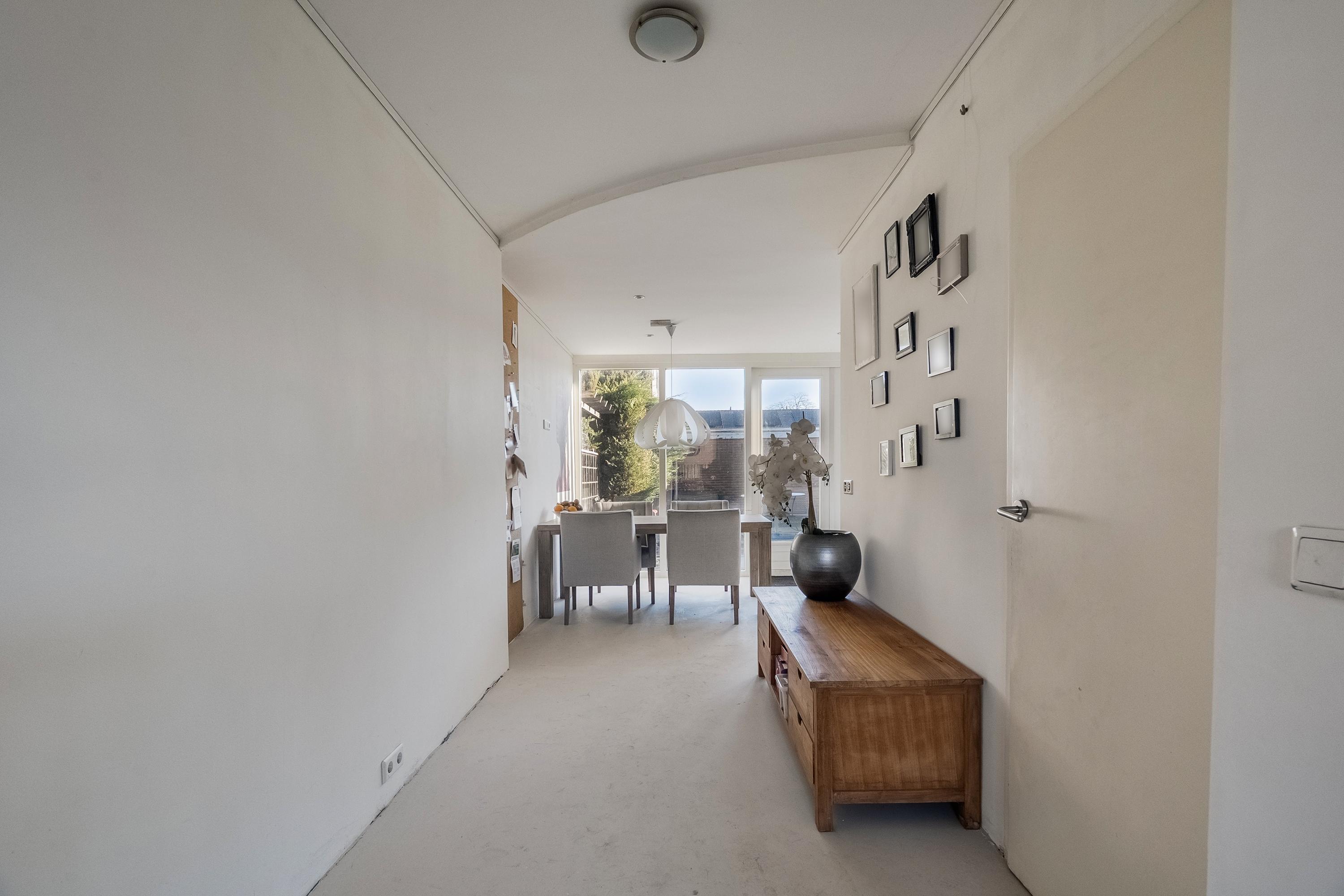 Via de entree komt u in de ruime en lichte hal met een praktische gangkast waarin zich tevens de meters bevinden. De hal biedt veel opbergruimte en toegang tot de trap naar de eerste verdieping. De toiletruimte is in 2025 vernieuwd en voorzien van een hangend toilet, fonteintje, lichte wand- en vloertegels en sfeervolle inbouwverlichting.