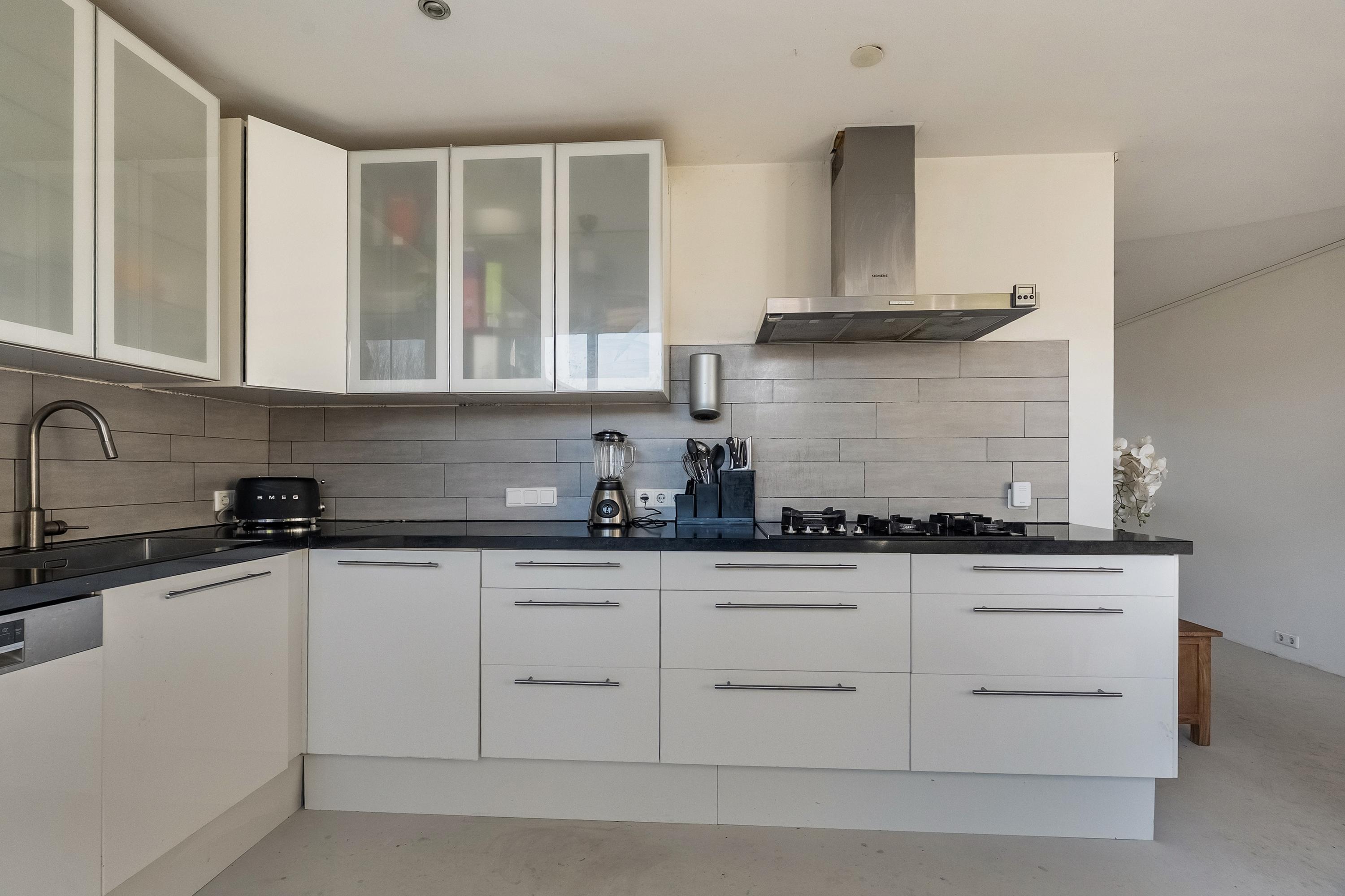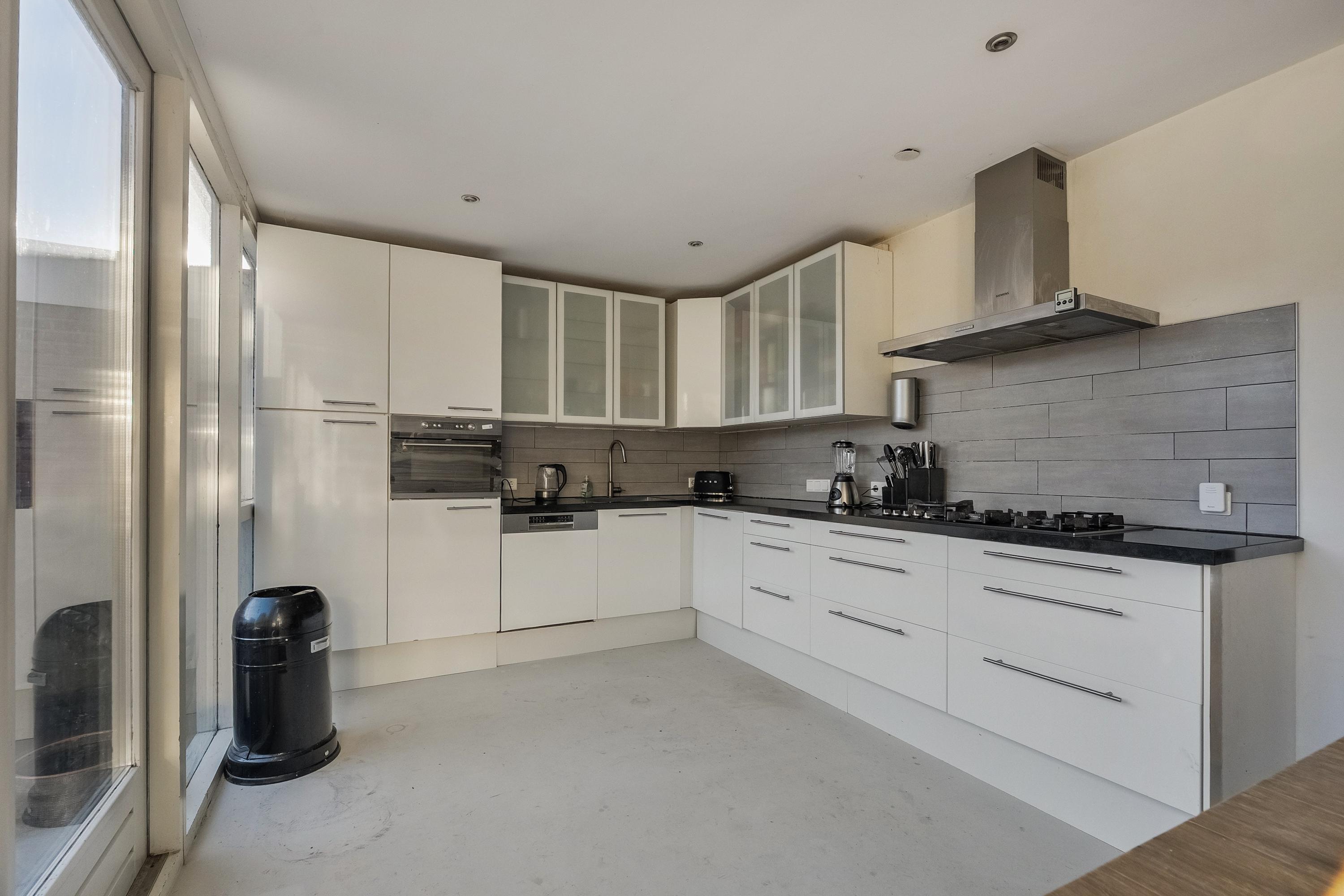 Aan de achterzijde bevindt zich de ruime, open woonkeuken in L-opstelling. Deze moderne keuken is uitgevoerd in hoogglans wit en afgewerkt met een composiet aanrechtblad. De keuken is voorzien van diverse inbouwapparatuur, waaronder een koelkast, vrieskast, 5-pits gaskookplaat, extra brede RVS afzuigkap, combimagnetron met heteluchtovenfunctie en een vaatwasser. Verder beschikt de keuken over een grote 1,5 spoelbak, carrouselkast, veel inbouwstopcontacten en geïntegreerde verlichting in de kastjes. Via de openslaande deuren heeft u direct toegang tot de achtertuin, waardoor binnen en buiten naadloos in elkaar overlopen.