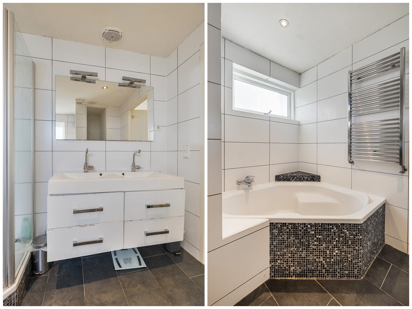 De ruime badkamer is compleet uitgevoerd en voorzien van een dubbel wastafelmeubel met spiegel en verlichting, een hangend tweede toilet, ingebouwde spotjes, een hoekligbad en een aparte douchecabine. De gehele eerste verdieping is voorzien van HR++ beglazing (2018).