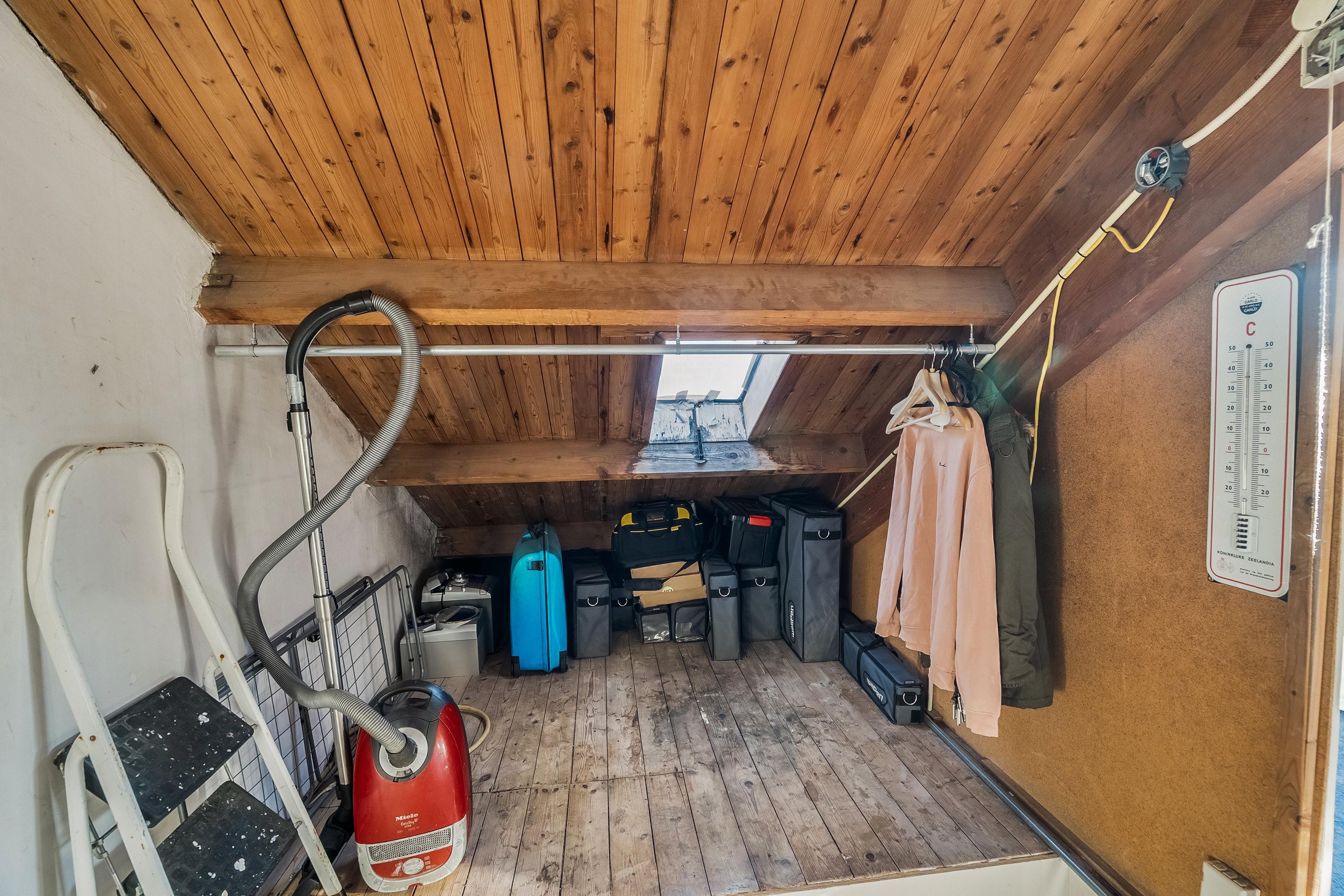 De voorzolder beschikt over veel bergruimte, een dakraam en de opstelplaats voor de HR C.V. combiketel (2013). Tevens zijn hier de aansluitingen voor wasmachine en droger aanwezig.