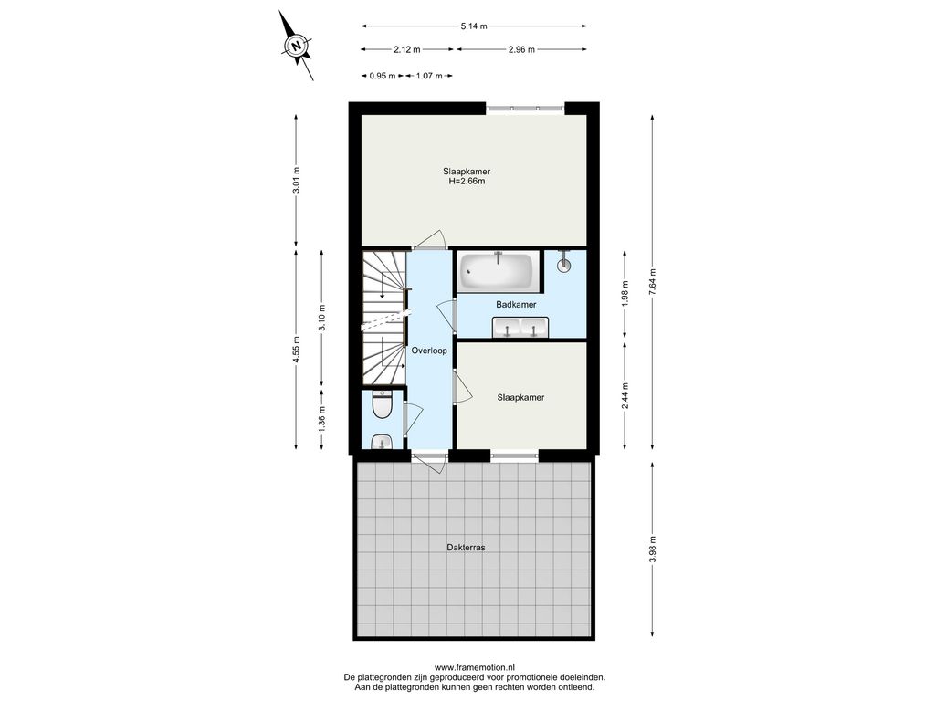 Overloop met toegang tot de slaapkamers, de badkamer, het tweede toilet en het grote dakterras.