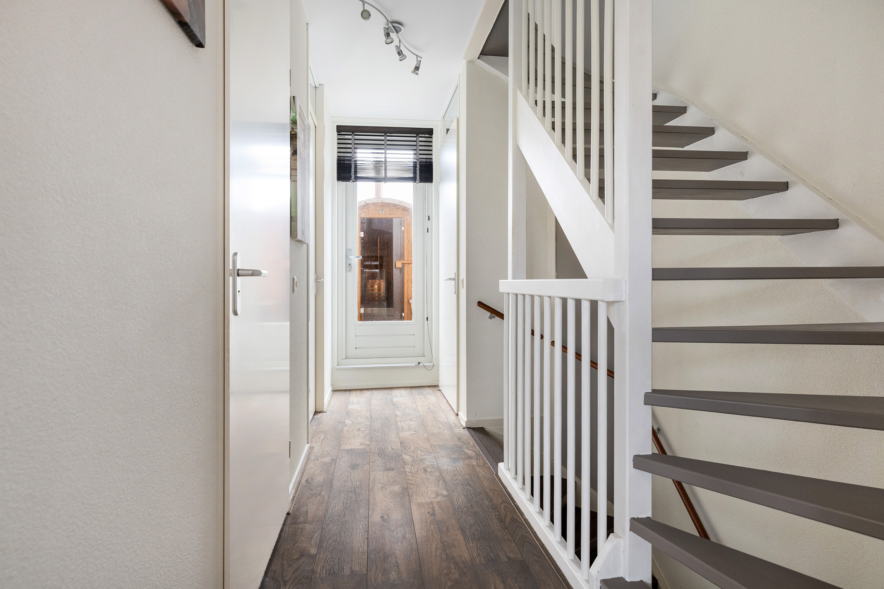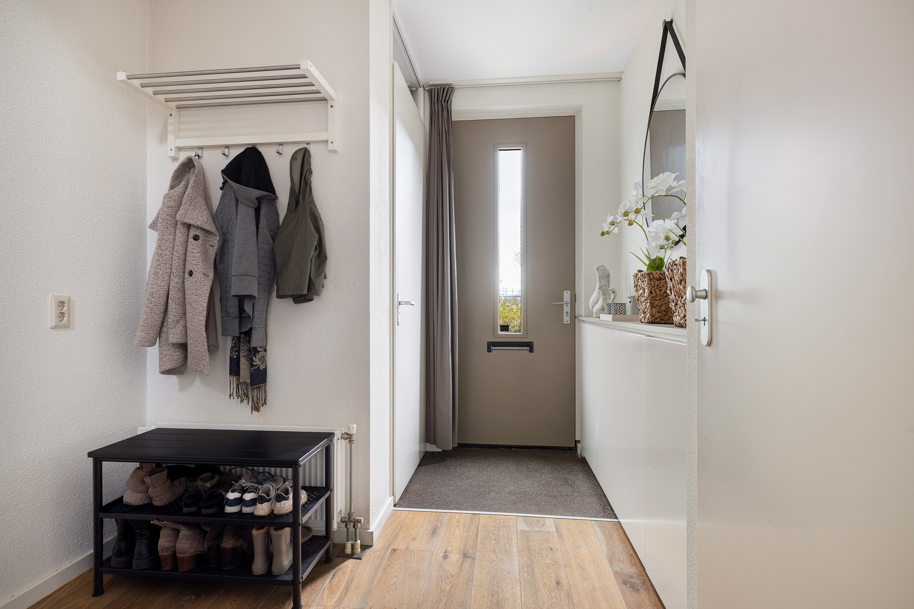Via de verzorgde voortuin bereikt u de entree. In de hal bevinden zich de meterkast, trapopgang met verlichting en een moderne toiletruimte met hangcloset en fonteintje, geheel betegeld in een beige kleurstelling.