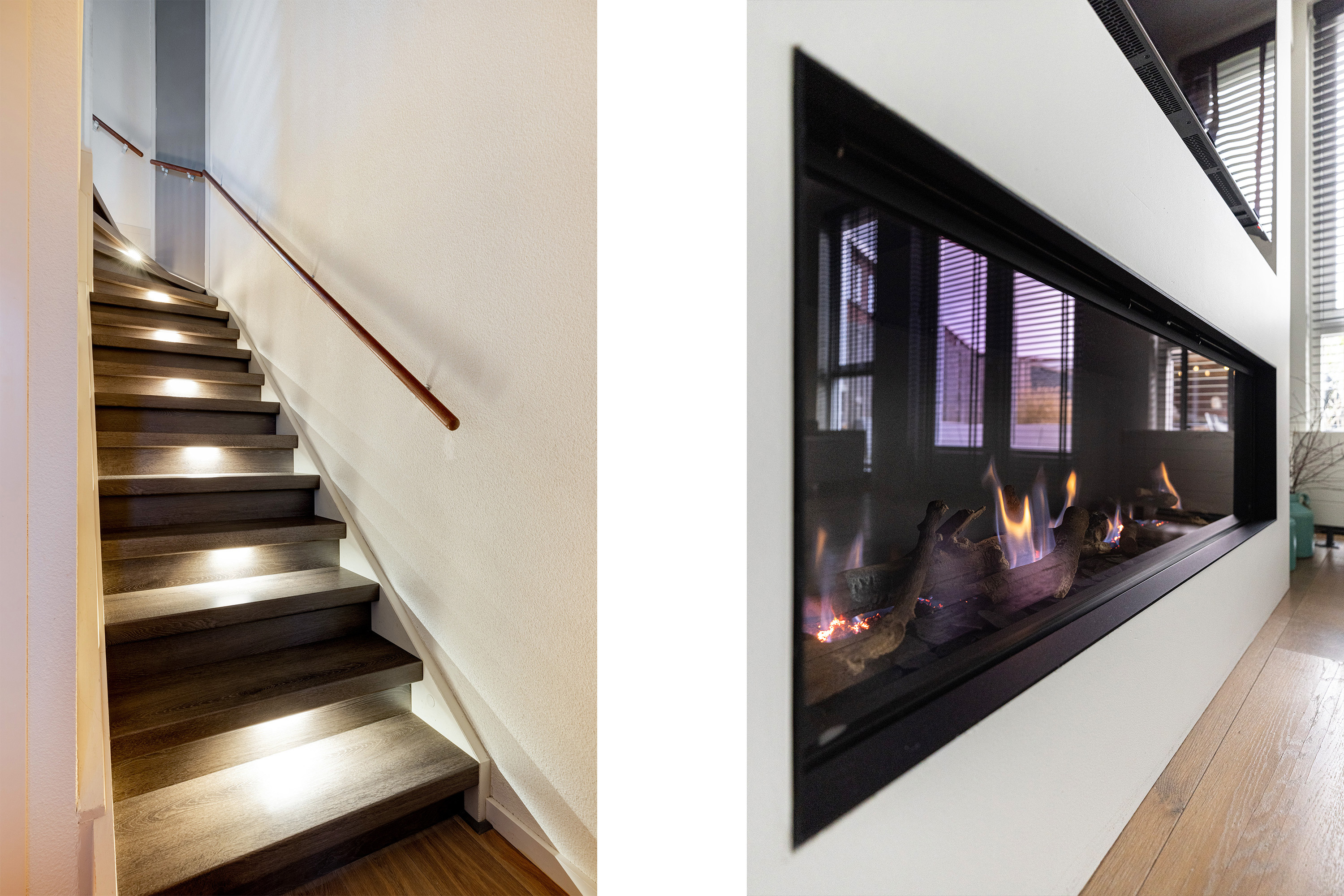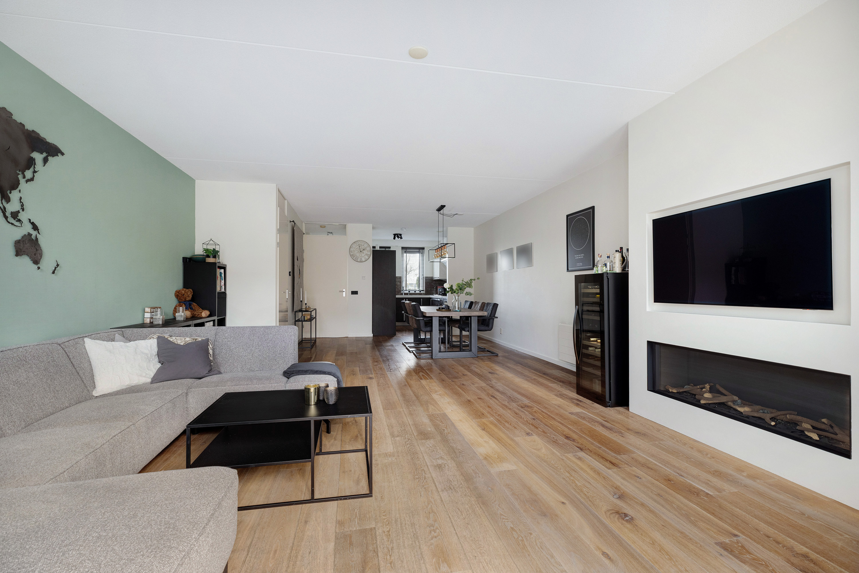 De uitgebouwde woonkamer is een heerlijke, ruime leefruimte met een fraaie cinewall voor de tv en een brede gashaard. De houten vloer en openslaande deuren naar de tuin zorgen voor een warme en luxe uitstraling. Onder de trap bevindt zich een praktische trapkast.