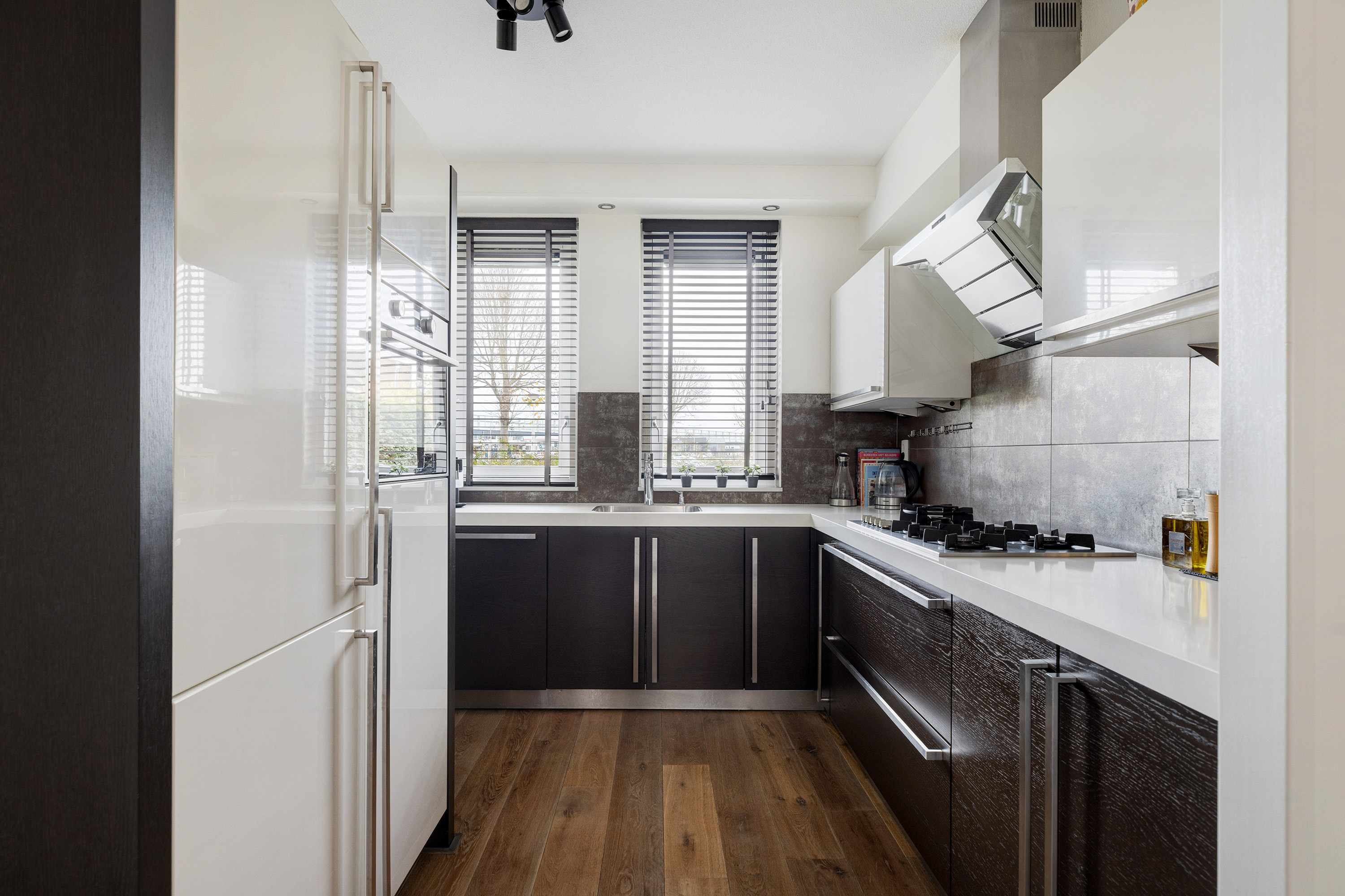 Aan de voorzijde is de open keuken, uitgevoerd in wit/bruin kleurstelling met een hoekopstelling en een aparte hoge kast met koel-/vriescombinatie en combi-oven. Verder compleet met een 5-pits gaskookplaat, RVS afzuigkap met glas, vaatwasser en veel bergkasten.