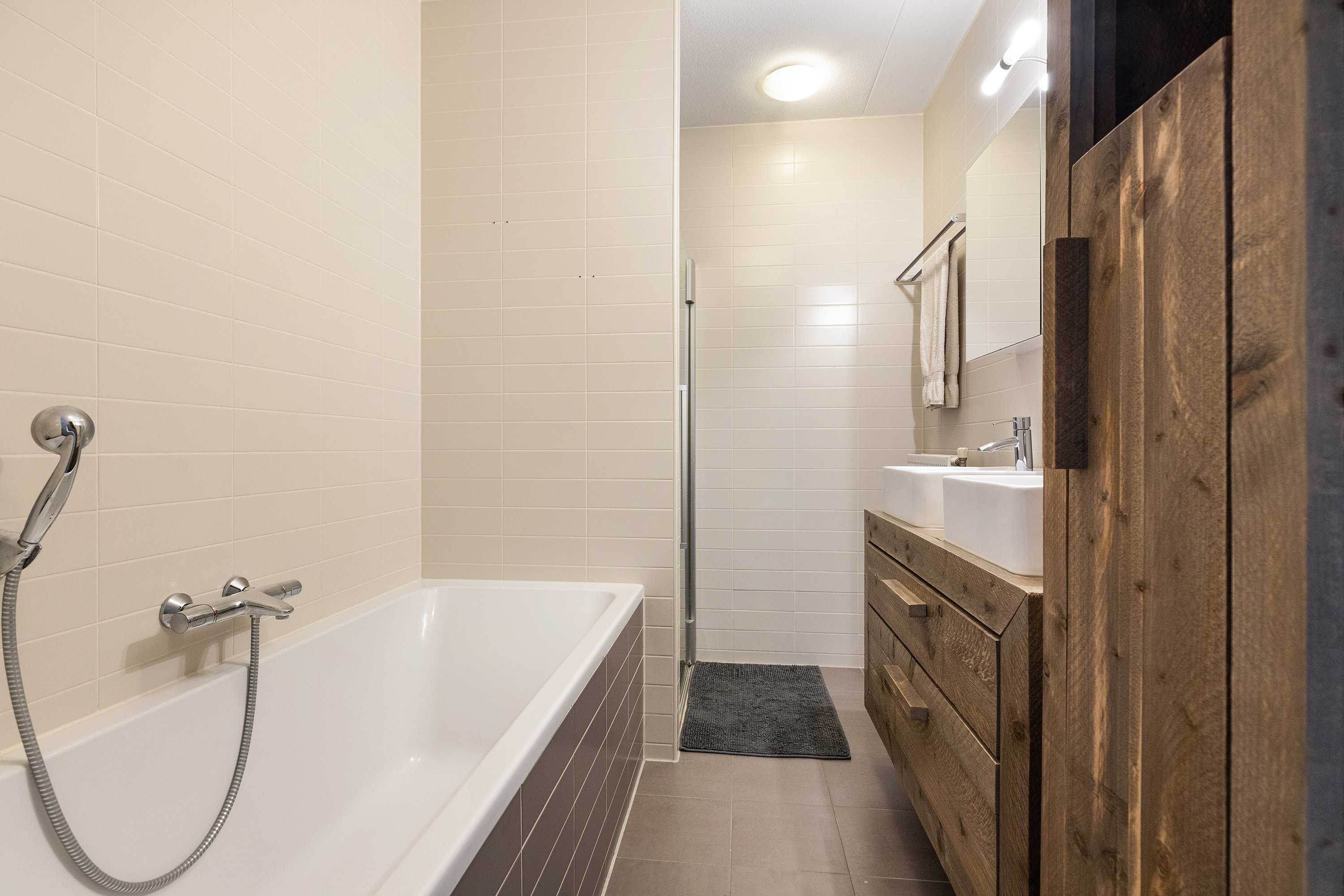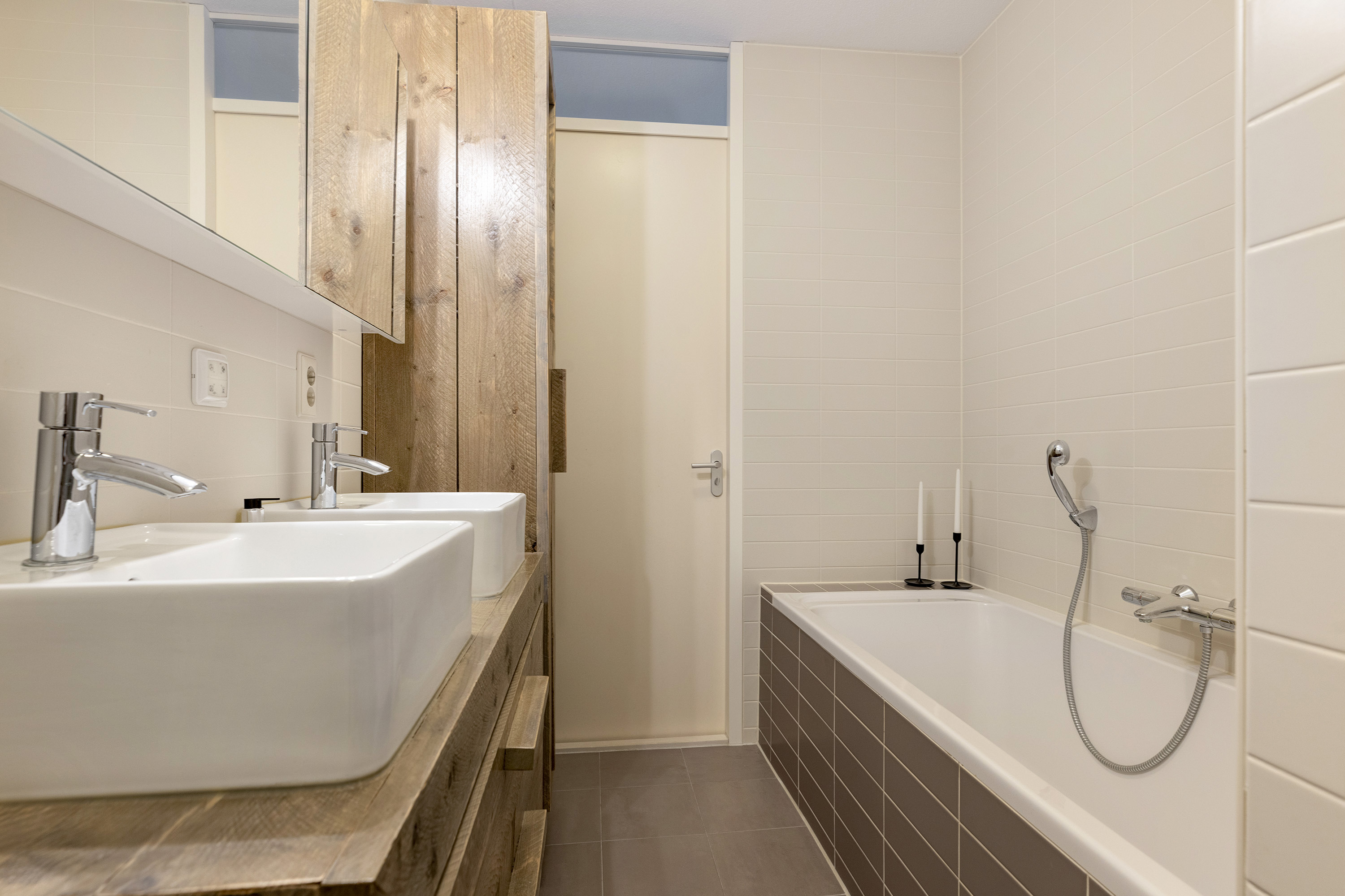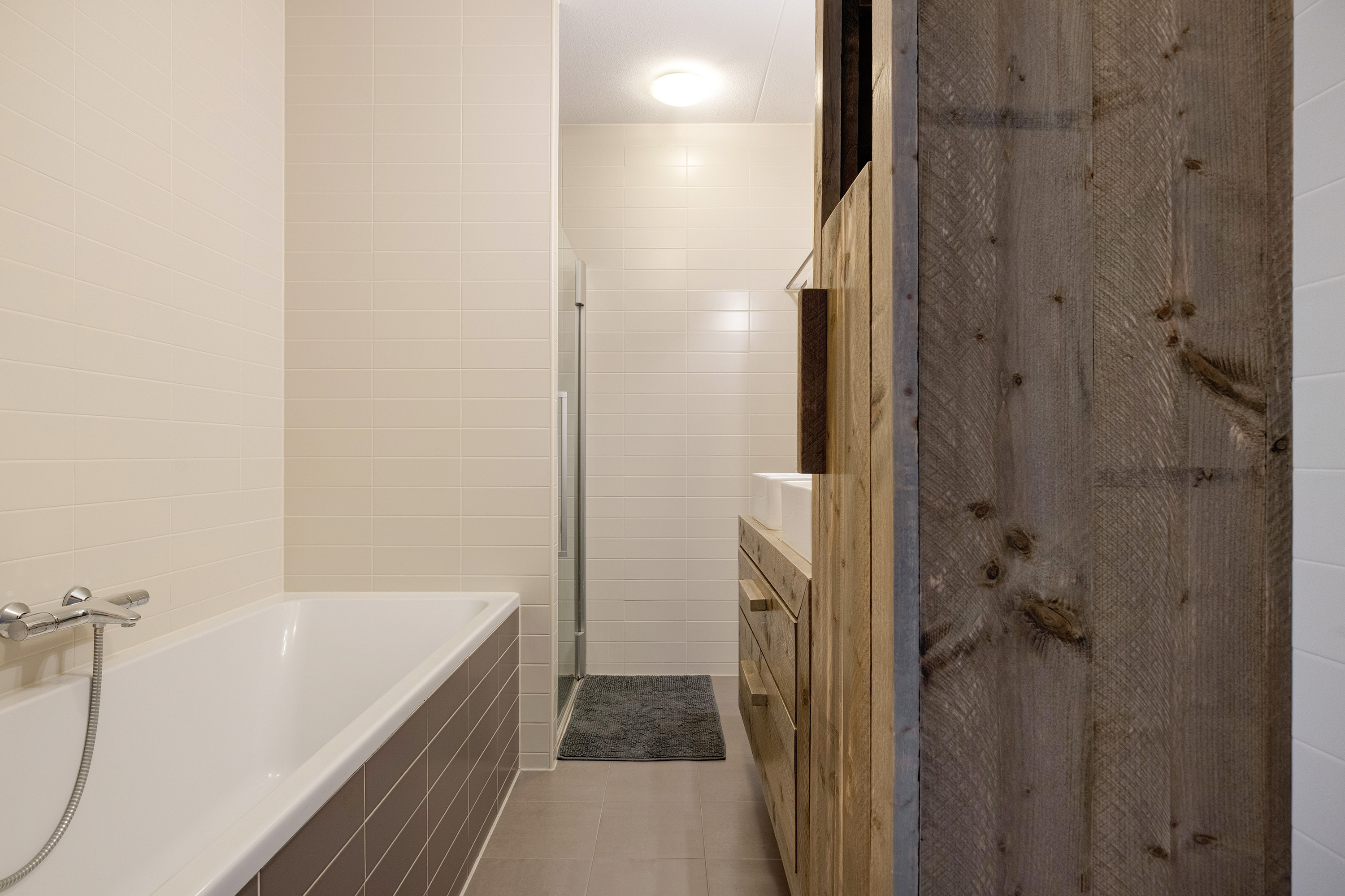 De badkamer is compleet en luxe uitgevoerd met een ligbad, inloopdouche, dubbel houten wastafelmeubel met spiegelkast. Tegelwerk in smaakvolle grijs/witte kleurstelling
