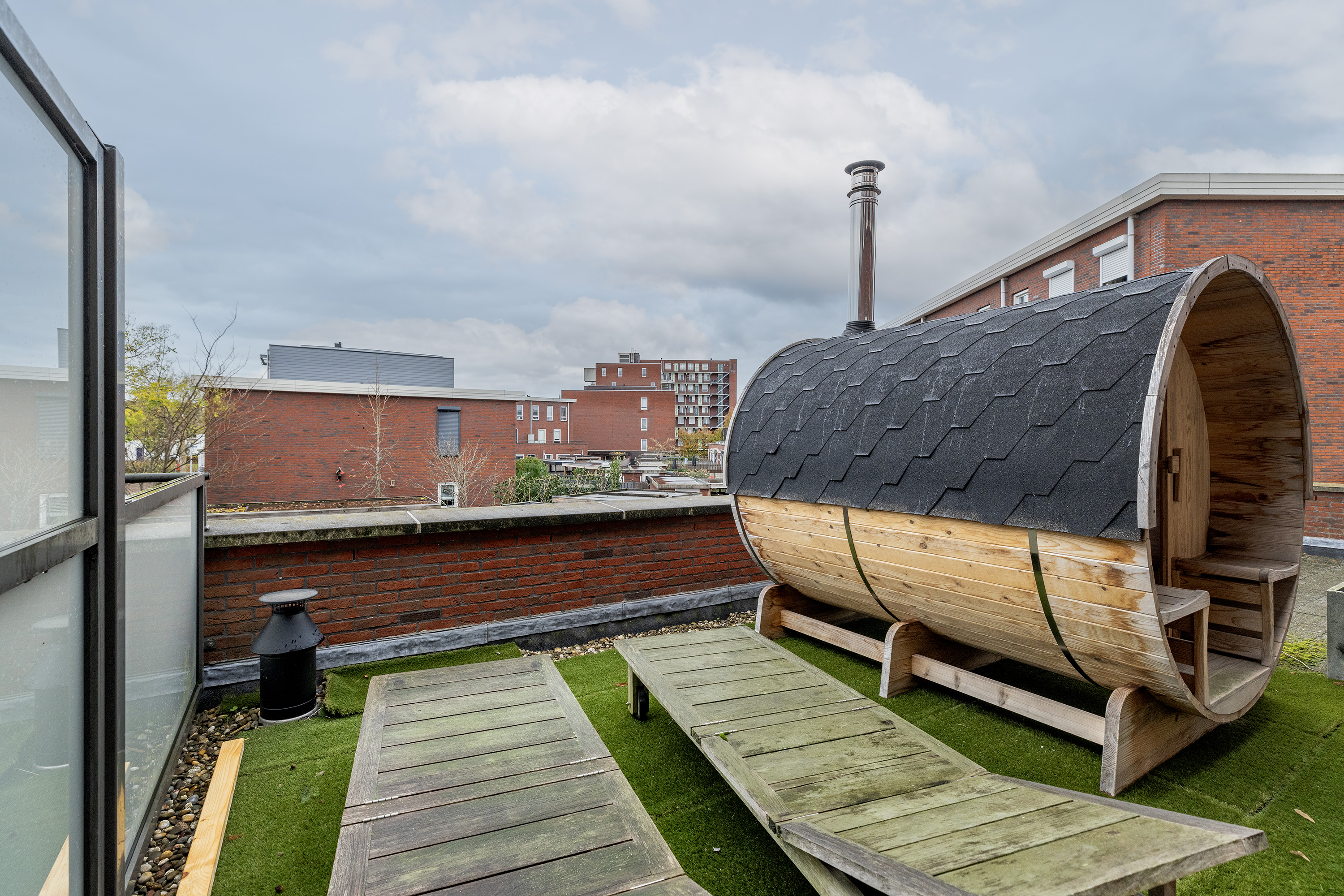 Het grote dakterras vormt een unieke extra leefruimte! Hier bevindt zich een vrijstaande sauna (ter overname) en er is volop ruimte voor ligbedden of een loungeset. Een heerlijke plek voor ontspanning en privacy!