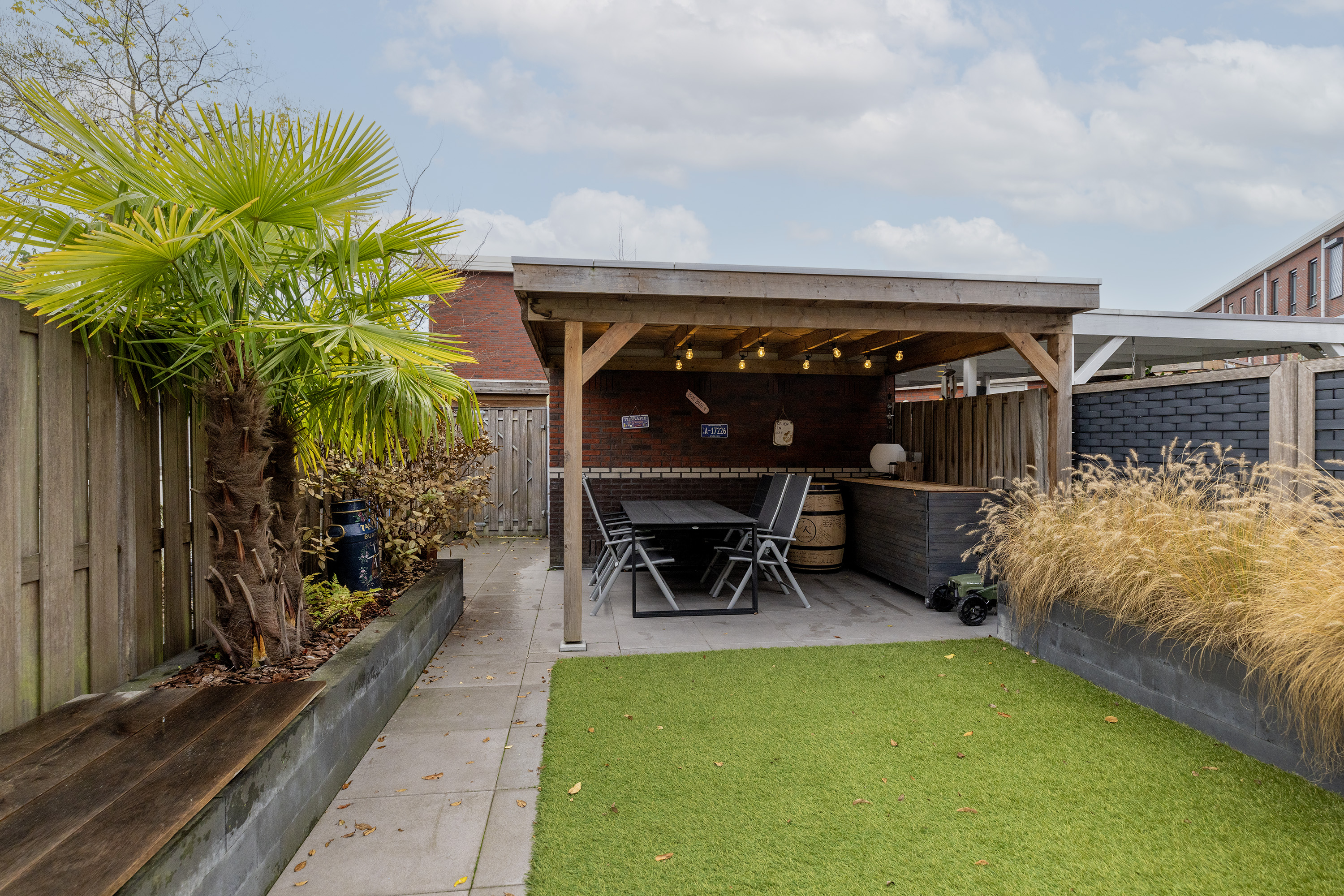 - Fraai aangelegde achtertuin met overkapping en achterom