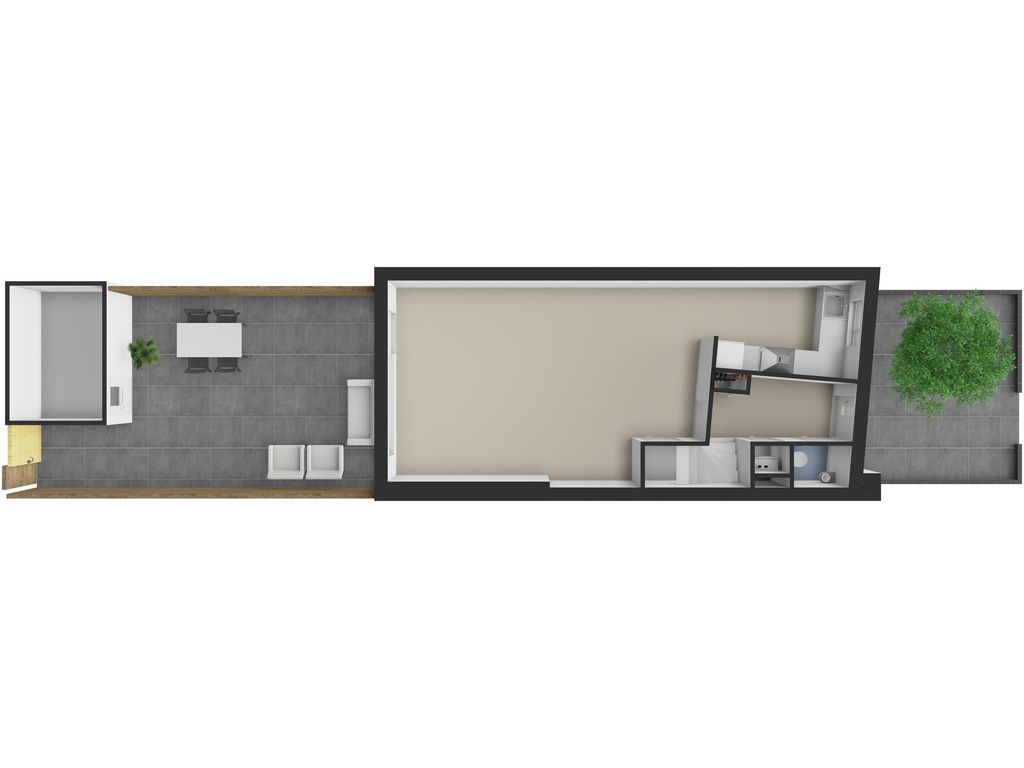 De uitgebouwde woonkamer is een echte leefruimte: een duurzame laminaatvloer met vloerverwarming, glad gestucte wanden en plafonds met inbouwspots en grote raampartijen die zorgen voor veel lichtinval. Via een loopdeur bereik je de tuin.