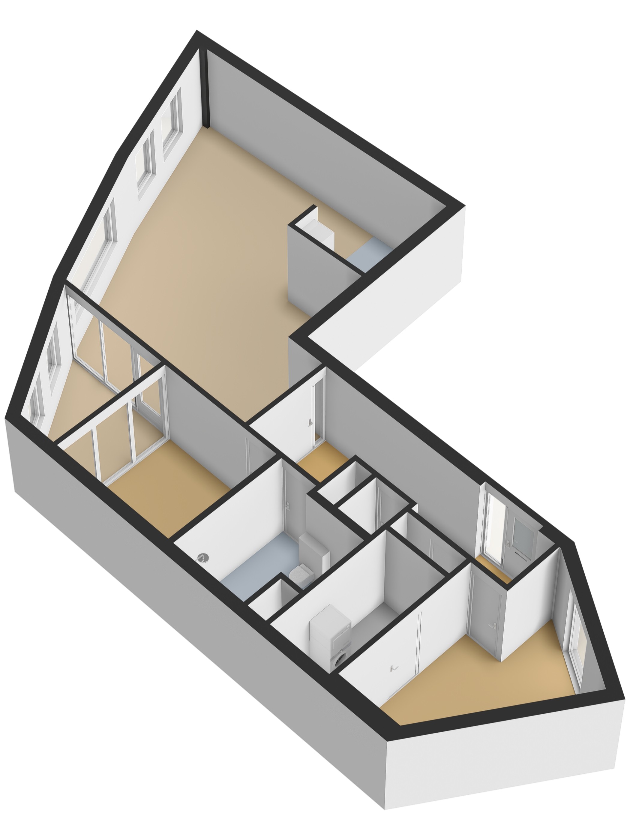 Daar komen we aan op de galerij en stappen via de laatste voordeur in de hoek de hal binnen.