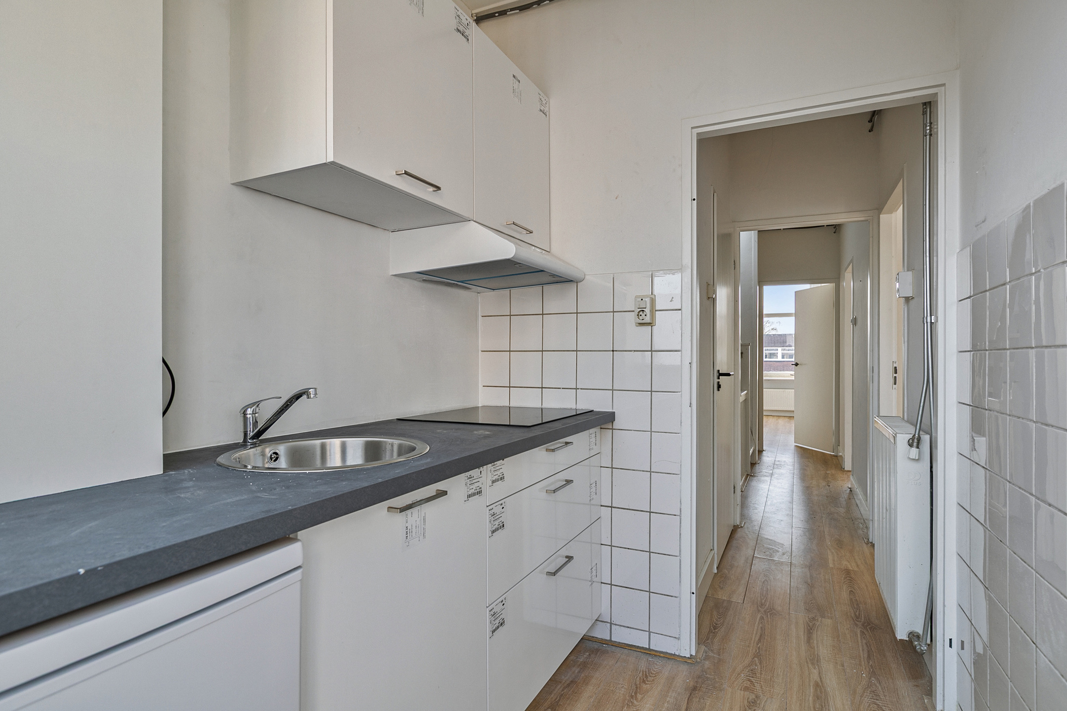 De keuken (ca. 4 m²) is gelegen aan de achterzijde en heeft toegang tot het balkon. De witte keuken is uitgevoerd in een rechte opstelling met een 4 pits inductie kookplaat met afzuigkap, een vrijstaande koelkast en een grijs kunststof aanrechtblad.