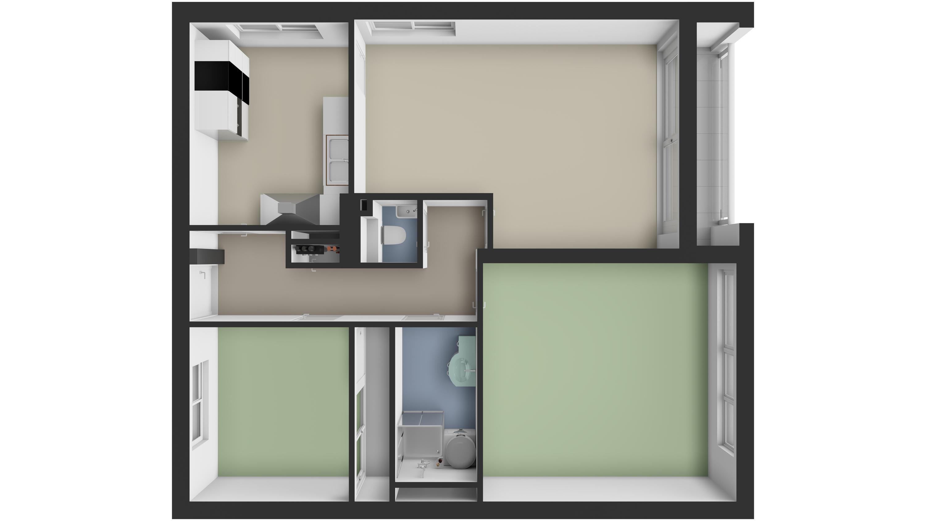 Tussen de slaapkamers bevindt zich de badkamer die is voorzien van een douche, wastafel met wastafelmeubel en de aansluiting voor de wasmachine.