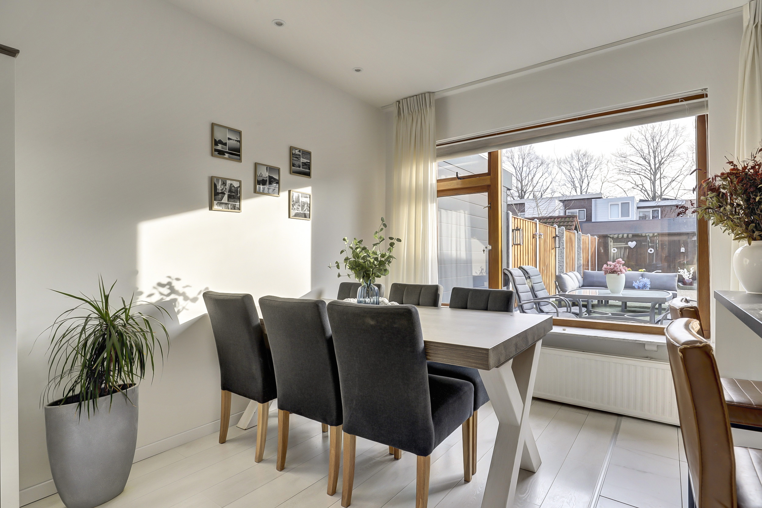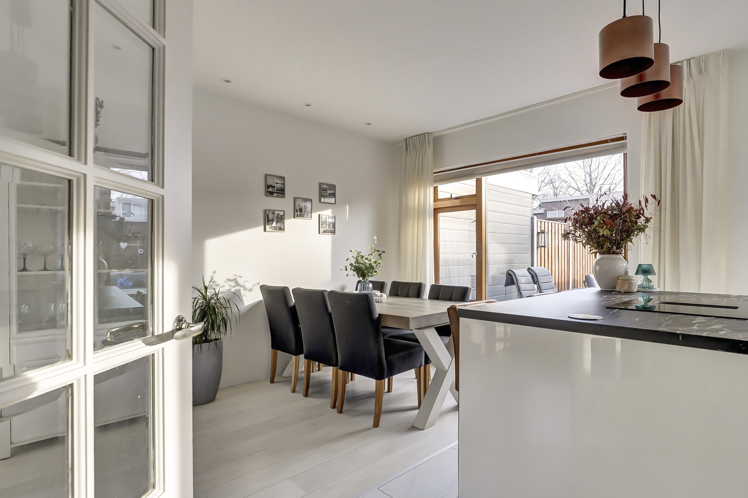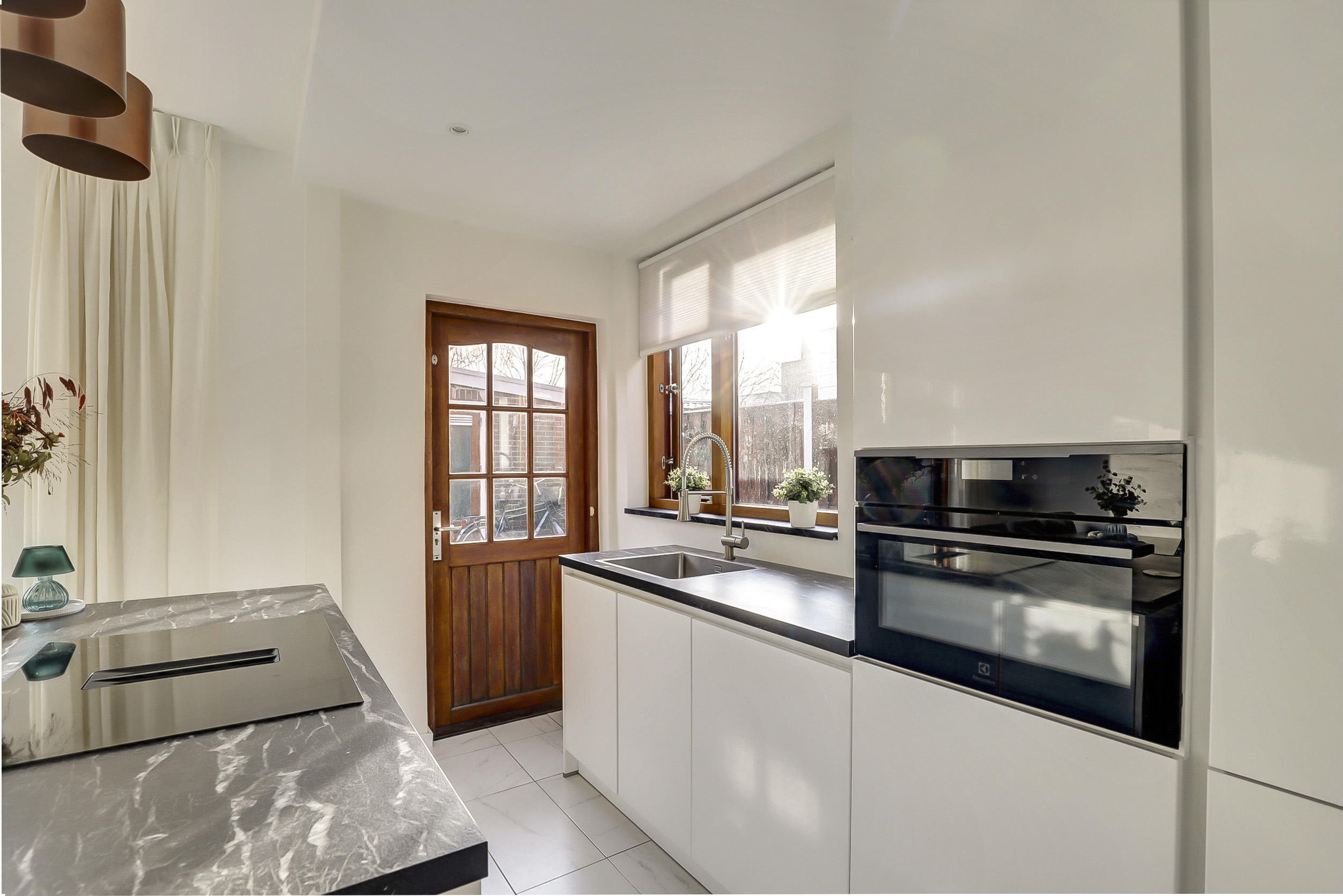 De woonkamer profiteert van veel natuurlijk licht dankzij de grote raampartijen. Ook de keuken beschikt over een zijraam, wat het geheel extra licht en ruimtelijk maakt. Aan de achterzijde is over de volledige breedte van de woning een elektrische zonwering geplaatst, wat bijdraagt aan comfort tijdens zonnige dagen. De keuken is voorzien van witte vloertegels met marmerlook en lichte grijstinten, wat mooi aansluit bij het moderne karakter van de ruimte.