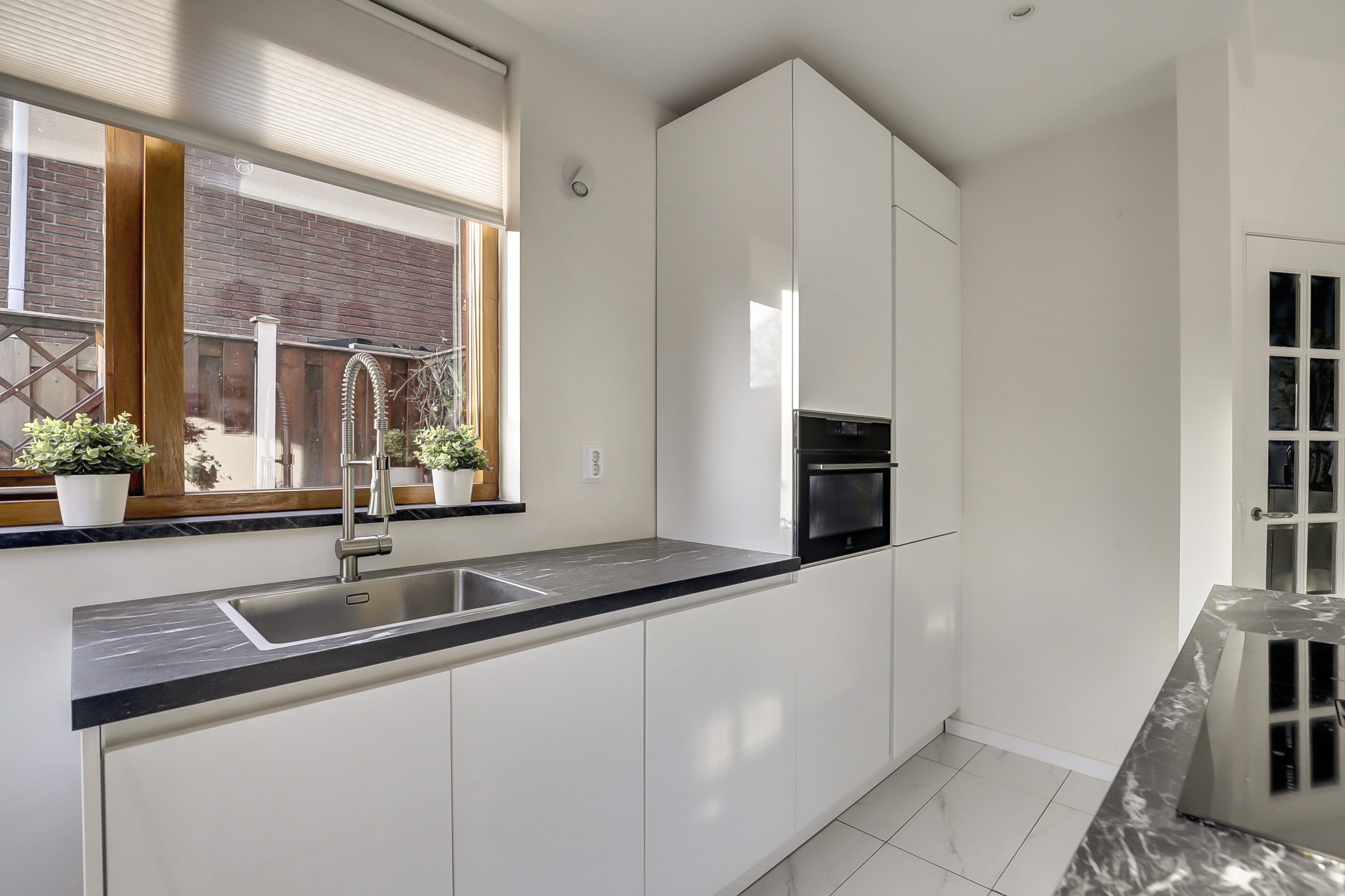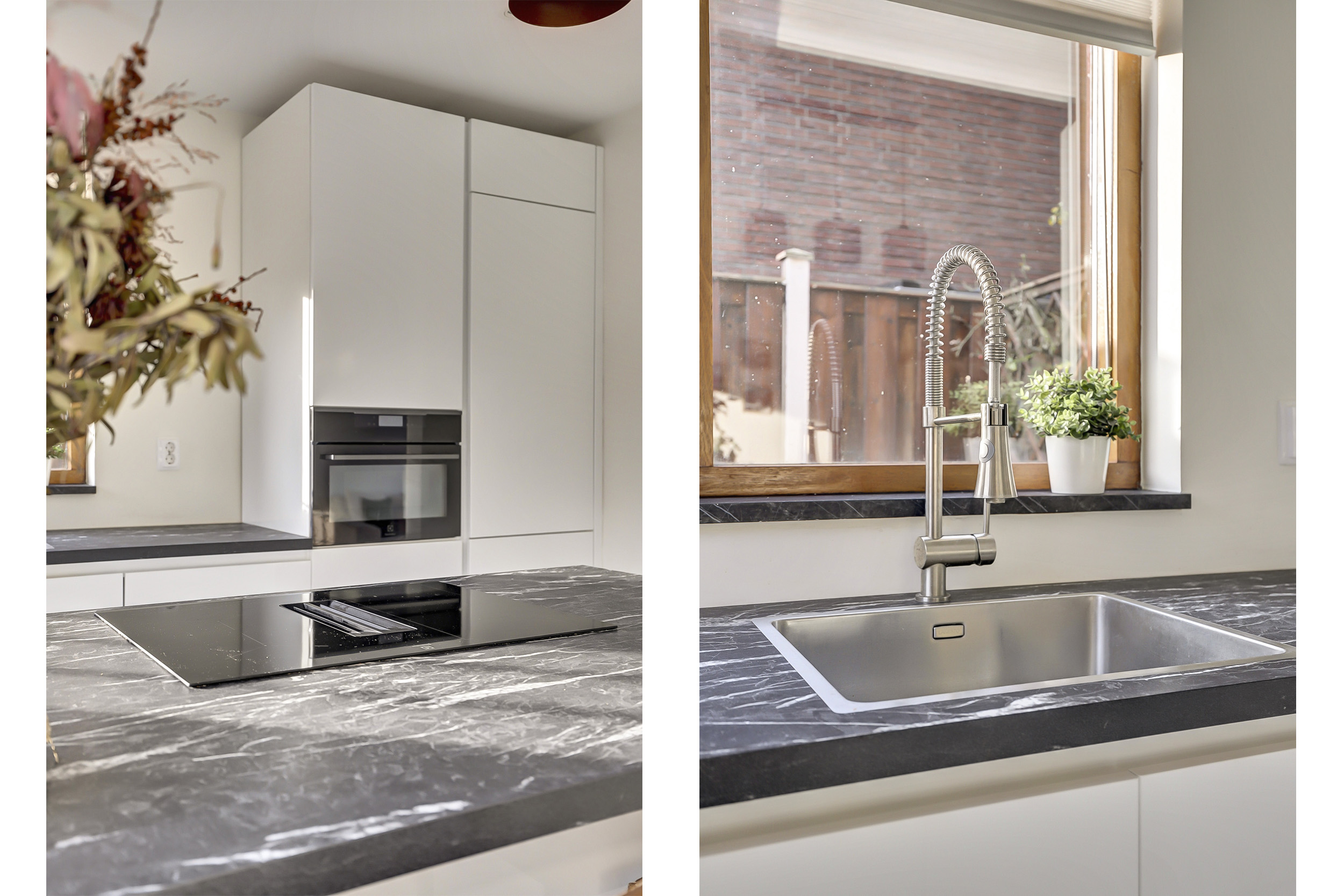 De open keuken is in 2023 vernieuwd en uitgevoerd met witte keukenkasten en een antracietkleurig werkblad met marmerlook en witte adering. De keuken biedt voldoende bergruimte voor keukengerei en voorraad, wat het dagelijks gebruik prettig maakt.