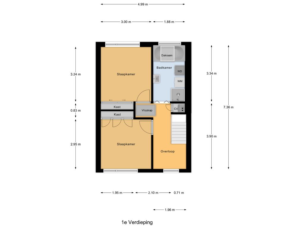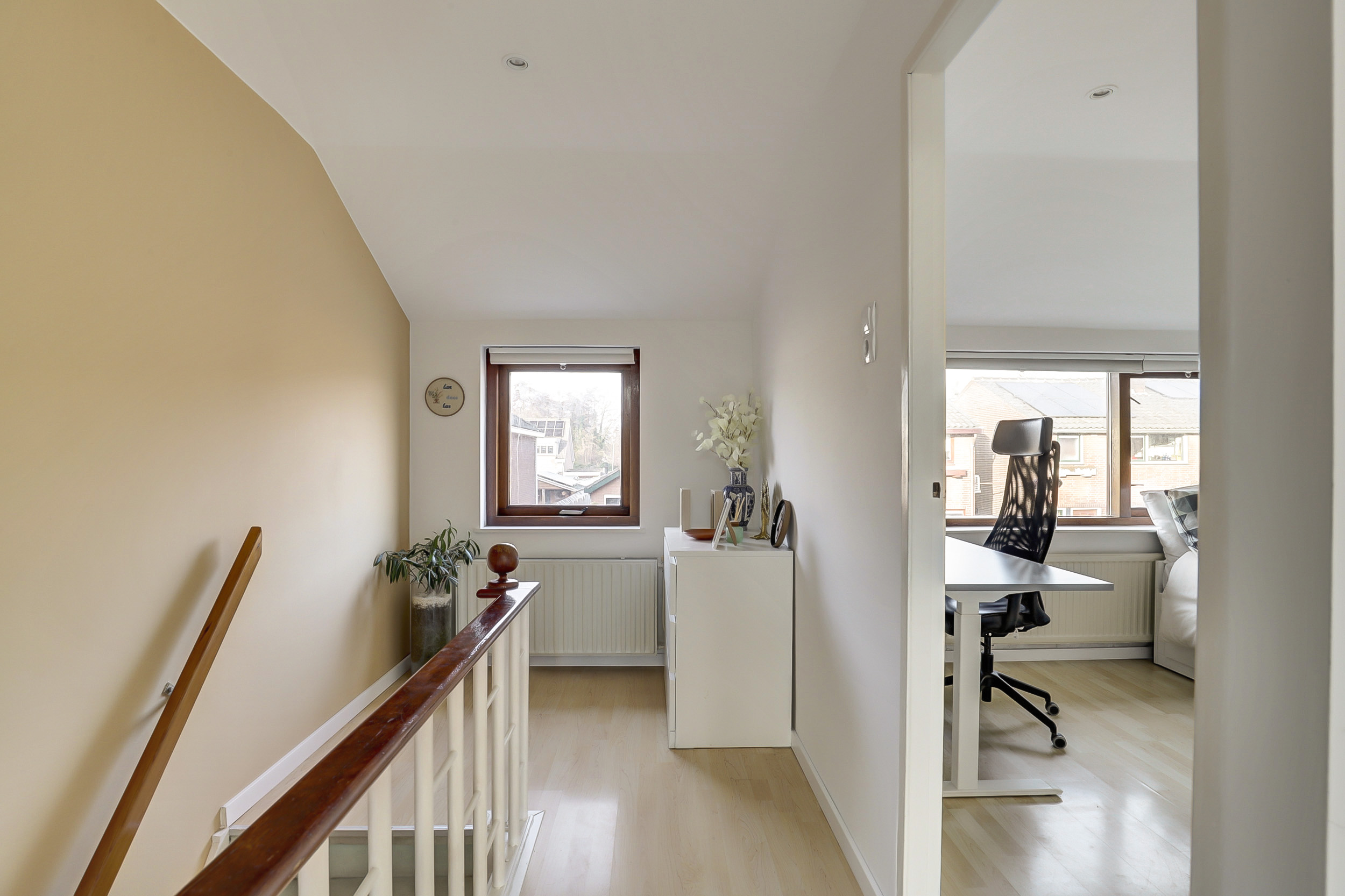 Via de trap in de hal bereikt u de eerste verdieping, waar zich twee slaapkamers en de badkamer bevinden. Boven aan de trap komt u op een overloop met ruimte voor een kleine kast. Dankzij het aanwezige raam valt hier prettig daglicht binnen, wat zorgt voor een lichte en aangename uitstraling.