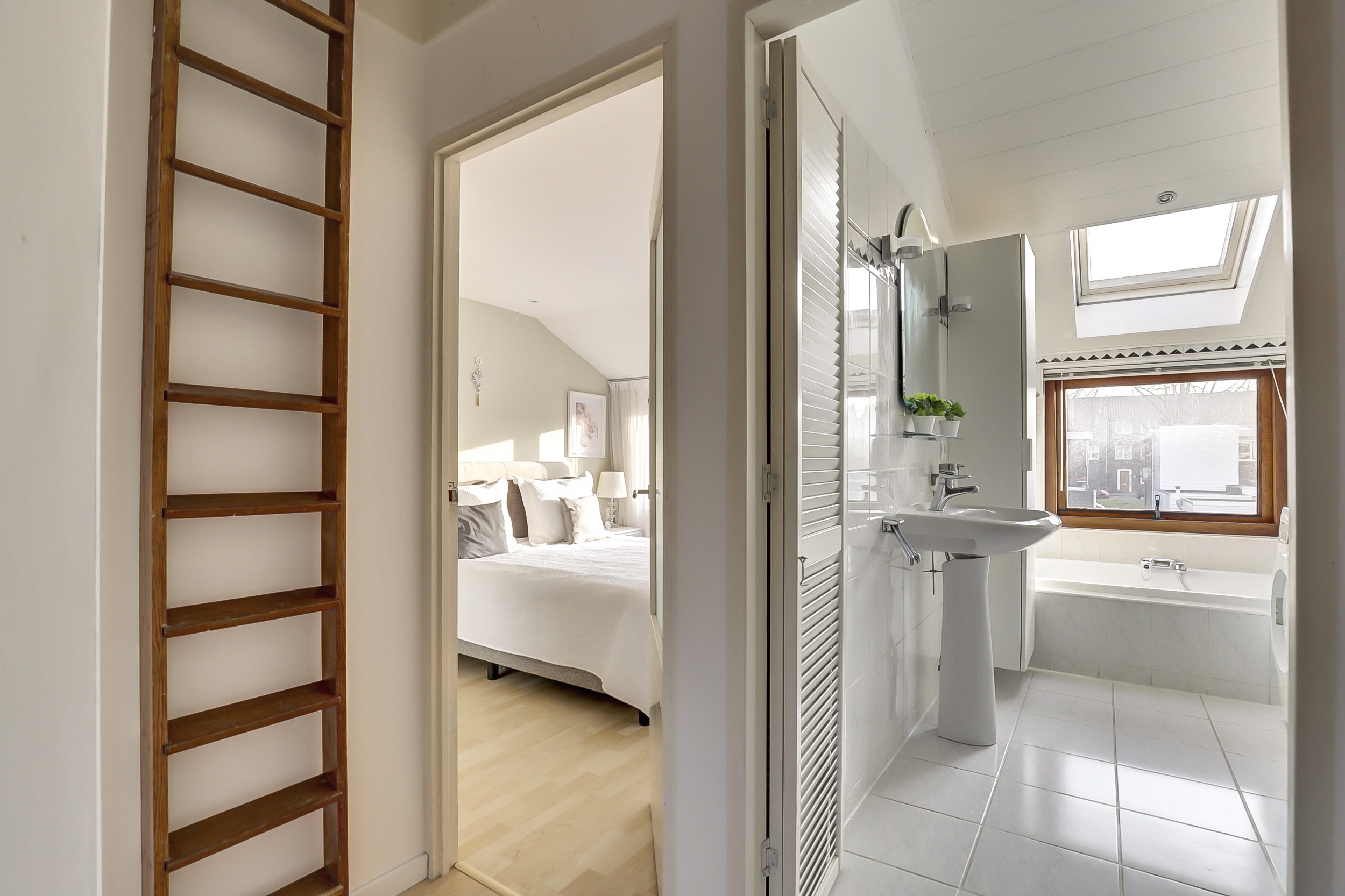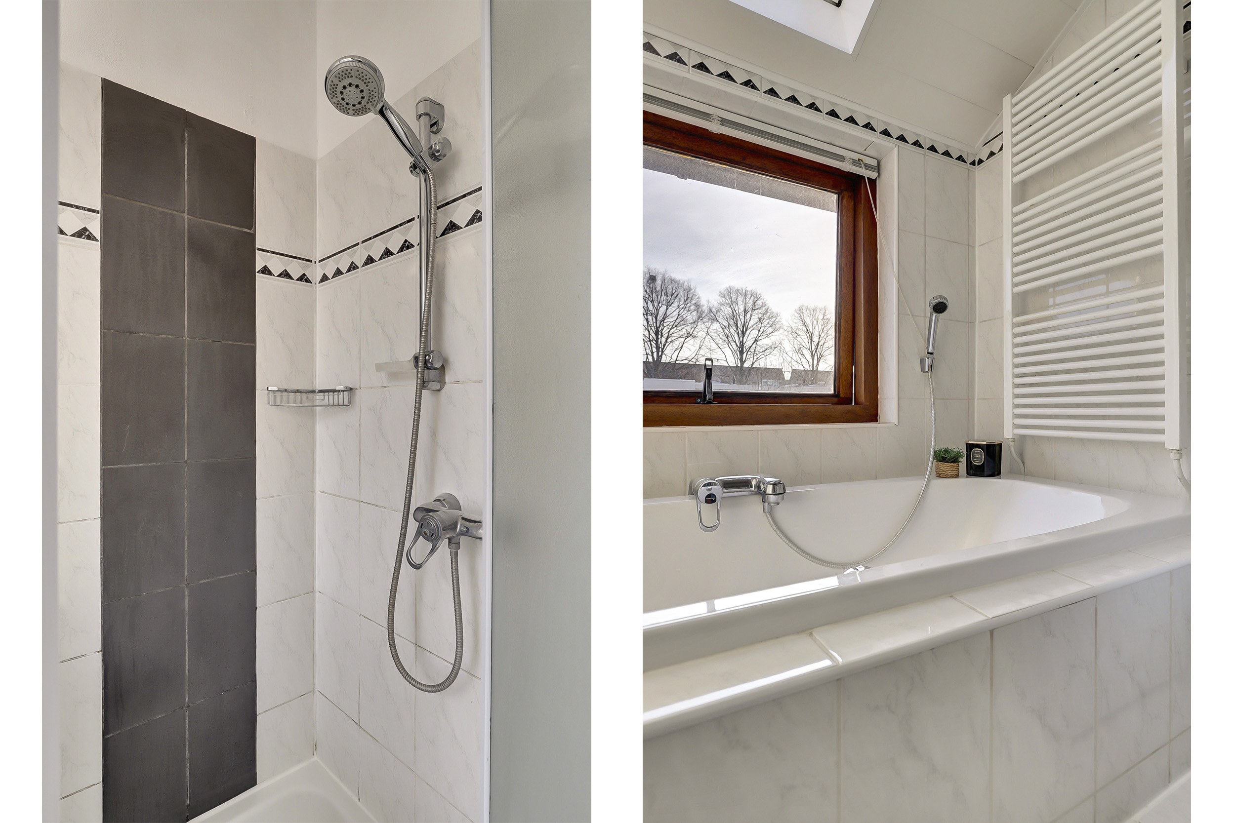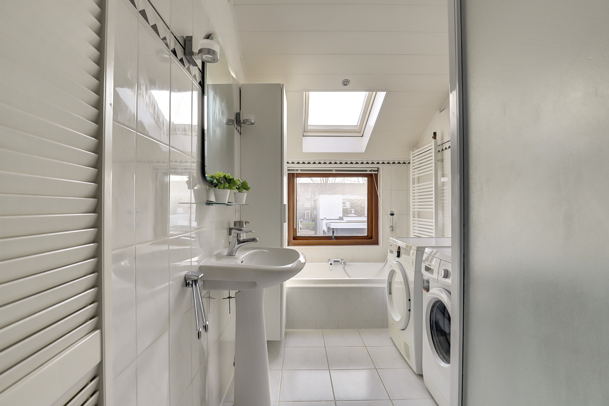 De badkamer is volledig betegeld met witte tegels, afgewerkt met een decoratieve sierrand. De ruimte beschikt over zowel een raam als een dakraam, waardoor er veel natuurlijk licht en ventilatiemogelijkheden aanwezig zijn. Verder is de badkamer voorzien van een wastafel, een ligbad en een aparte douchecabine. Daarnaast zijn hier de aansluitingen voor de wasmachine en droger te vinden.